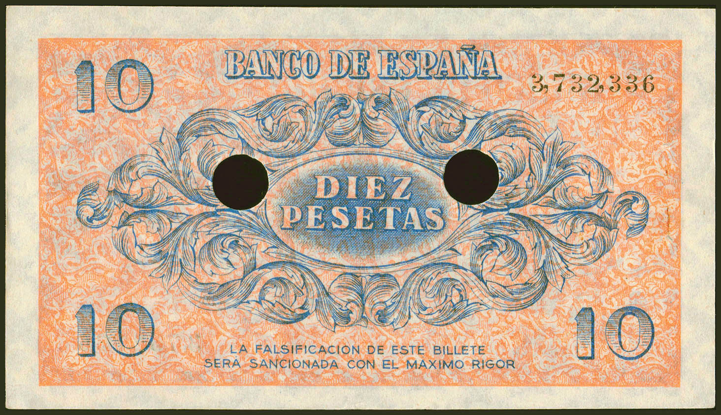 10 Pesetas. 21 de Noviembre de 1936. Sucursal de Burgos. Taladrado (doble) con numeración y sin serie. (Edifil 2021: 418T). Raro, puntitos de grapa sin ninguna importancia, como todos los conocidos. SC-.