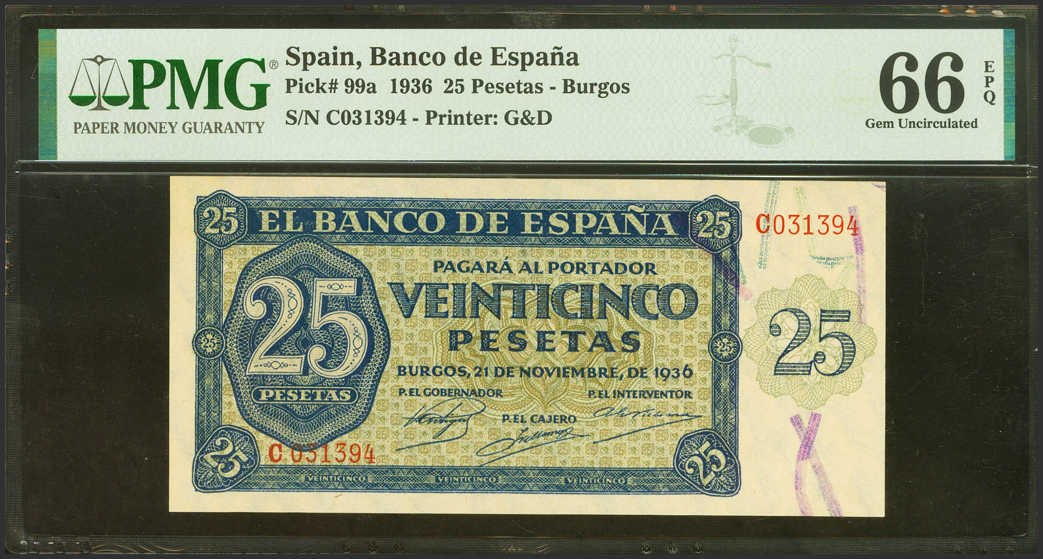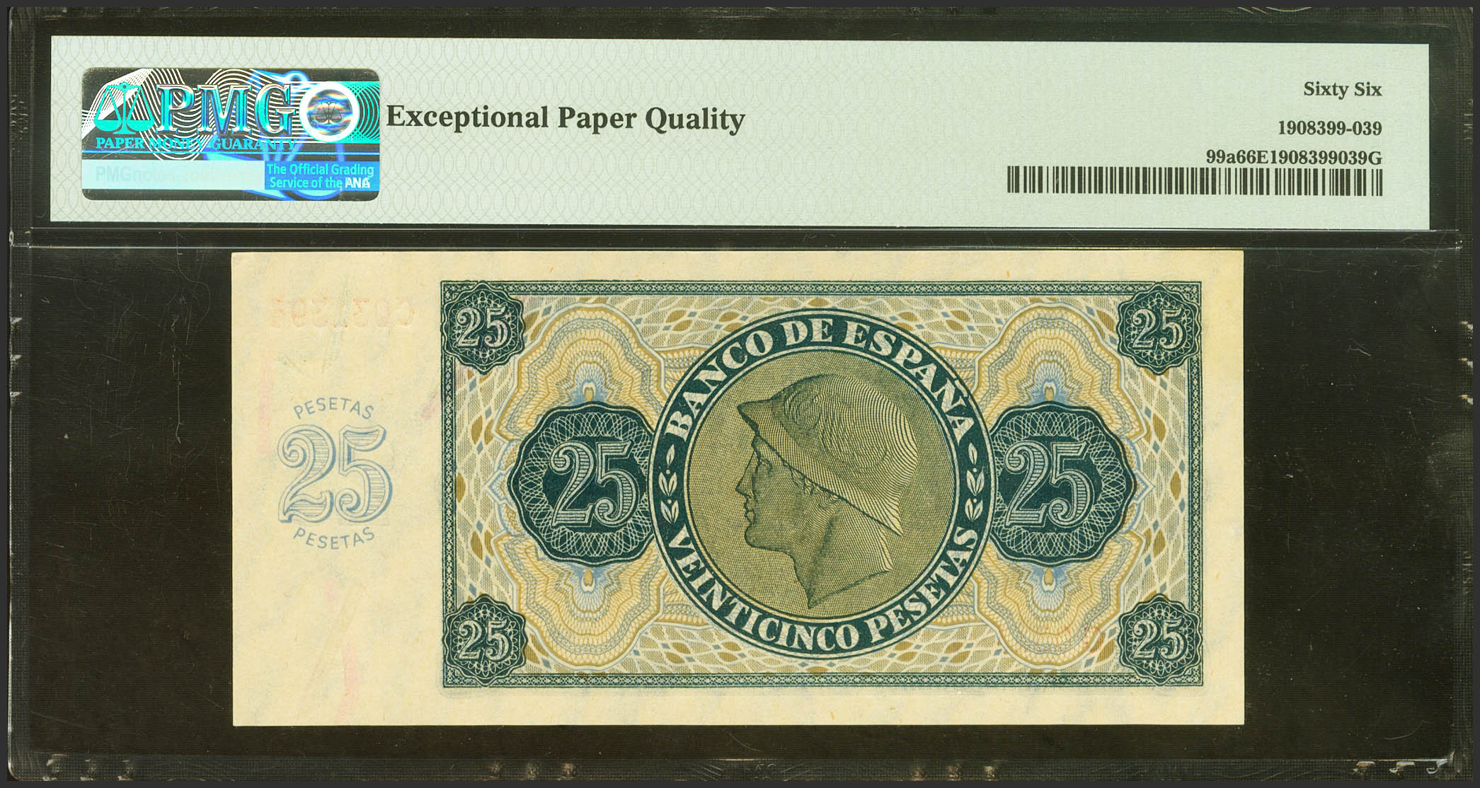 25 Pesetas. 21 de Noviembre de 1936. Serie C. (Edifil 2023: 419a, Pick: 99a). Inusual en esta excepcional calidad, apresto original. Encapsulado PMG66EPQ.