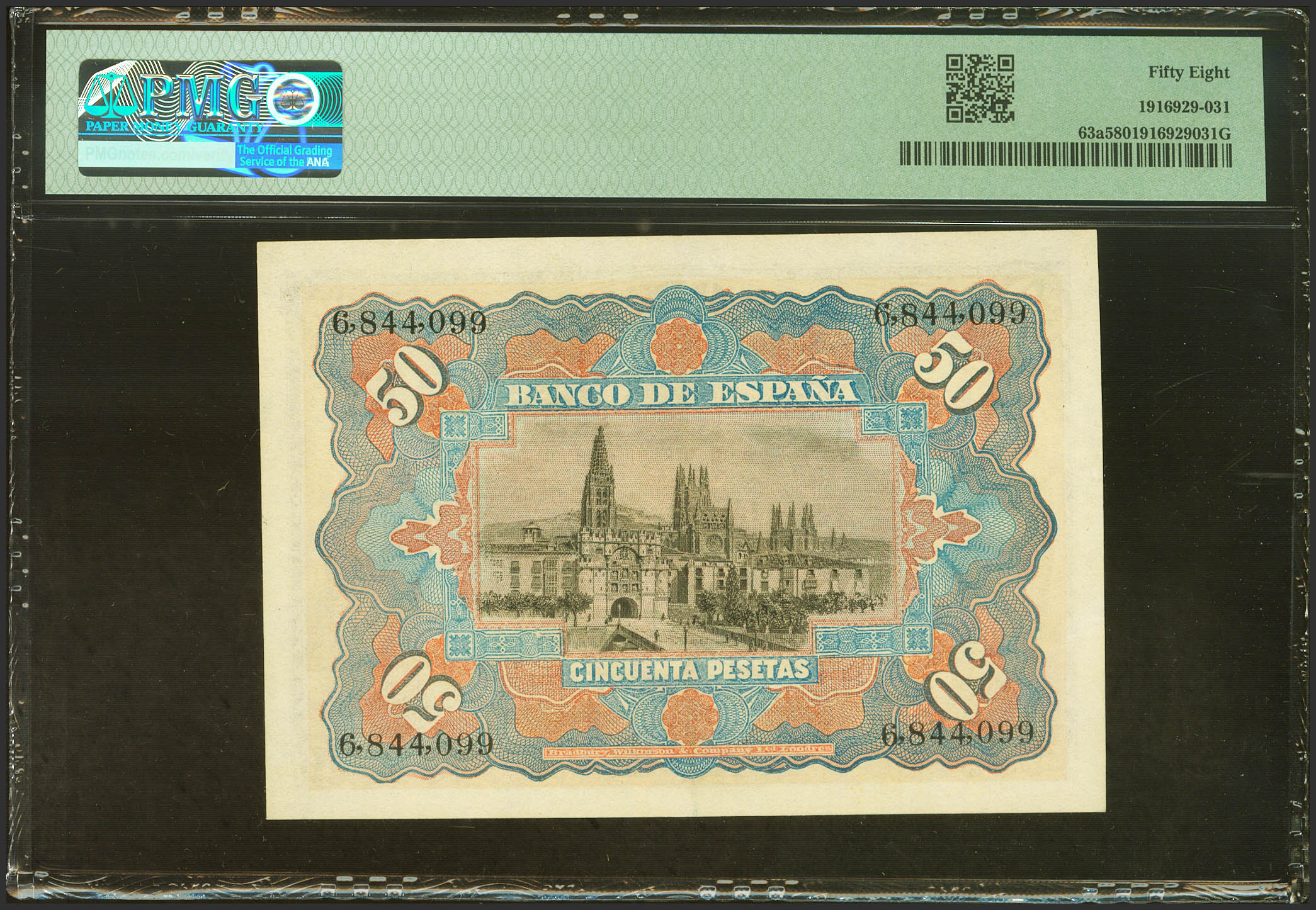 50 Pesetas. 15 de Julio de 1907. Sin serie. (Edifil 2023: 319, Pick: 63a). Raro en esta calidad. EBC++. Encapsulado PMG58. (para hacernos idea de la rareza, a fecha 1 de Febrero de 2024, este billete es el cuarto mejor calificado junto a otros ocho billetes en PMG)