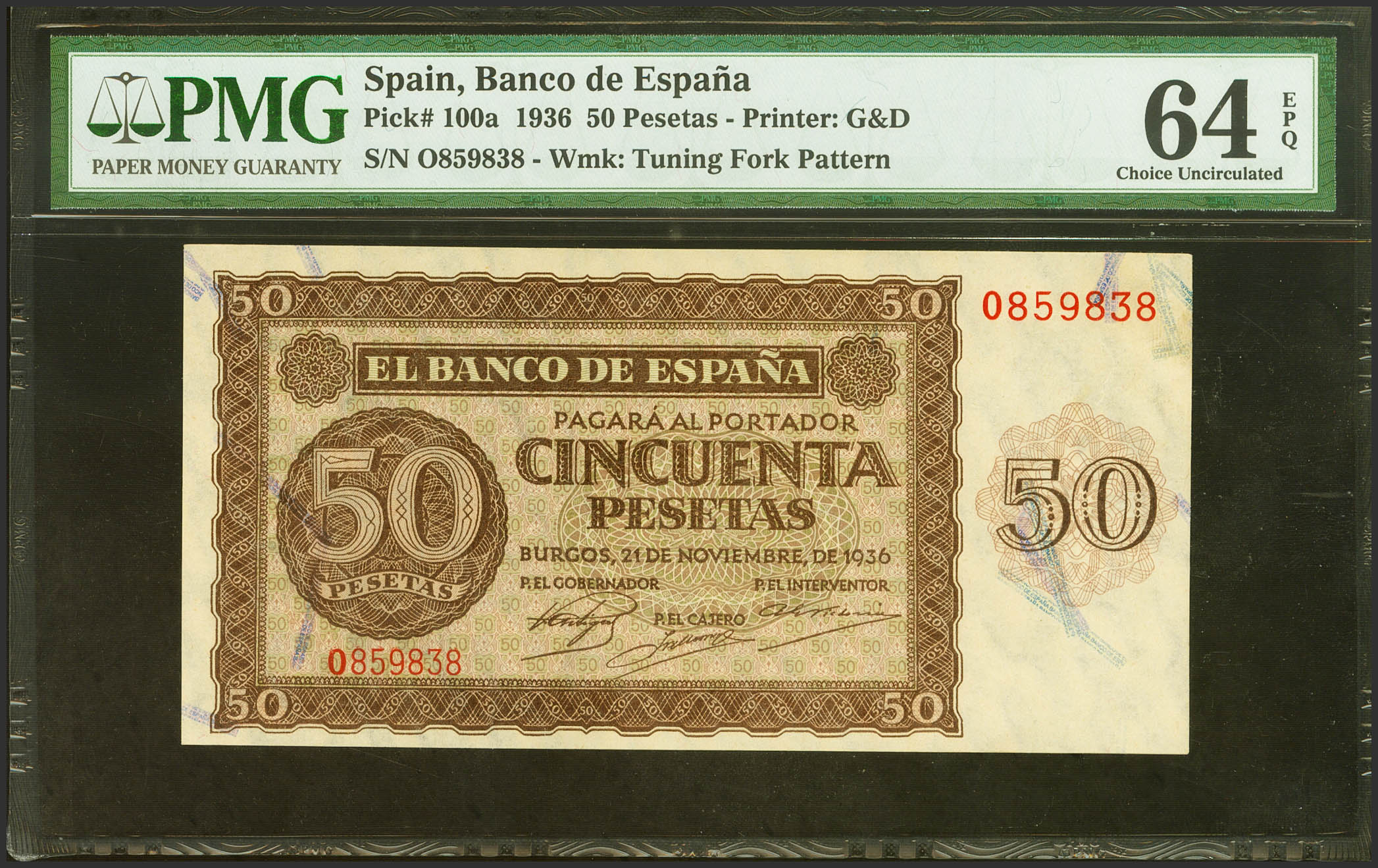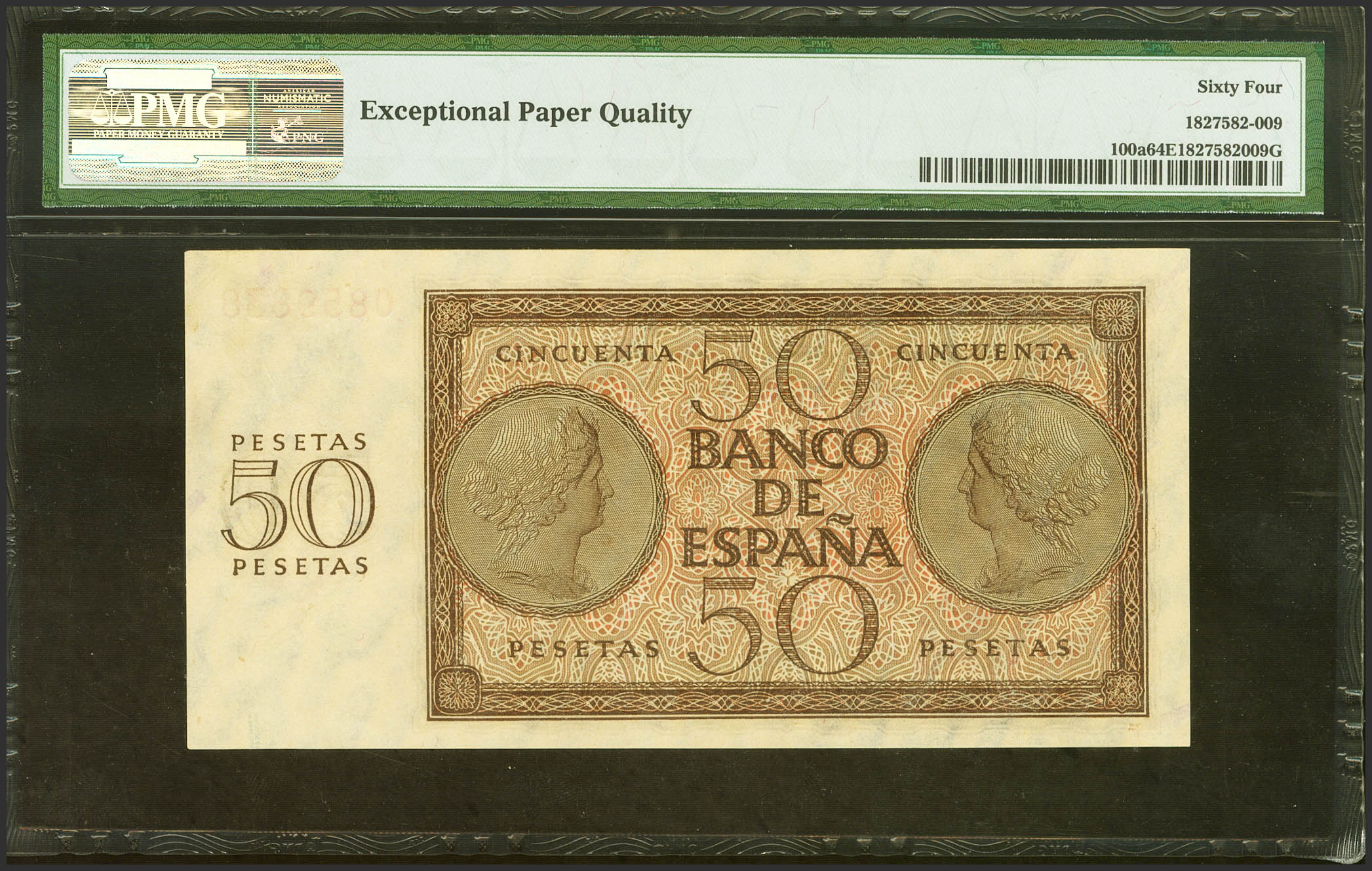 50 Pesetas. 21 de Noviembre de 1936. Serie O. (Edifil 2021: 420a). Inusual en esta excepcional calidad, apresto original. SC. Encapsulado PMG64EPQ.