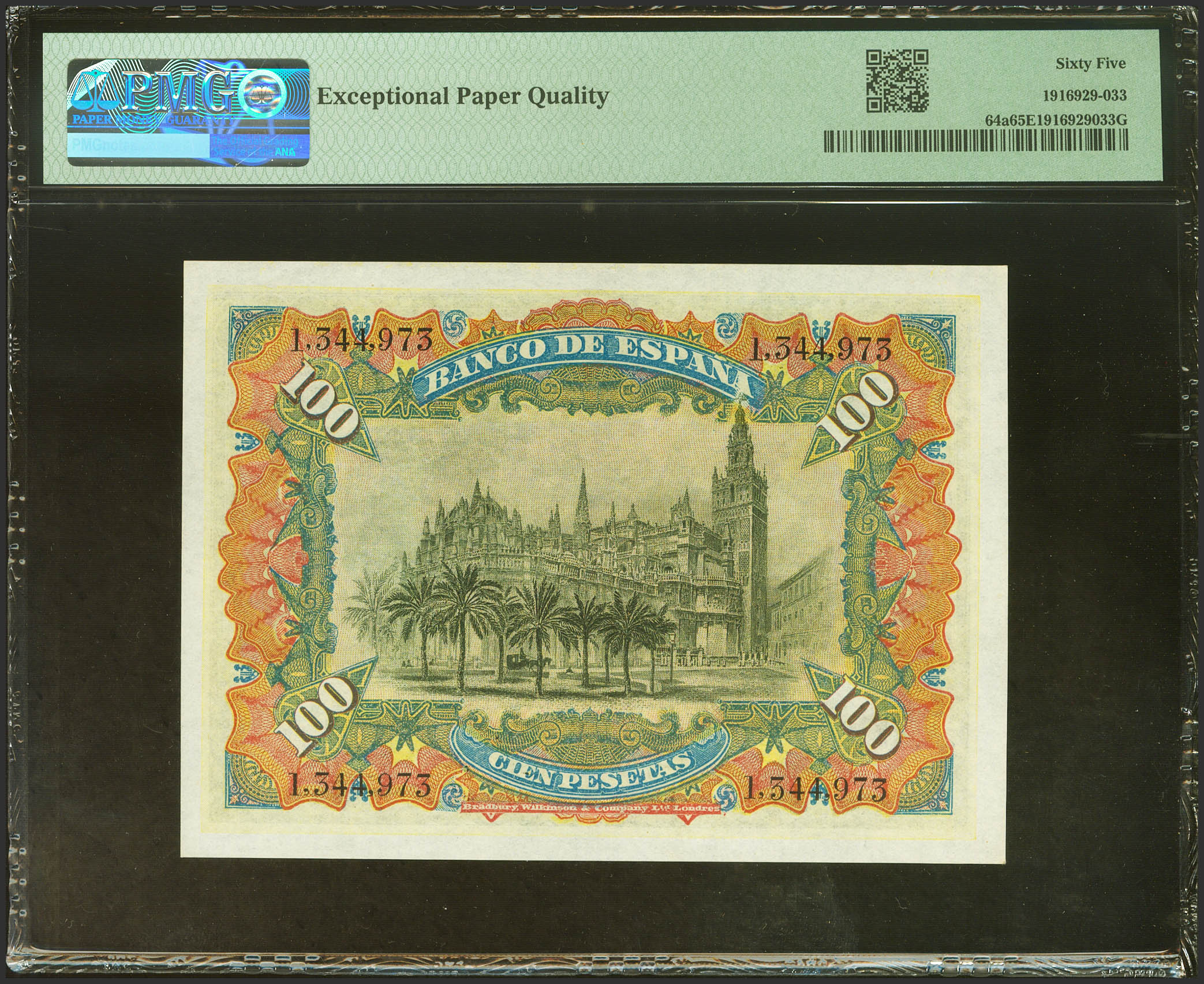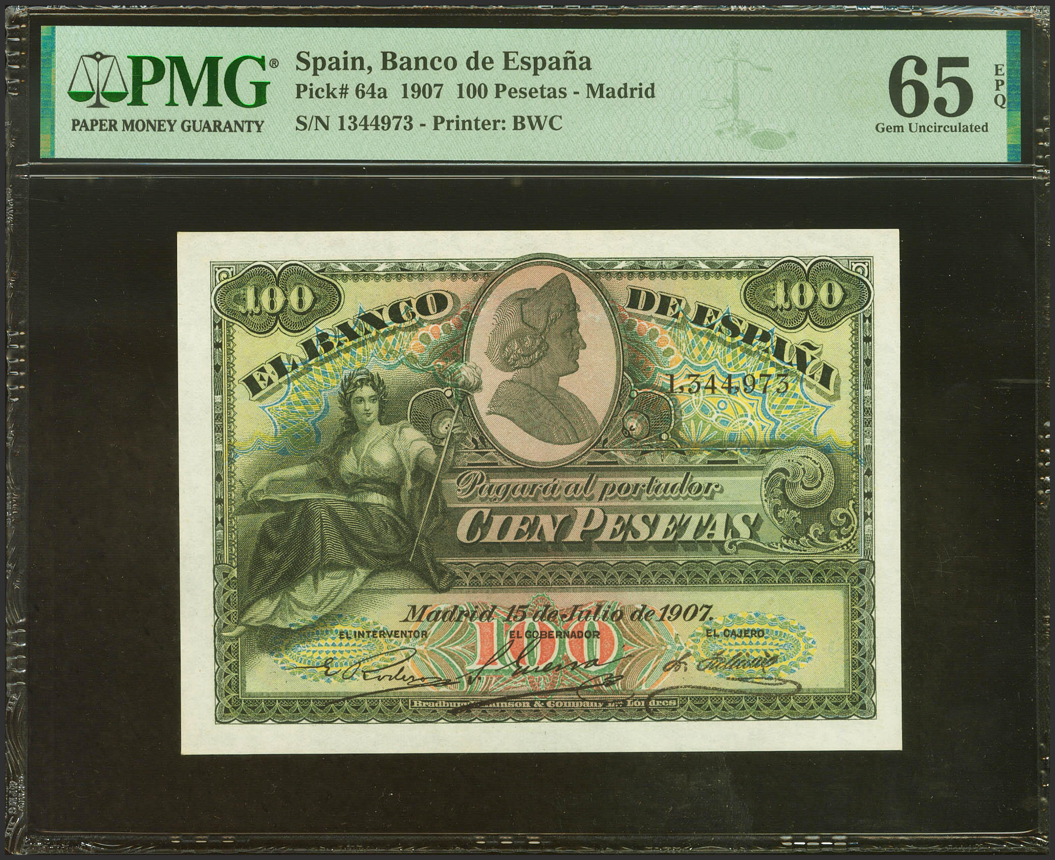 100 Pesetas. 15 de Julio de 1907. Sin serie. (Edifil 2023: 320, Pick: 64a). Extraordinariamente raro, especialmente en esta calidad, apresto original. SC. Encapsulado PMG65EPQ. (para hacernos una idea de la rareza, a fecha 1 de Febrero de 2024, este billete es el mejor graduado junto a otros tres ejemplares en PMG)