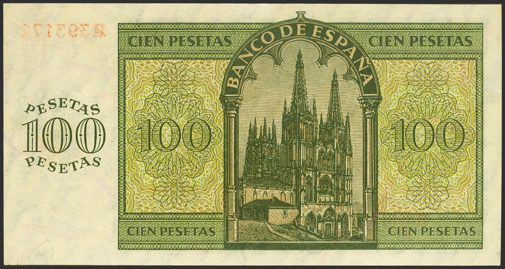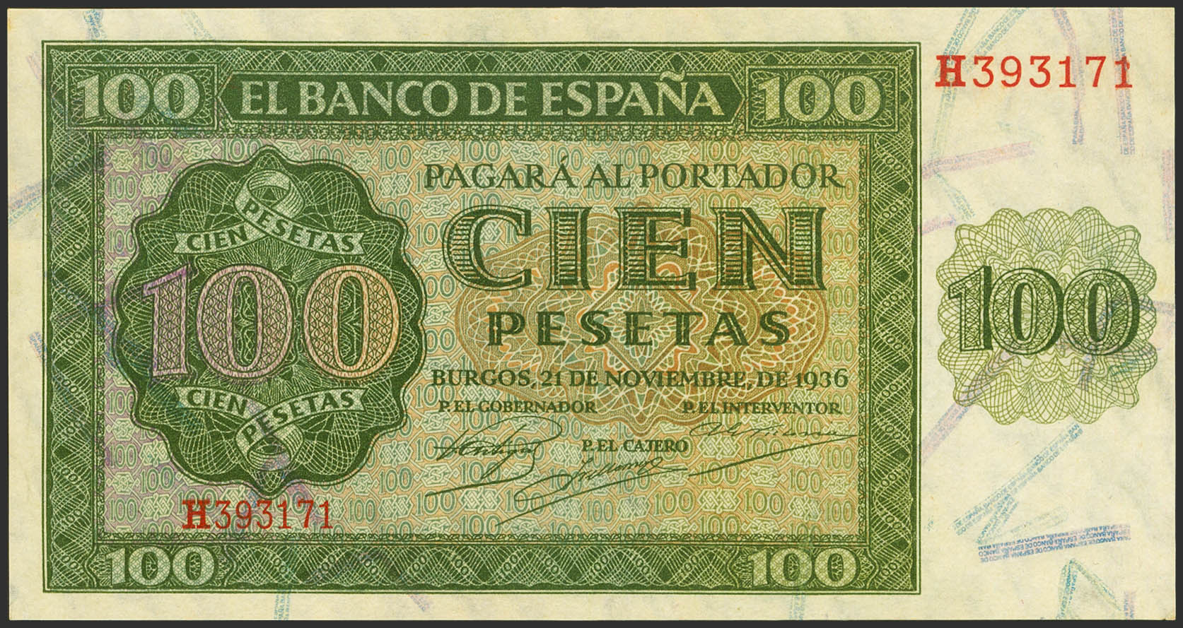 100 Pesetas. 21 de Noviembre de 1936. Serie H. (Edifil 2021: 421a). Conserva gran parte de su apresto original. EBC+.