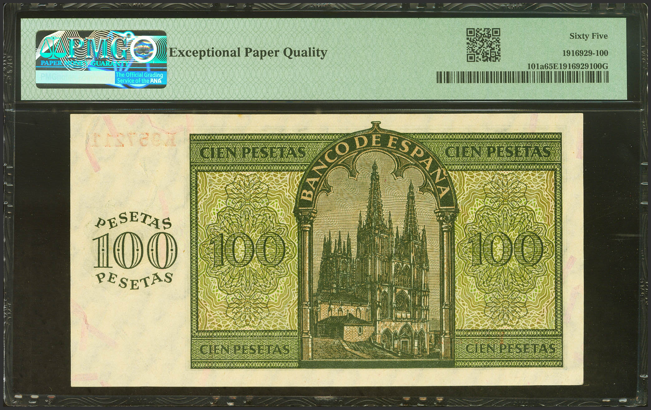 100 Pesetas. 21 de Noviembre de 1936. Serie K. (Edifil 2023: 421a, Pick: 101a). Inusual en esta calidad, apresto original. SC. Encapsulado PMG65EPQ.
