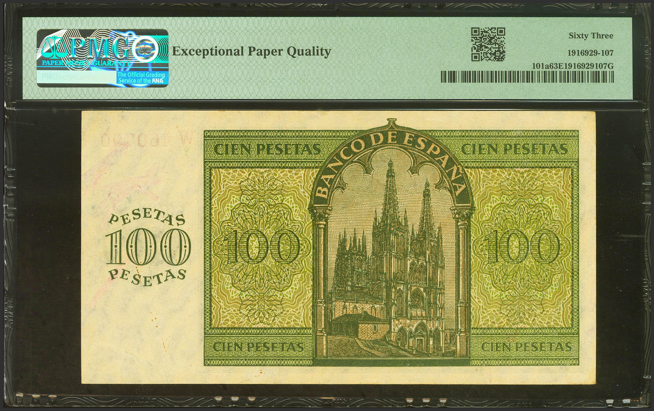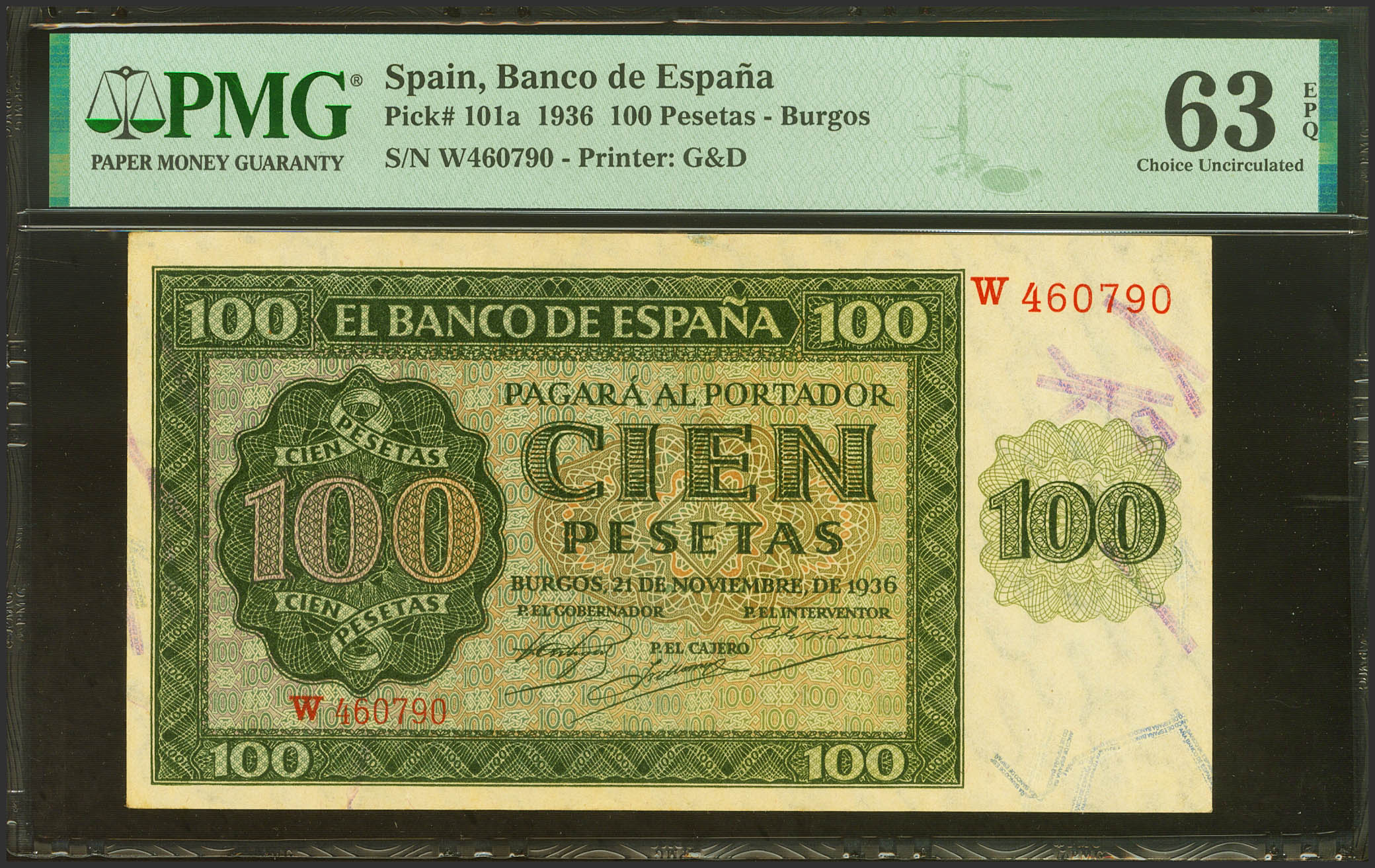 100 Pesetas. 21 de Noviembre de 1936. Serie W. (Edifil 2023: 421a, Pick: 101a). Apresto original. SC. Encapsulado PMG63EPQ.