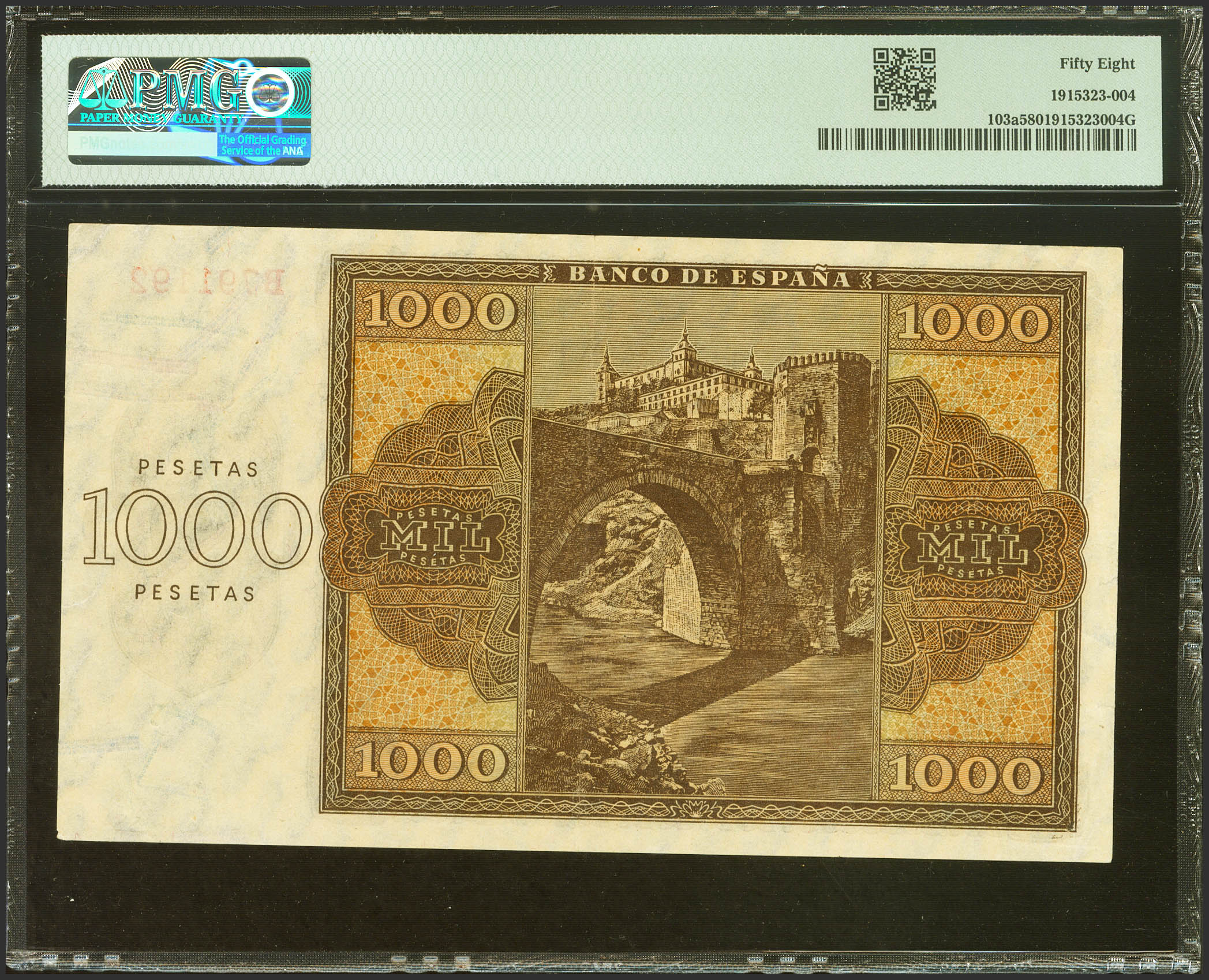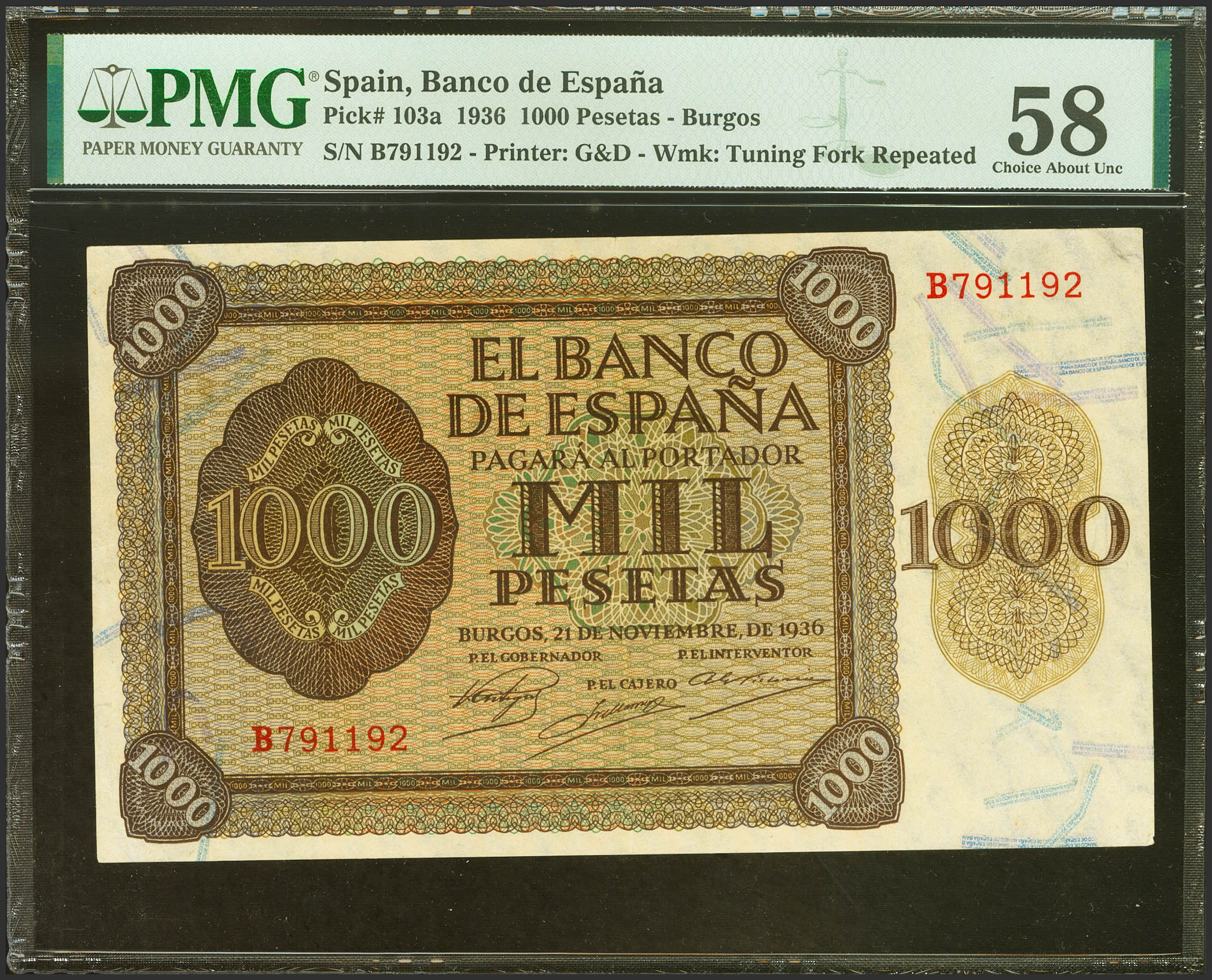 1000 Pesetas. 21 de Noviembre de 1936. Serie B. (Edifil 2023: 423a, Pick: 103a). Muy raro en esta calidad. EBC++. Encapsulado PMG58.