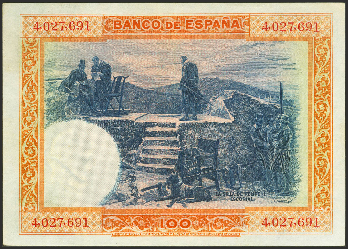 100 Pesetas. 1 de Julio de 1925. Sin serie. (Edifil 2023: 323). Raro, especialmente conservando parte de su apresto original. EBC.