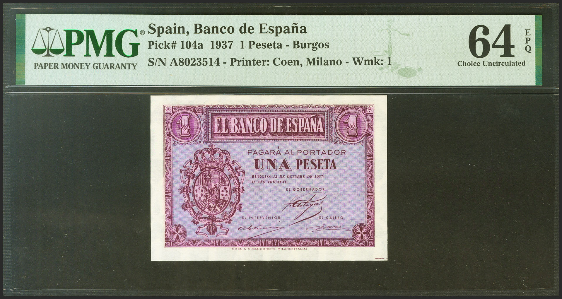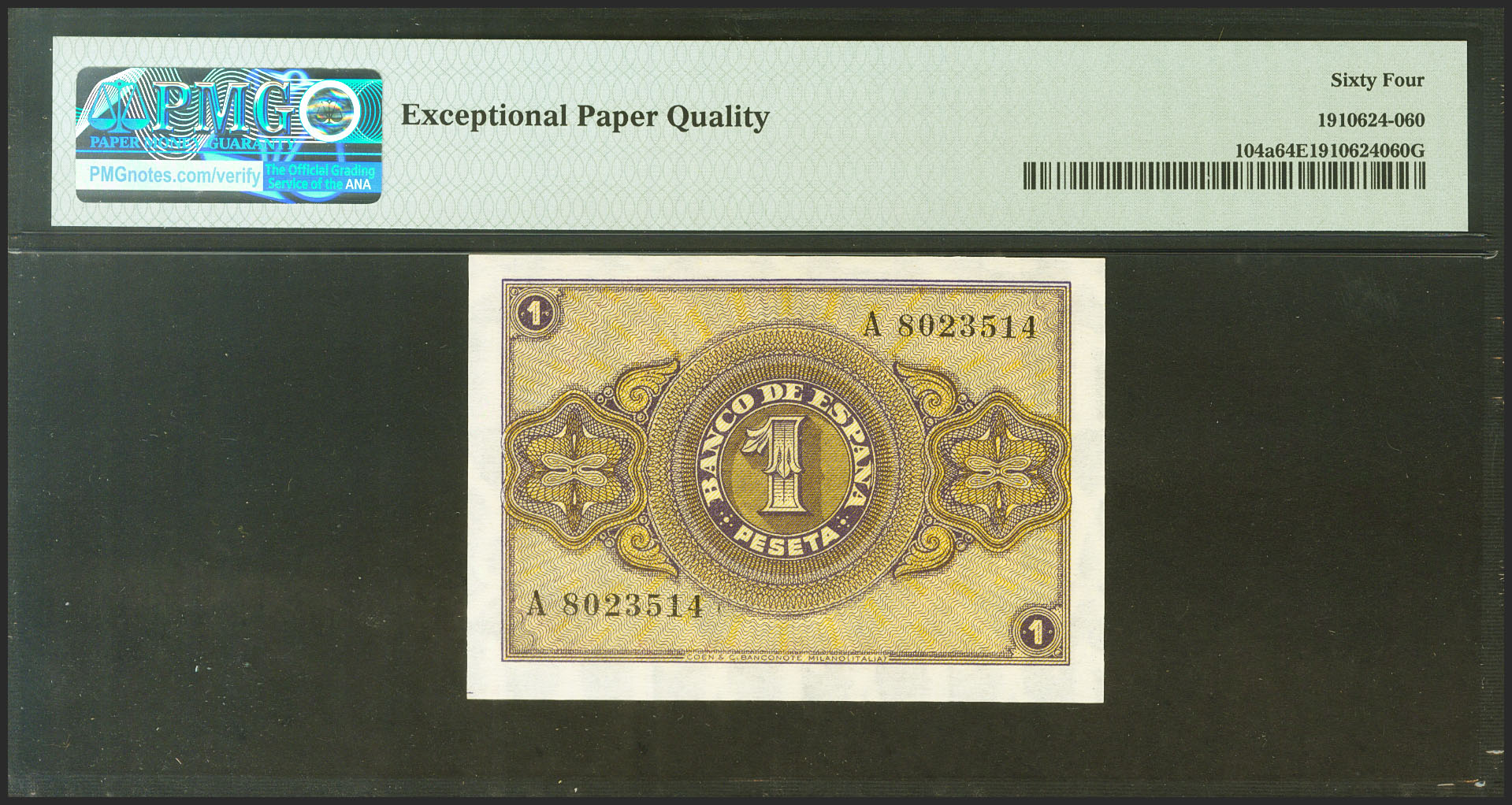 1 Peseta. 12 de Octubre de 1937. Serie A. (Edifil 2021: 425, Pick: 104a). Inusual en esta excepcional calidad, apresto original. SC. Encapsulado PMG64EPQ.