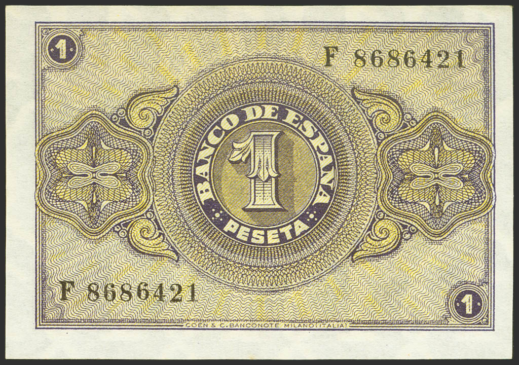 1 Peseta. 12 de Octubre de 1937. Serie F, última serie emitida. (Edifil 2023: 425b). Conserva todo su apresto original. SC.