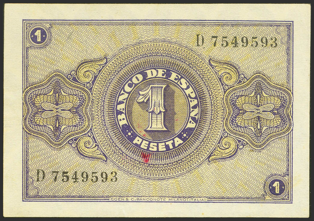 1 Peseta. 30 de Abril de 1938. Serie D. (Edifil 2023: 428a). Apresto original, presenta ligera señal de tinta. SC--.