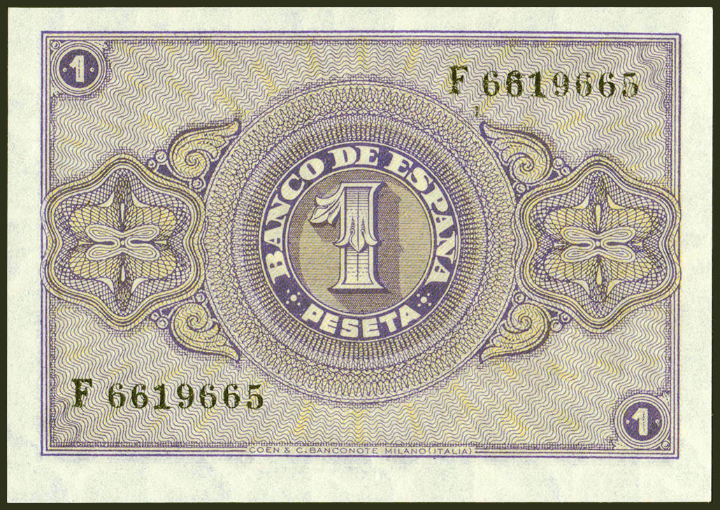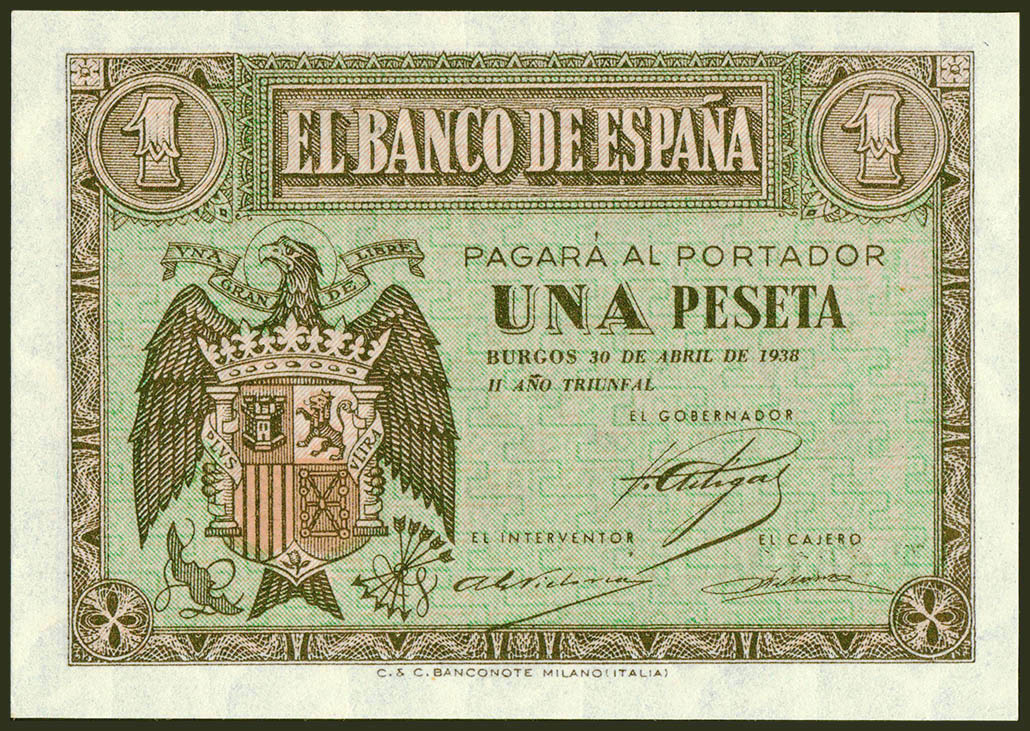1 Peseta. 30 de Abril de 1938. Serie F. (Edifil 2021: 428a). Conserva todo su apresto original. SC.