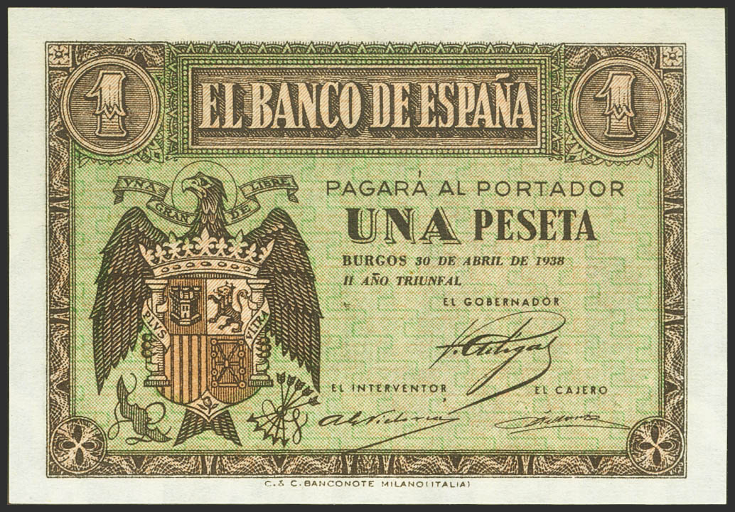 1 Peseta. 30 de Abril de 1938. Serie H. (Edifil 2021: 428a). Apresto original. SC.