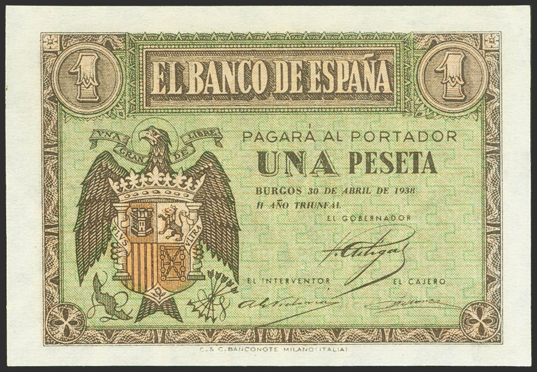 1 Peseta. 30 de Abril de 1938. Serie I. (Edifil 2023: 428a). Apresto original. SC.