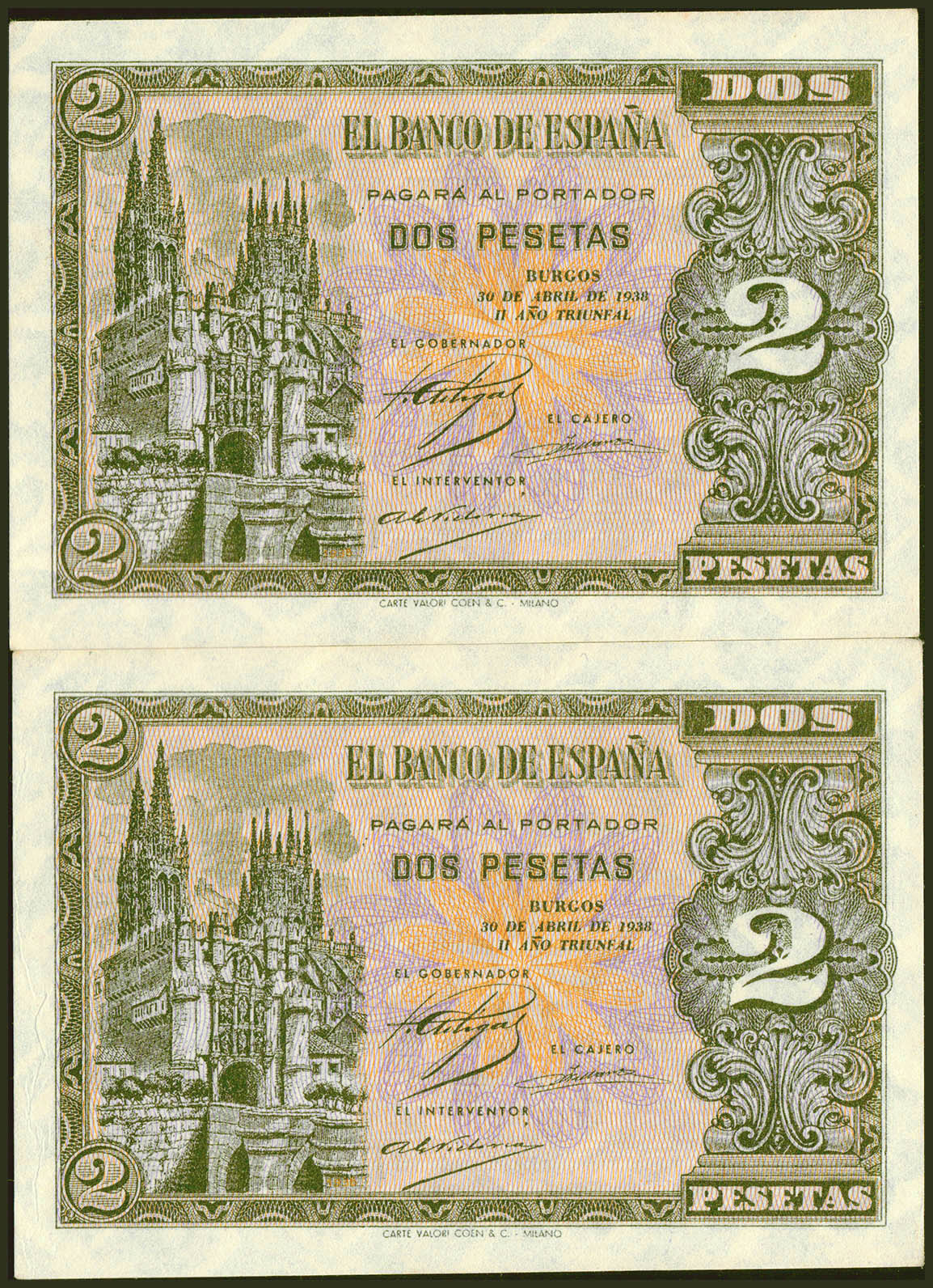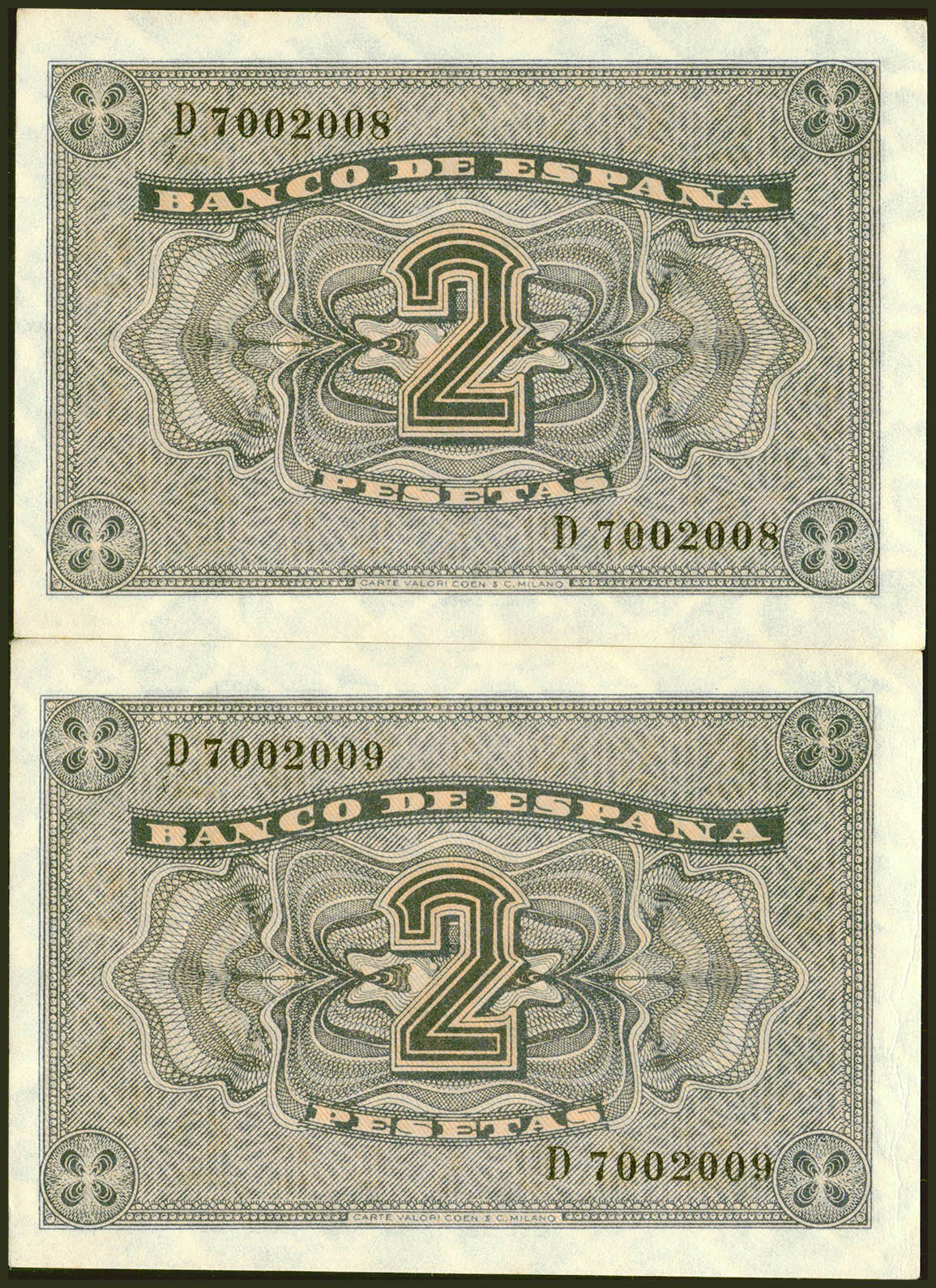 2 Pesetas. 30 de Abril de 1938. Pareja correlativa. Serie D. (Edifil 2021: 429a). Conserva todo su apresto original. SC-.