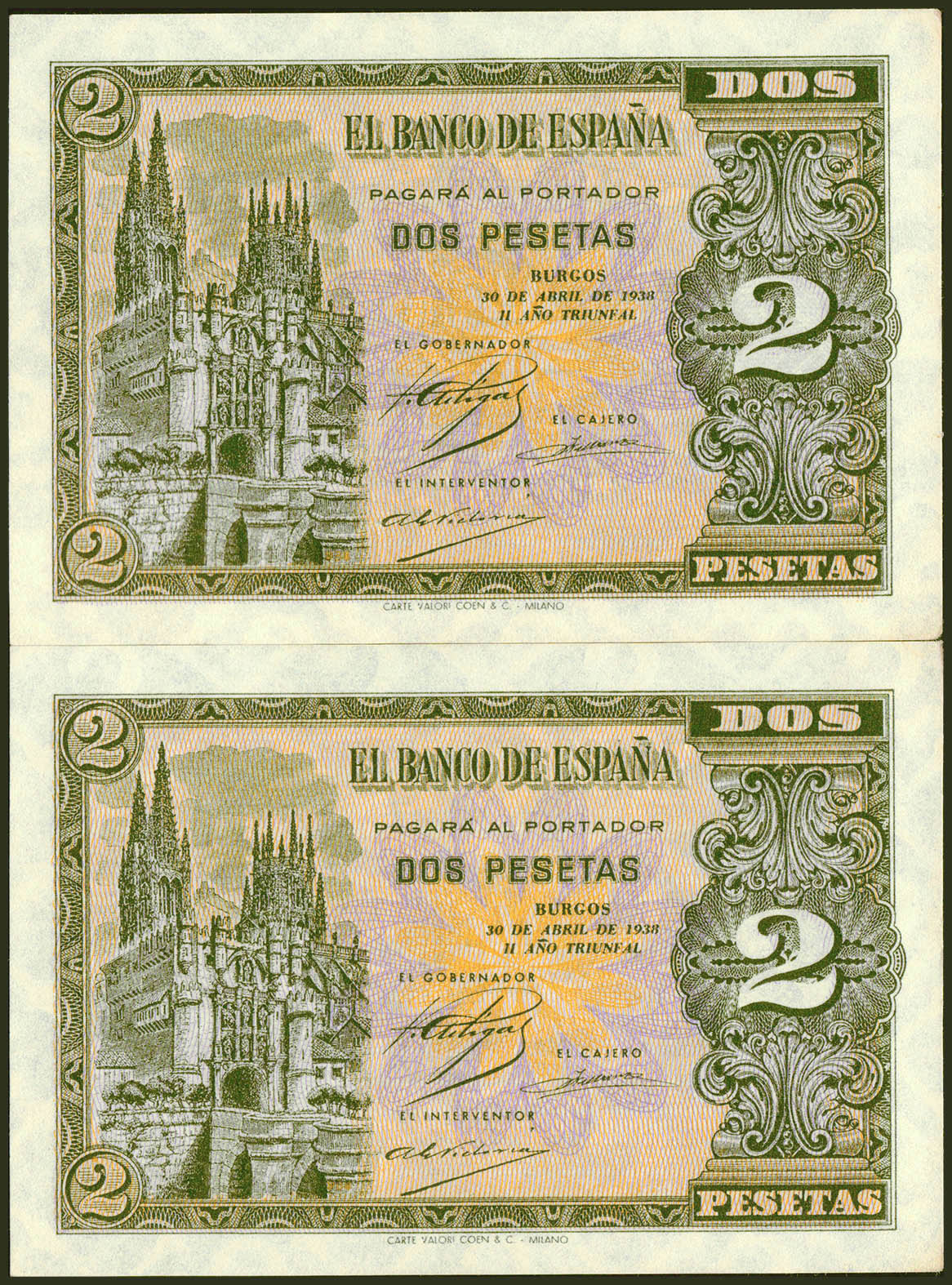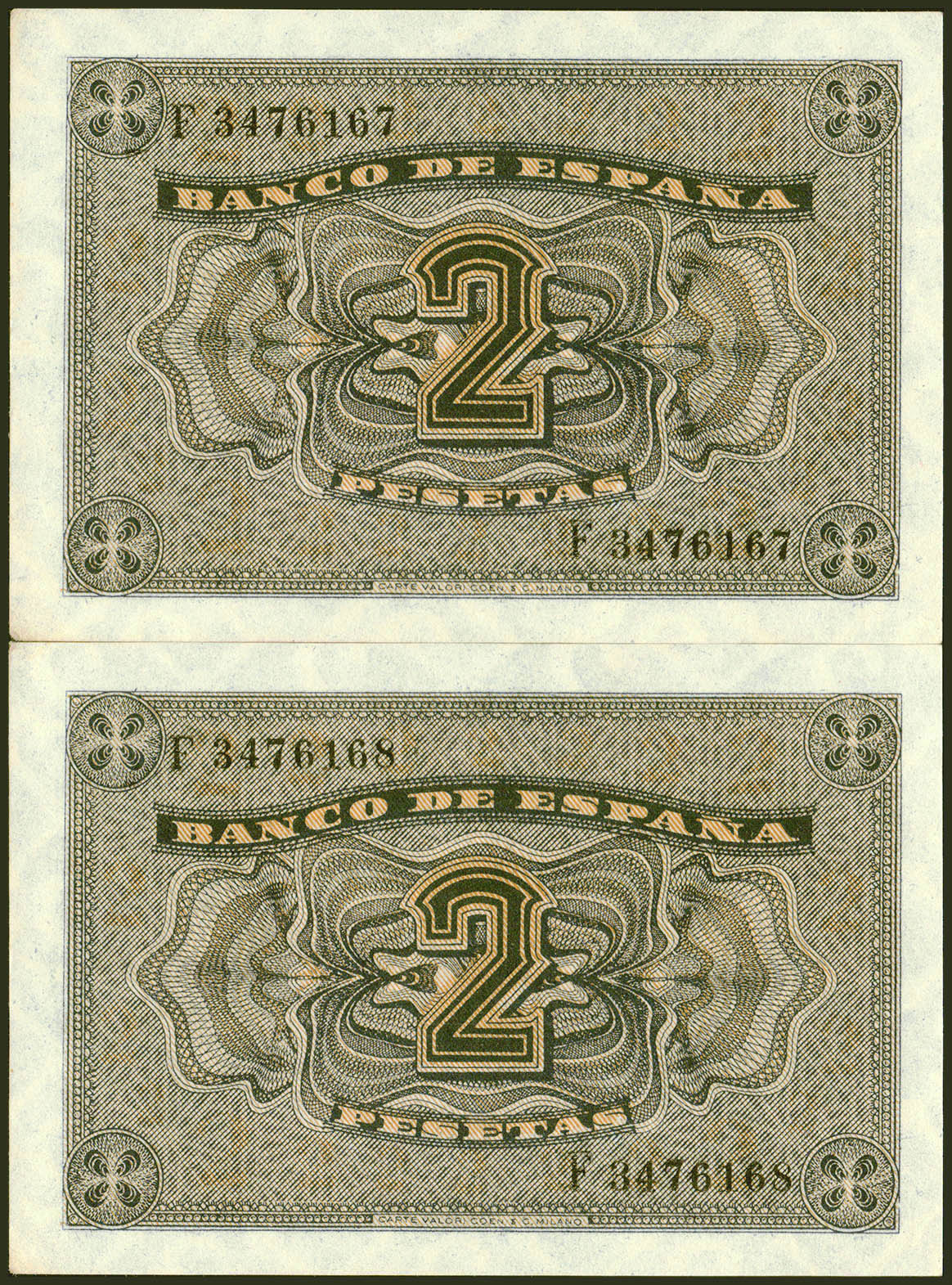 2 Pesetas. 30 de Abril de 1938. Pareja correlativa. Serie F. (Edifil 2021: 429a). Conserva todo su apresto original. SC-.