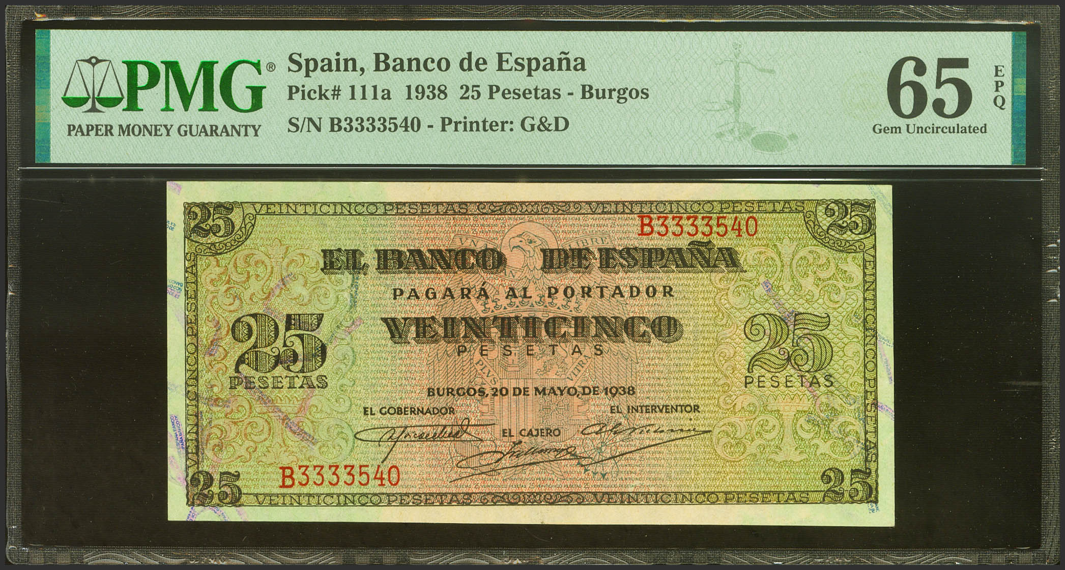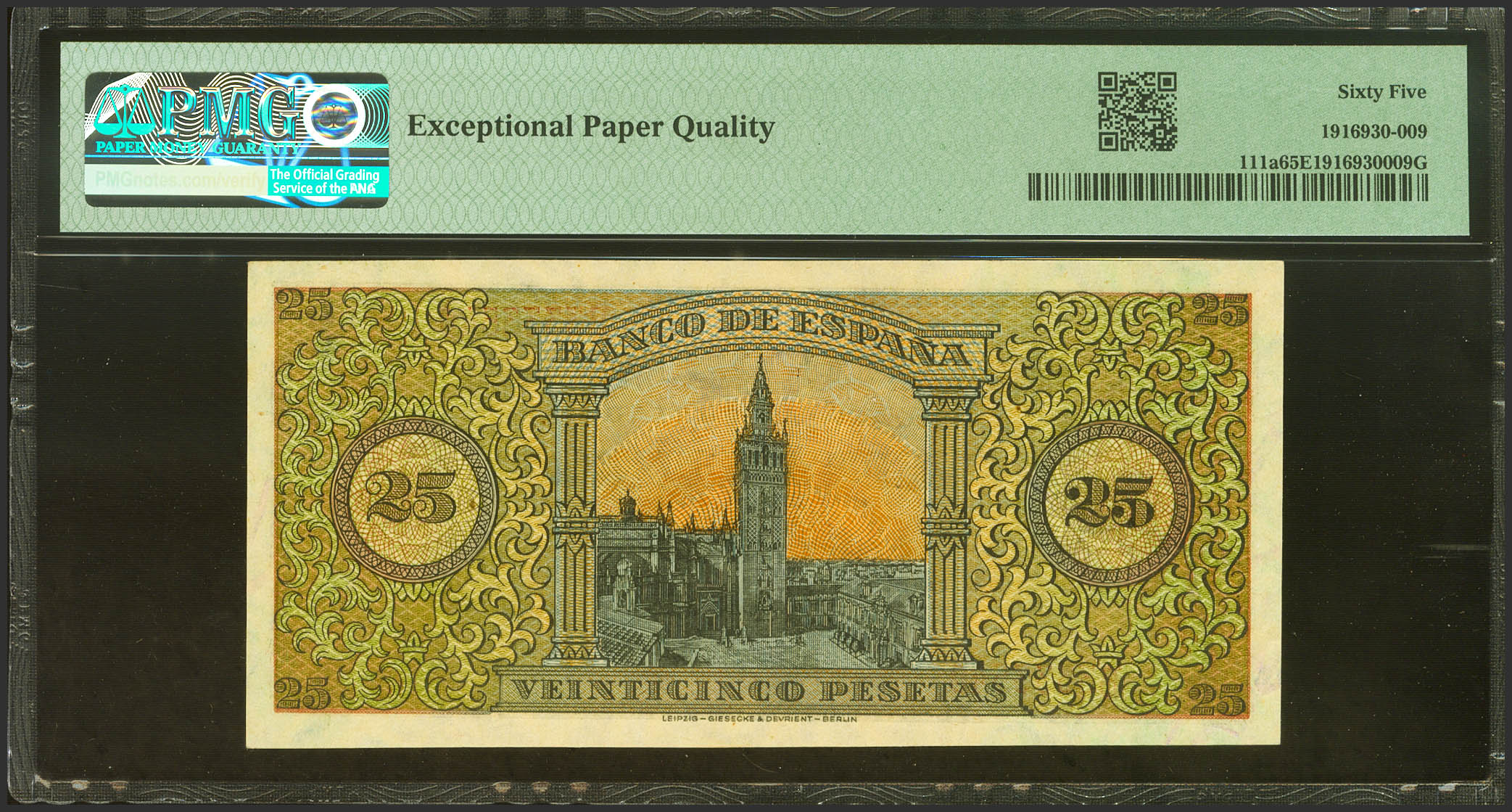 25 Pesetas. 20 de Mayo de 1938. Serie B. (Edifil 2023: 430a, Pick: 111a). Inusual en esta calidad, apresto original. SC. Encapsulado PMG65EPQ.