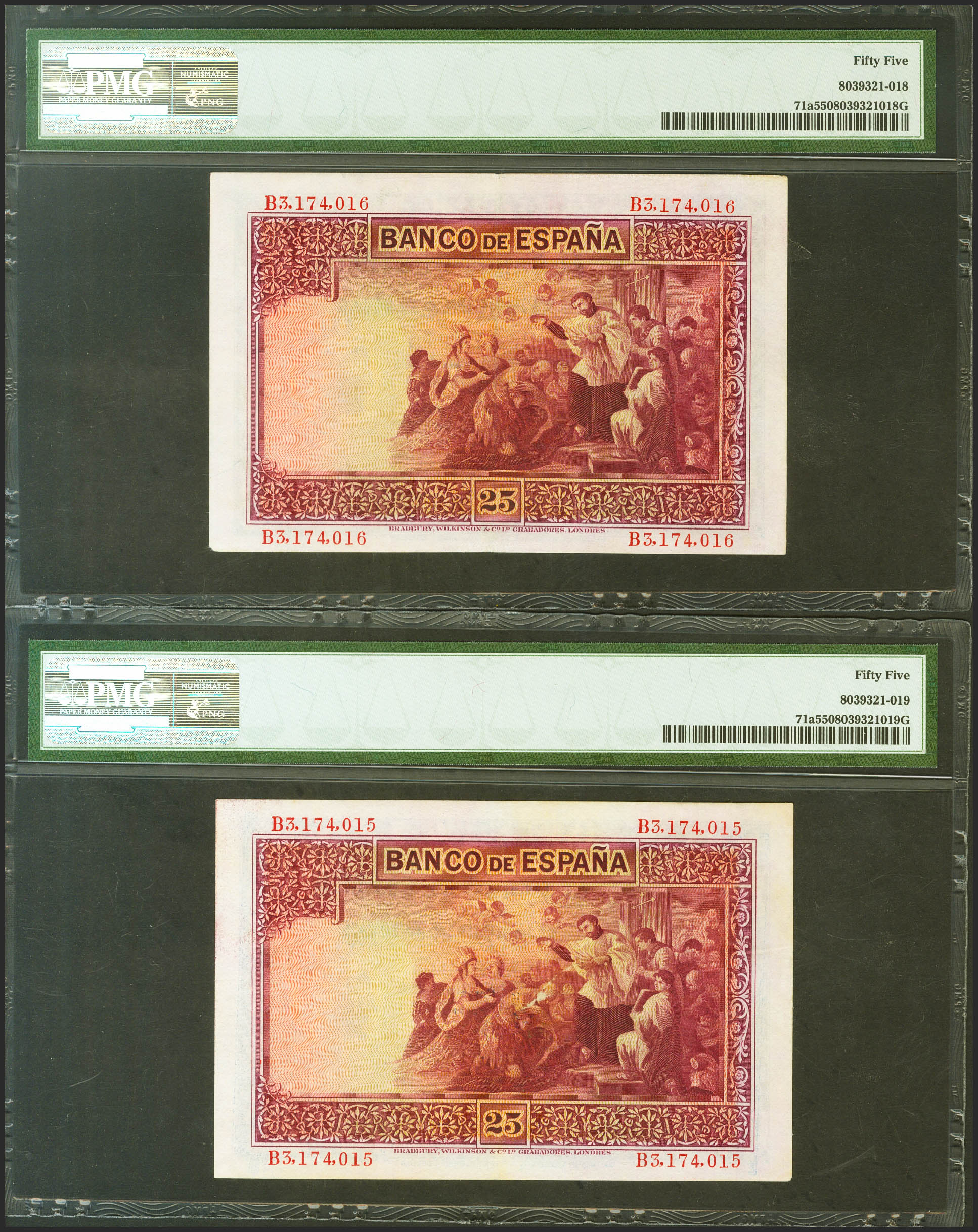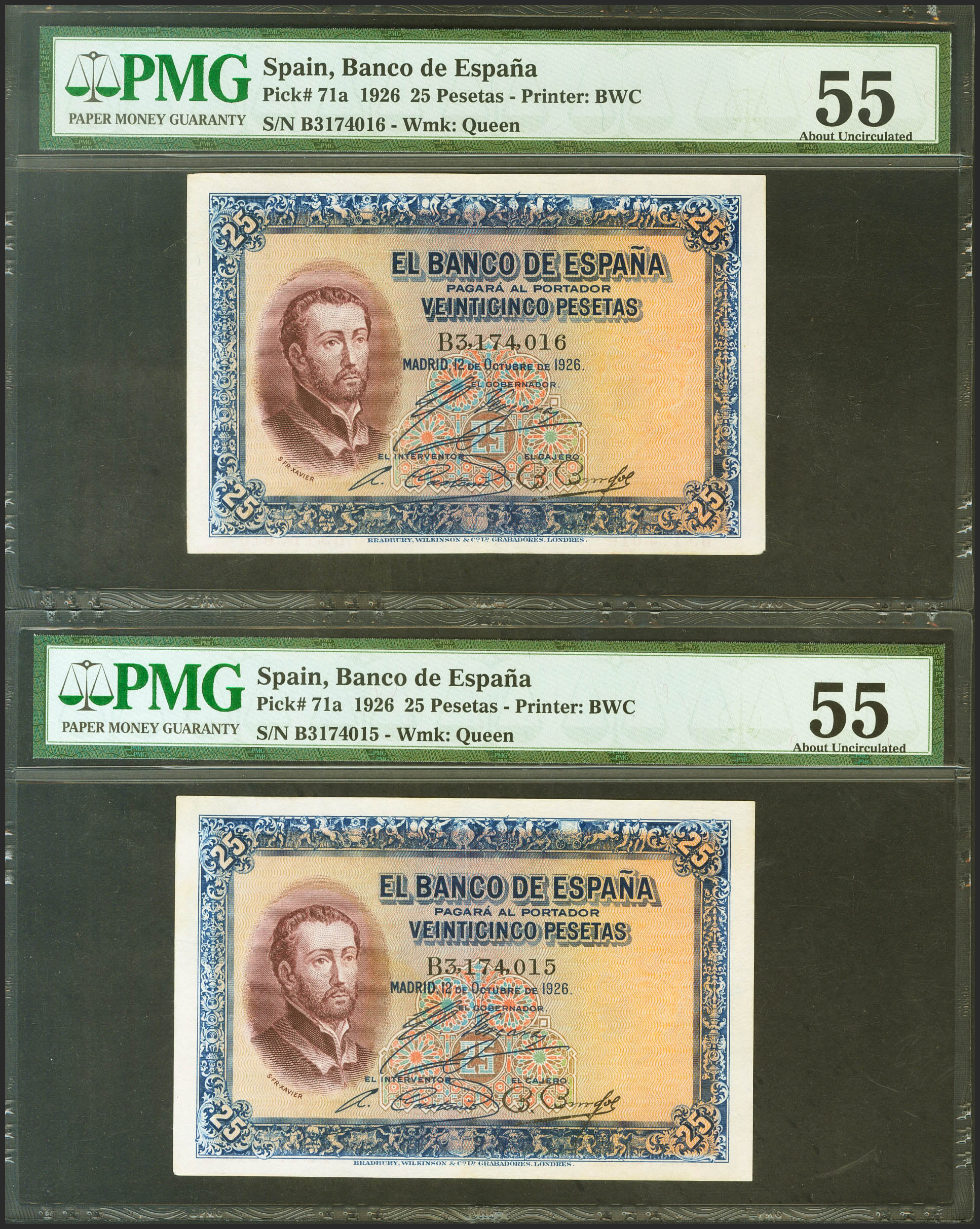 25 Pesetas. 12 de Octubre de 1926. Pareja correlativa. Serie B, última serie emitida. (Edifil 2021: 325a, Pick: 71a). Inusual en esta calidad. EBC+. Encapsulados PMG55, ambos.