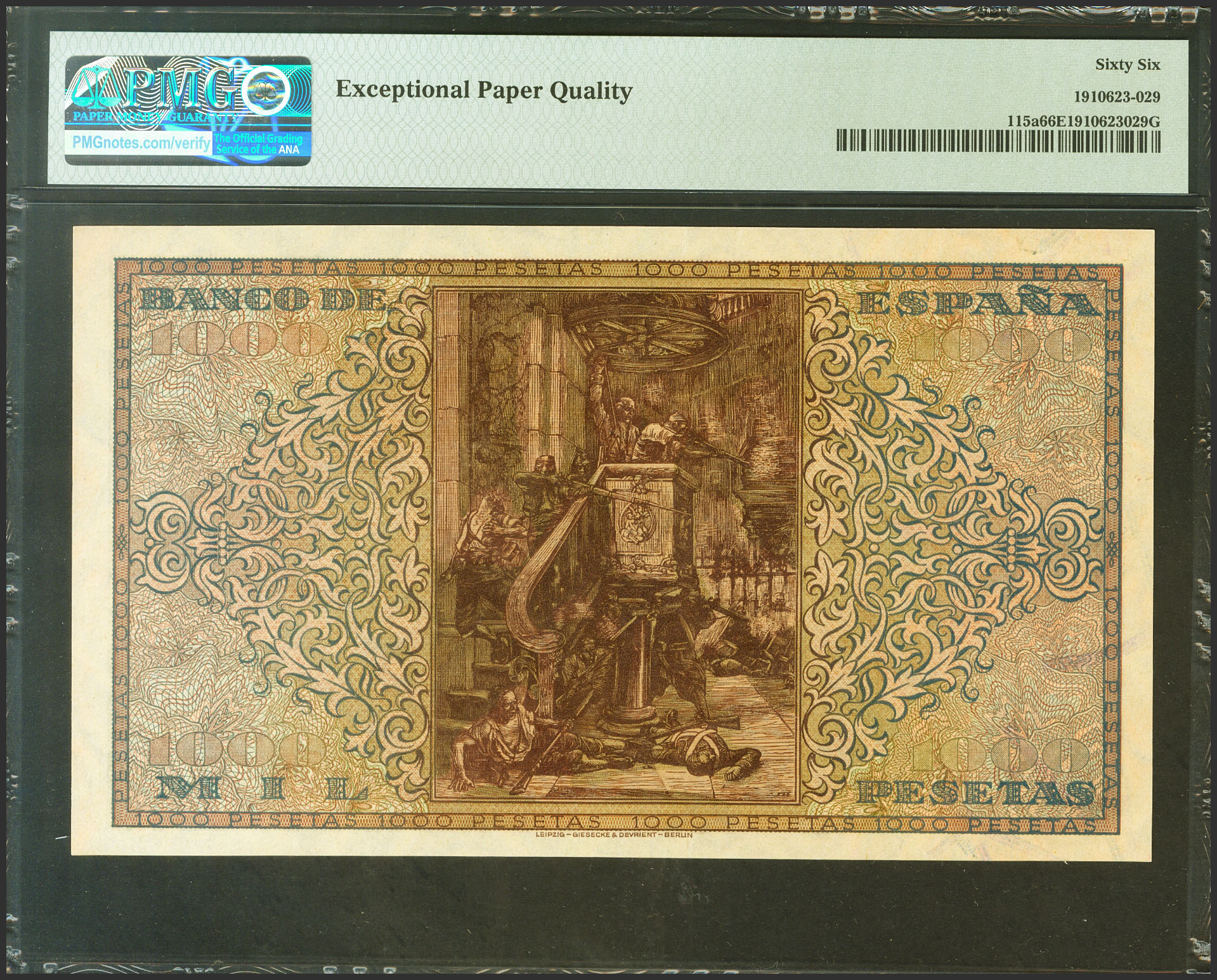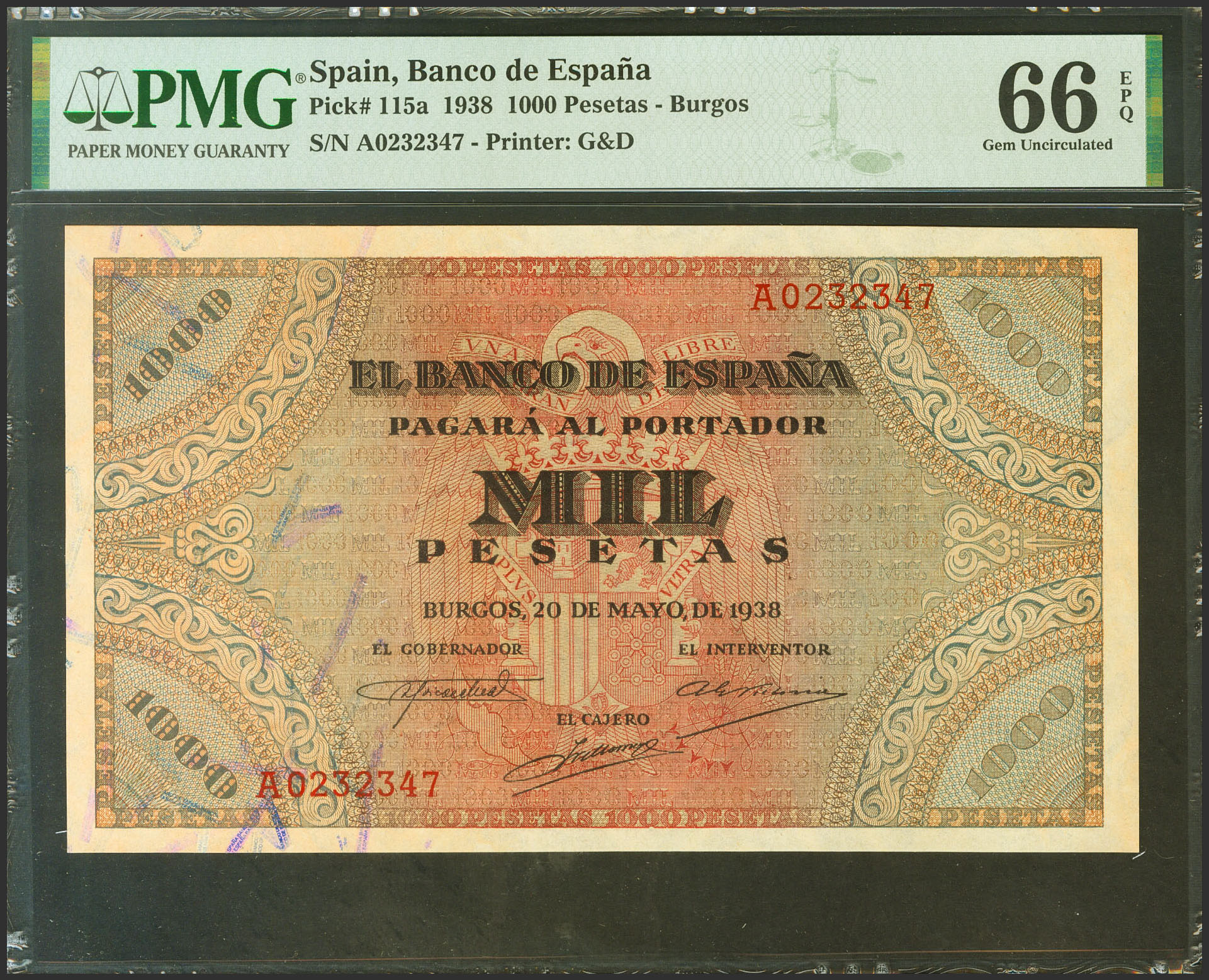 1000 Pesetas. 20 de Mayo de 1938. Serie A. (Edifil 2021: 434, Pick: 115a). Rarísimo en esta excepcional calidad, apresto original. SC. Encapsulado PMG66EPQ. (Para hacernos una idea de la rareza de este billete, a fecha 1 de Julio de 2022, es el segundo billete mejor calificado junto a otros nueve billetes en PMG)