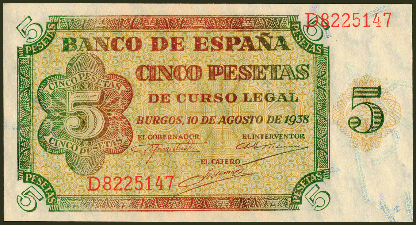 5 Pesetas. 10 de Agosto de 1938. Serie D. (Edifil 2021: 435a). Conserva todo su apresto original. SC.