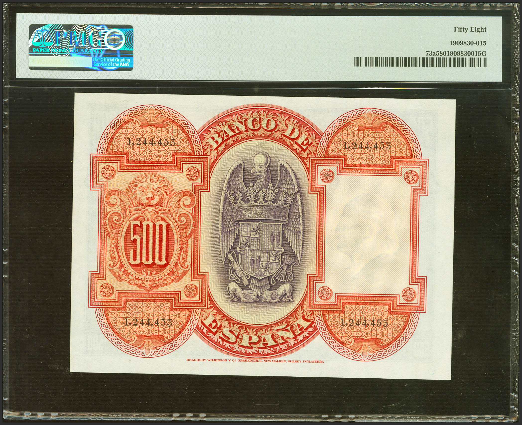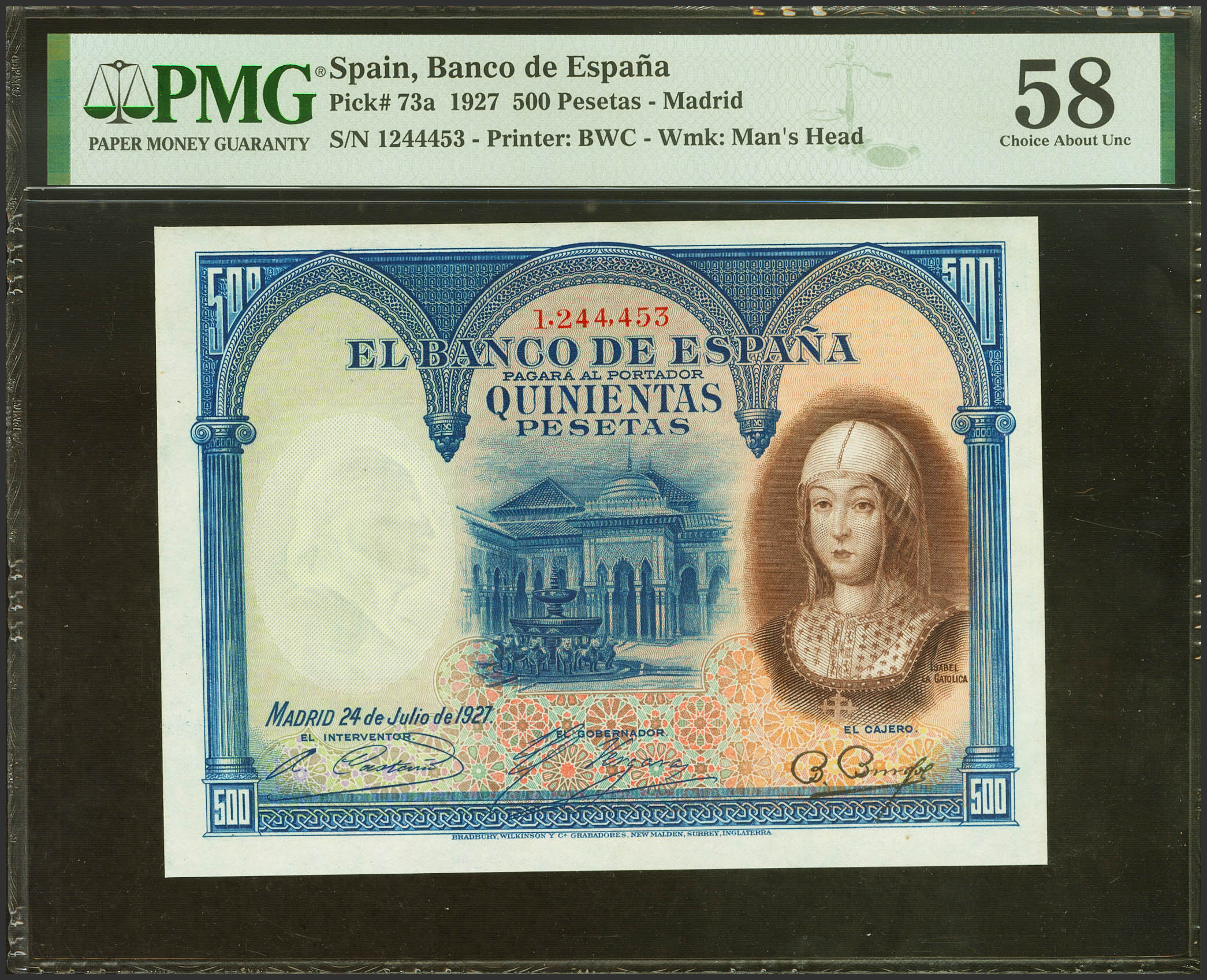 500 Pesetas. 24 de Julio de 1927. Sin serie y numeración anterior al 3646000. (Edifil 2023: 327, Pick: 73a). Muy raro, especialmente en esta calidad. EBC+. Encapsulado PMG58.