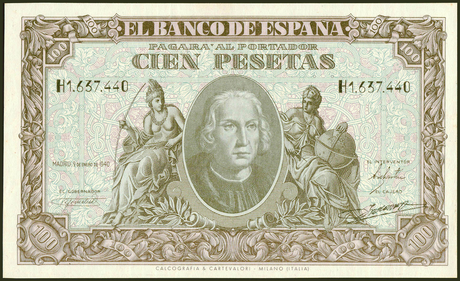 100 Pesetas. 9 de Enero de 1940. Serie H. (Edifil 2021: 438a). Conserva todo su apresto original. SC-.