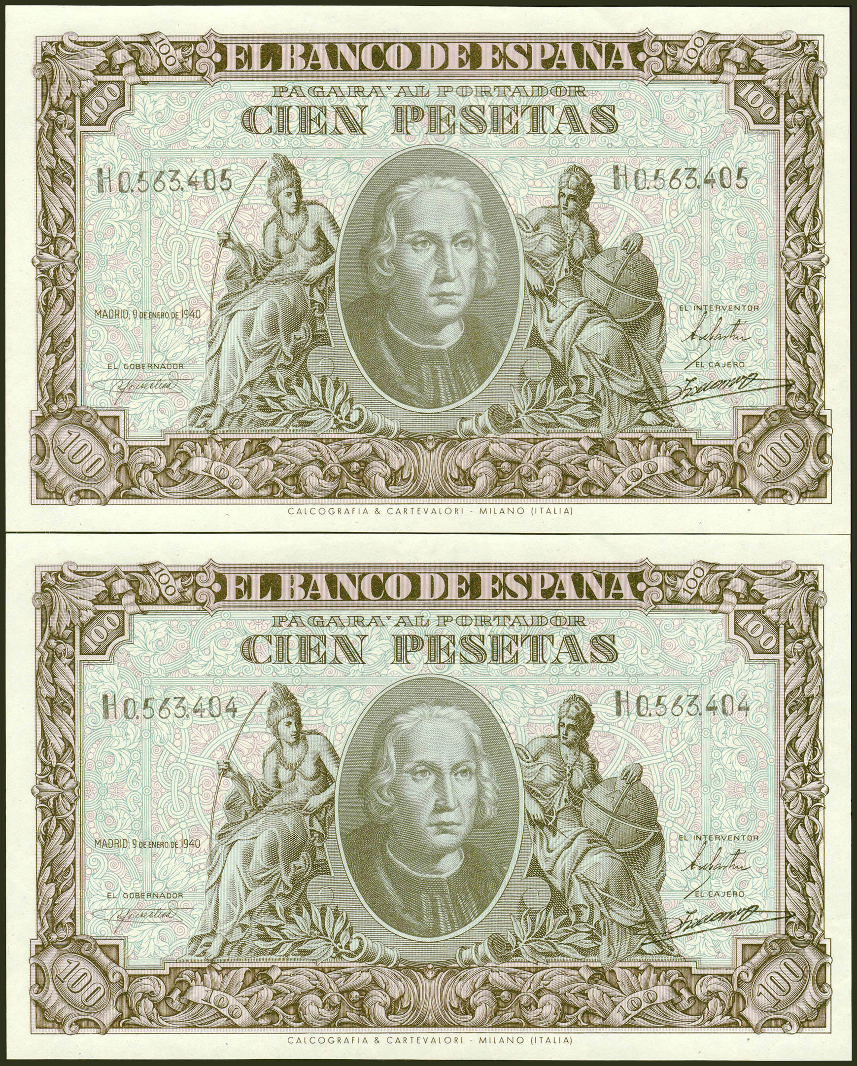 100 Pesetas. 9 de Enero de 1940. Pareja correlativa. Serie H. (Edifil 2021: 438a). Inusual y apresto original. SC-.