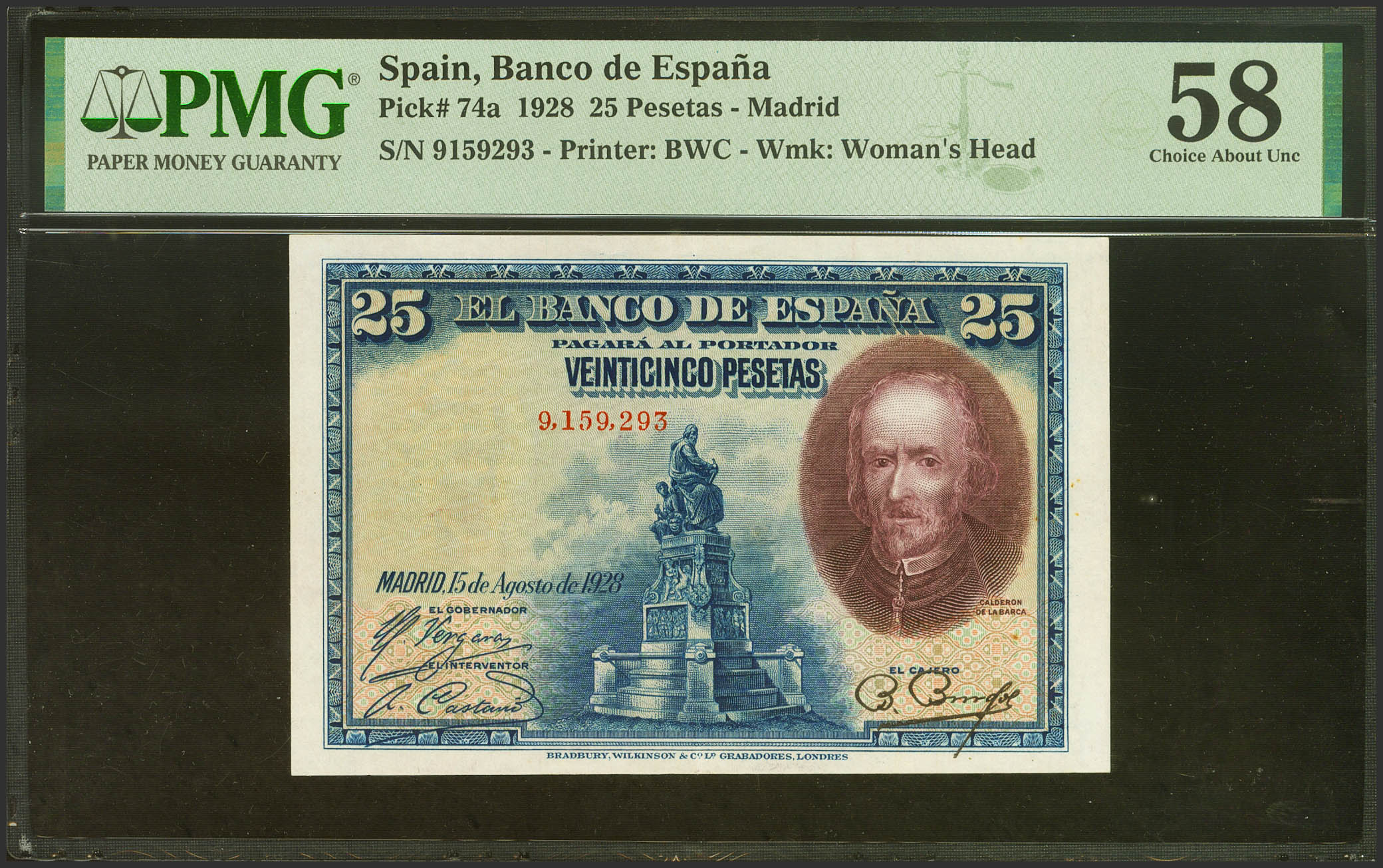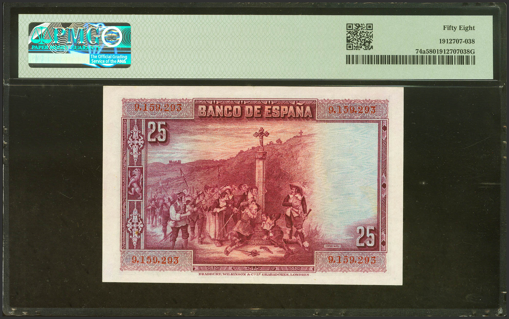 25 Pesetas. 15 de Agosto de 1928. Sin serie. (Edifil 2023: 328, Pick: 74a). Inusual, especialmente en esta calidad. EBC++. Encapsulado PMG58.