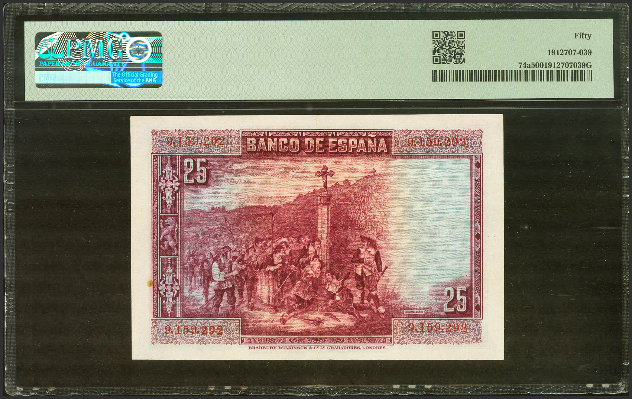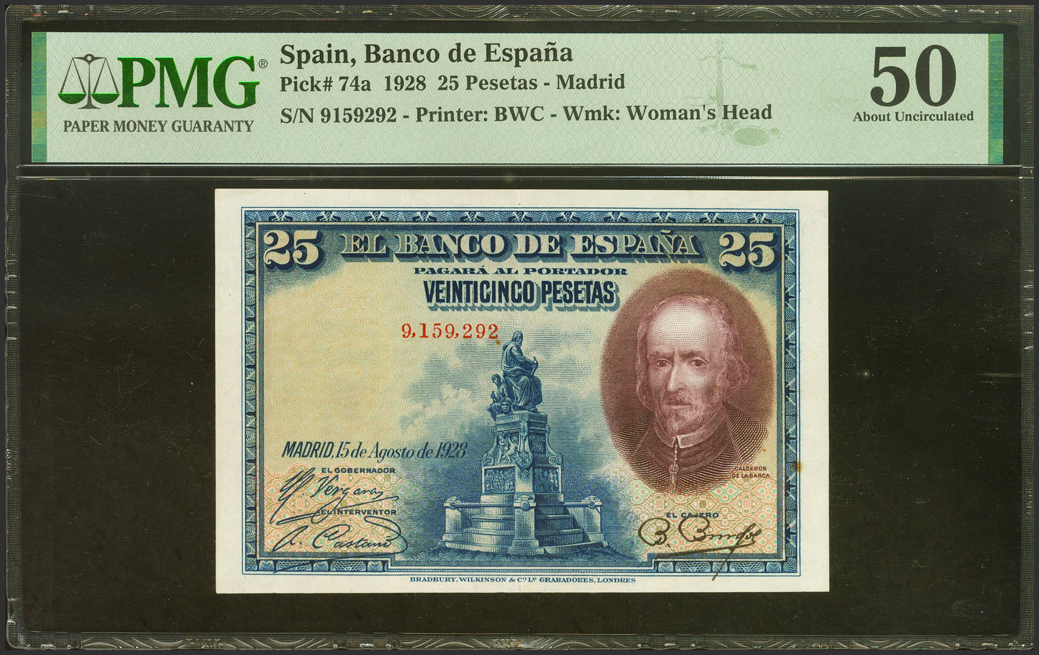 25 Pesetas. 15 de Agosto de 1928. Sin serie. (Edifil 2023: 328, Pick: 74a). Inusual, especialmente en esta calidad. EBC. Encapsulado PMG50.