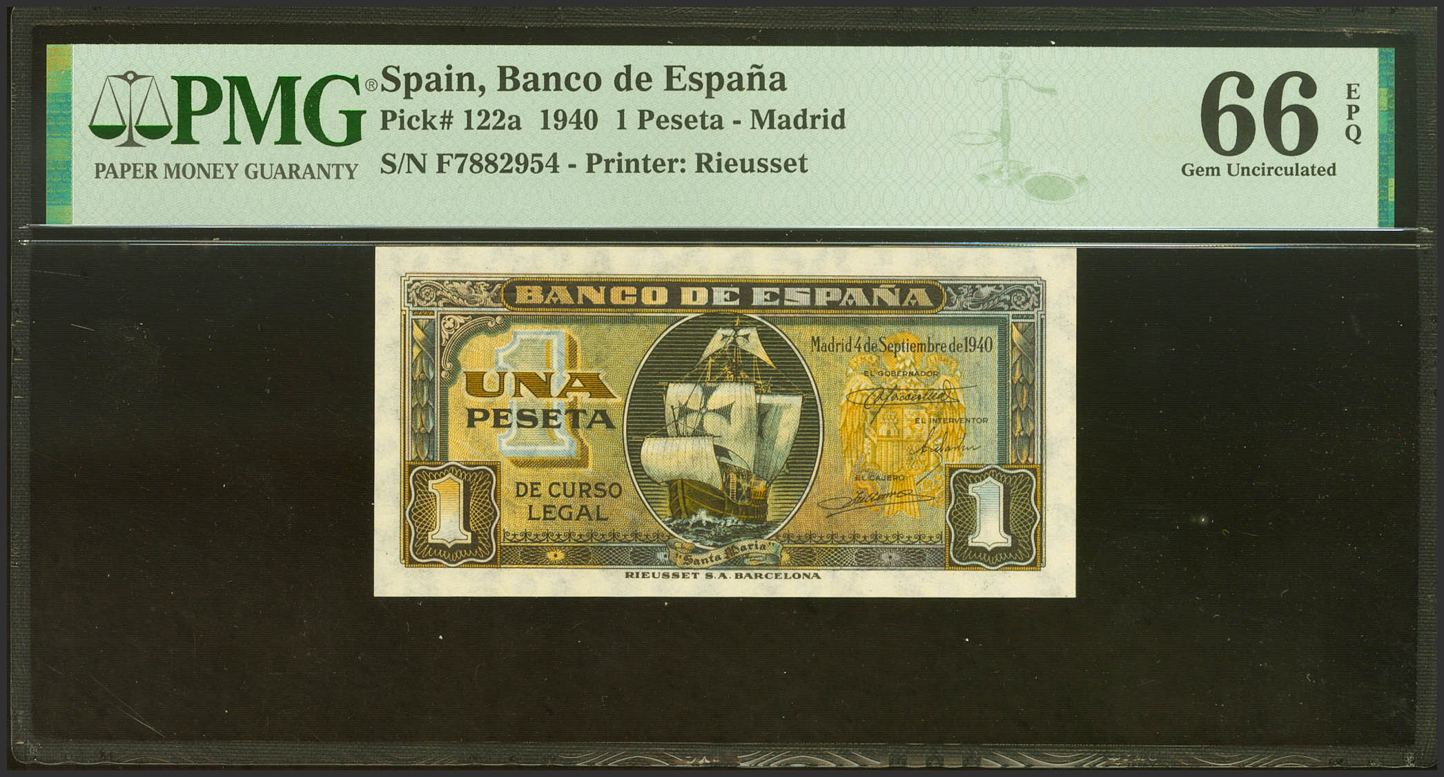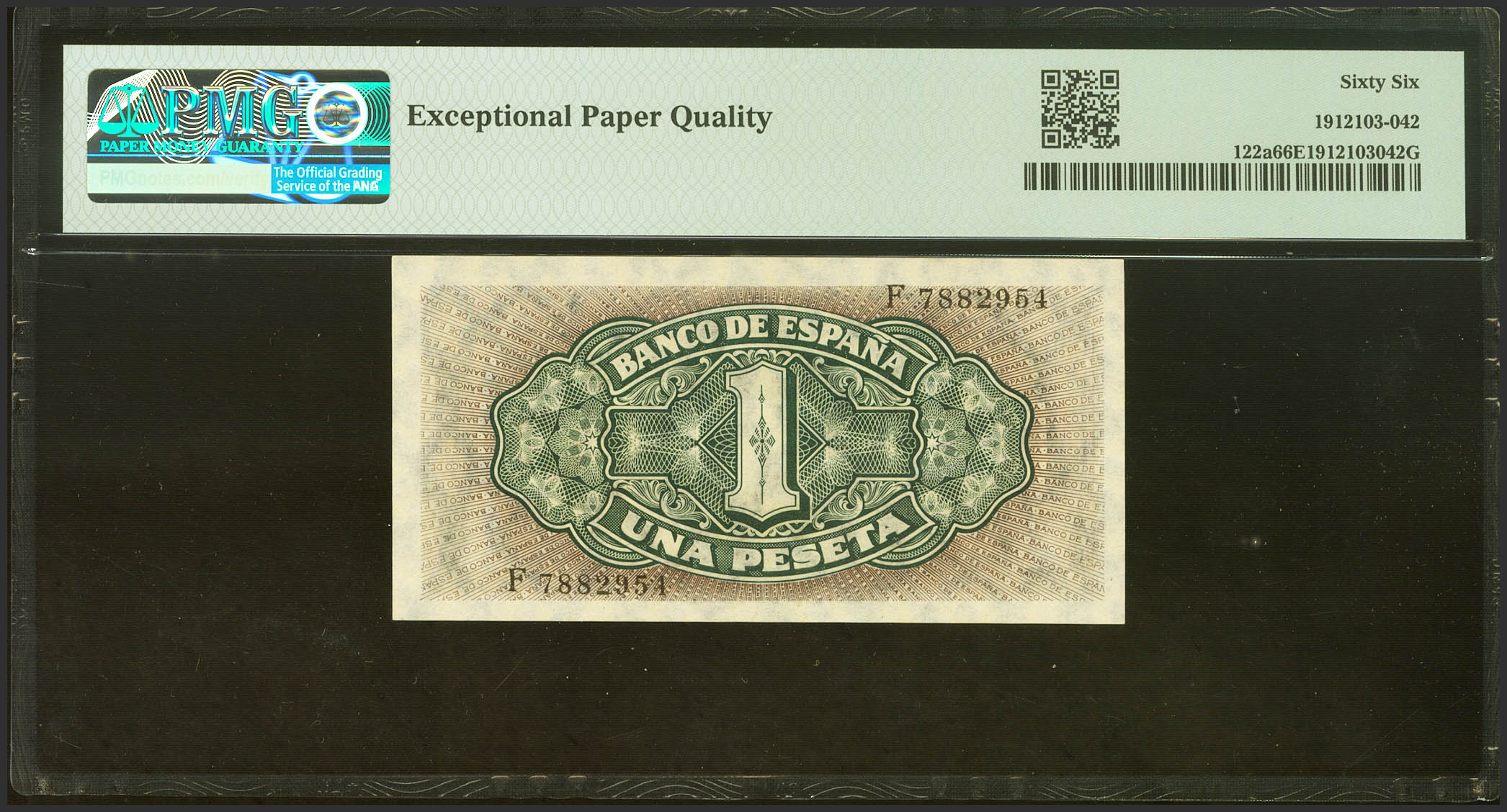1 Peseta. 4 de Septiembre de 1940. Serie F. (Edifil 2021: 442a, Pick: 122a). Inusual en esta calidad, apresto original. SC. Encapsulado PMG66EPQ.