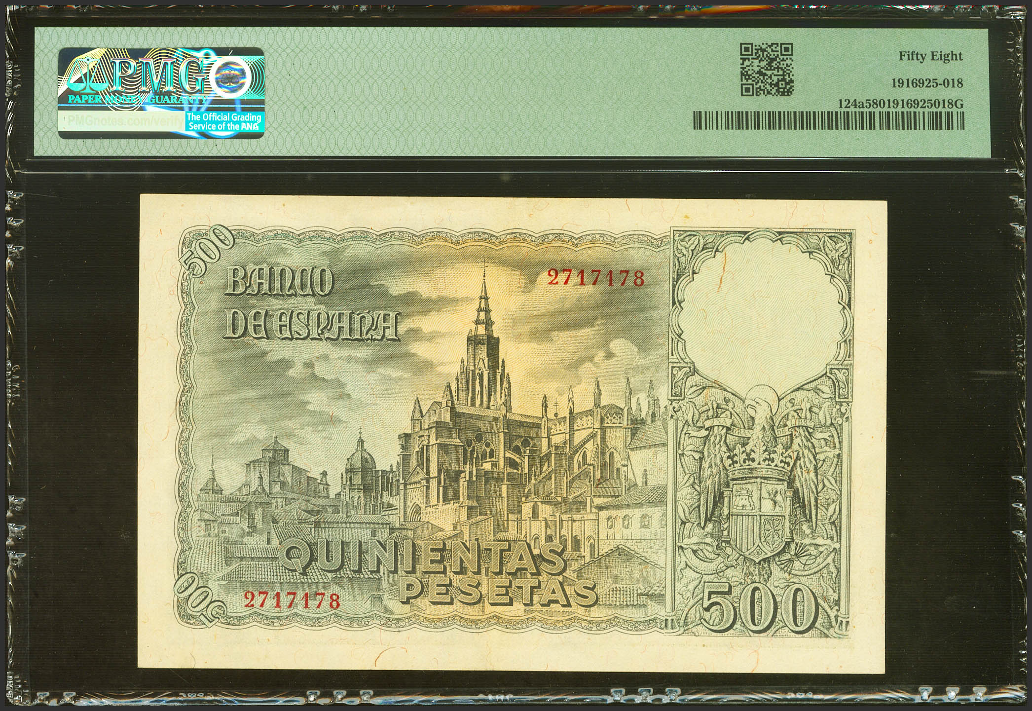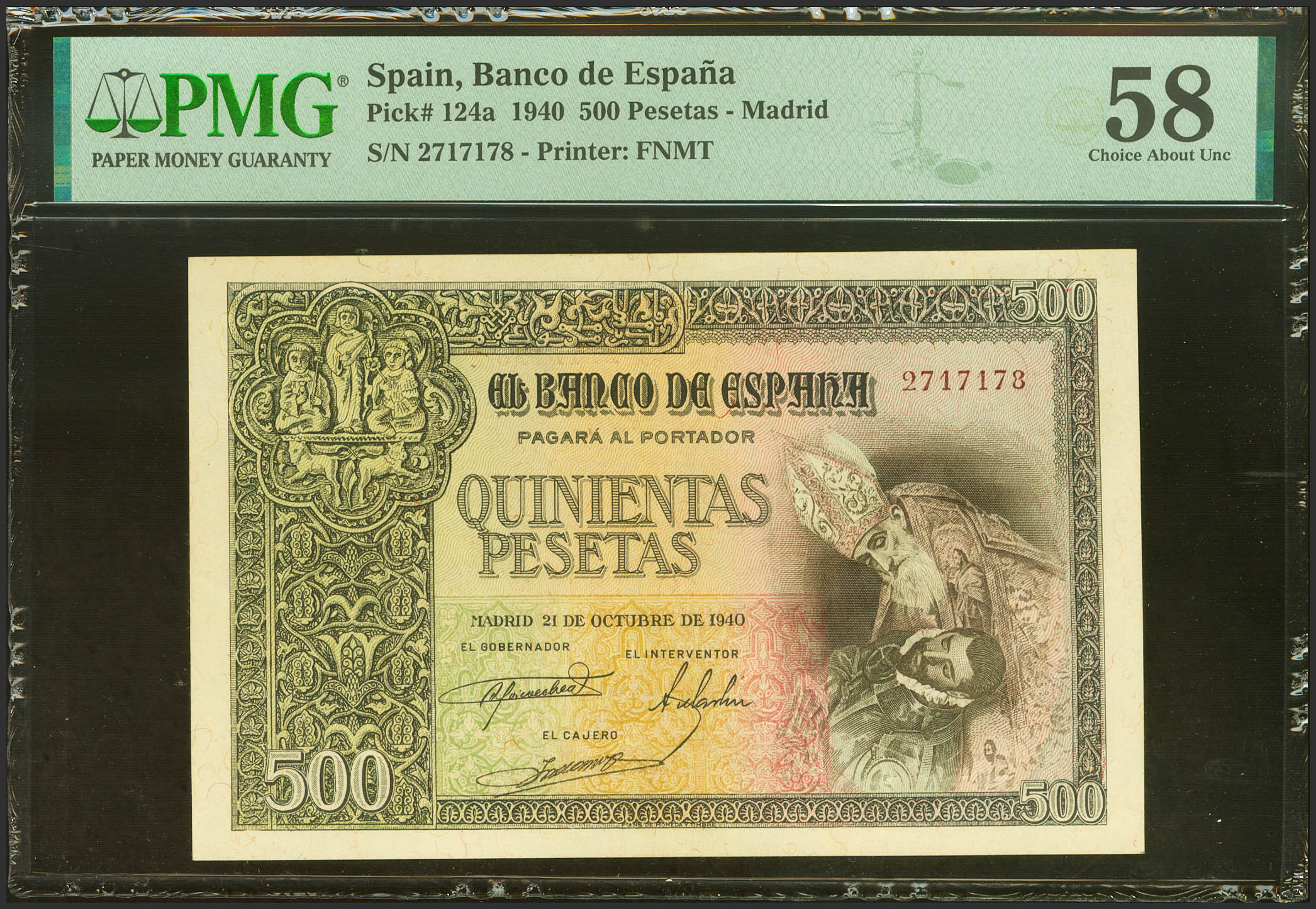 500 Pesetas. 21 de Octubre de 1940. Sin serie. (Edifil 2023: 444, Pick: 124a). Inusual en esta excepcional calidad. EBC++. Encapsulado PMG58.