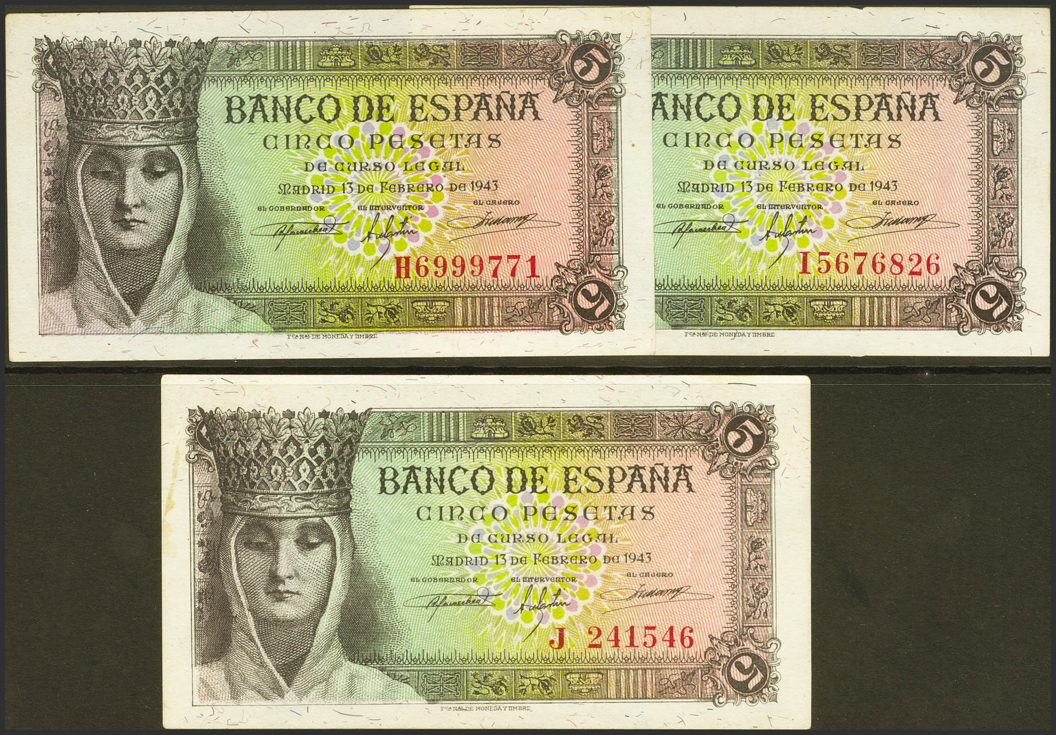 Conjunto de 11 billetes de 5 Pesetas emitidos el 13 de Febrero de 1943 y correspondiente a todas las series conocidas que incluyen el sin serie y las series A, B, C, D, E, F, G, H, I y J (Edifil 2021: 446, 446a). Muy inusual conjunto y de gran calidad, conservando todo su apresto original. SC/SC-, excepto el sin serie que es EBC+.