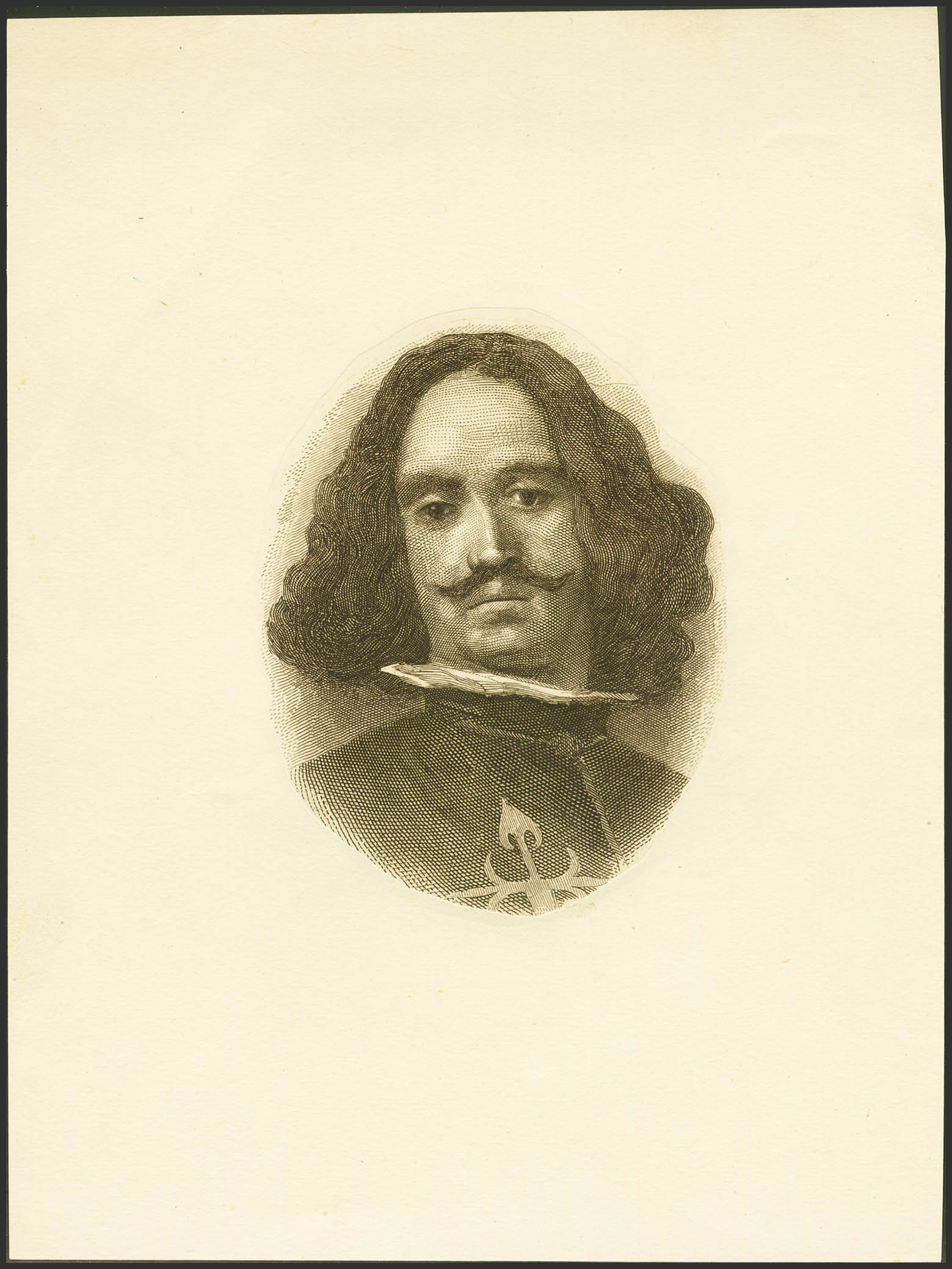 Prueba calcográfica, en negativo, del busto de Velázquez, en color negro. (Edifil 2023: 329Pg). Rarísima y catalogada, coincide con la fotografiada en el catálogo Edifil. SC.