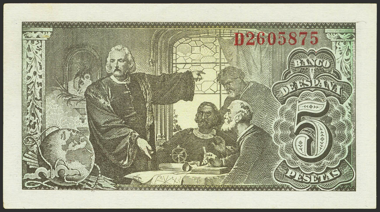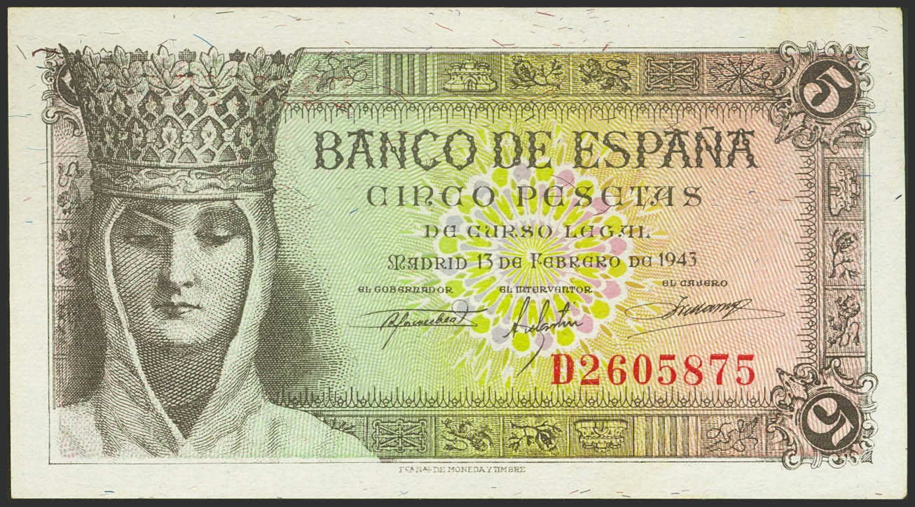 5 Pesetas. 13 de Febrero de 1943. Serie D. (Edifil 2021: 446a). Apresto original. SC-.