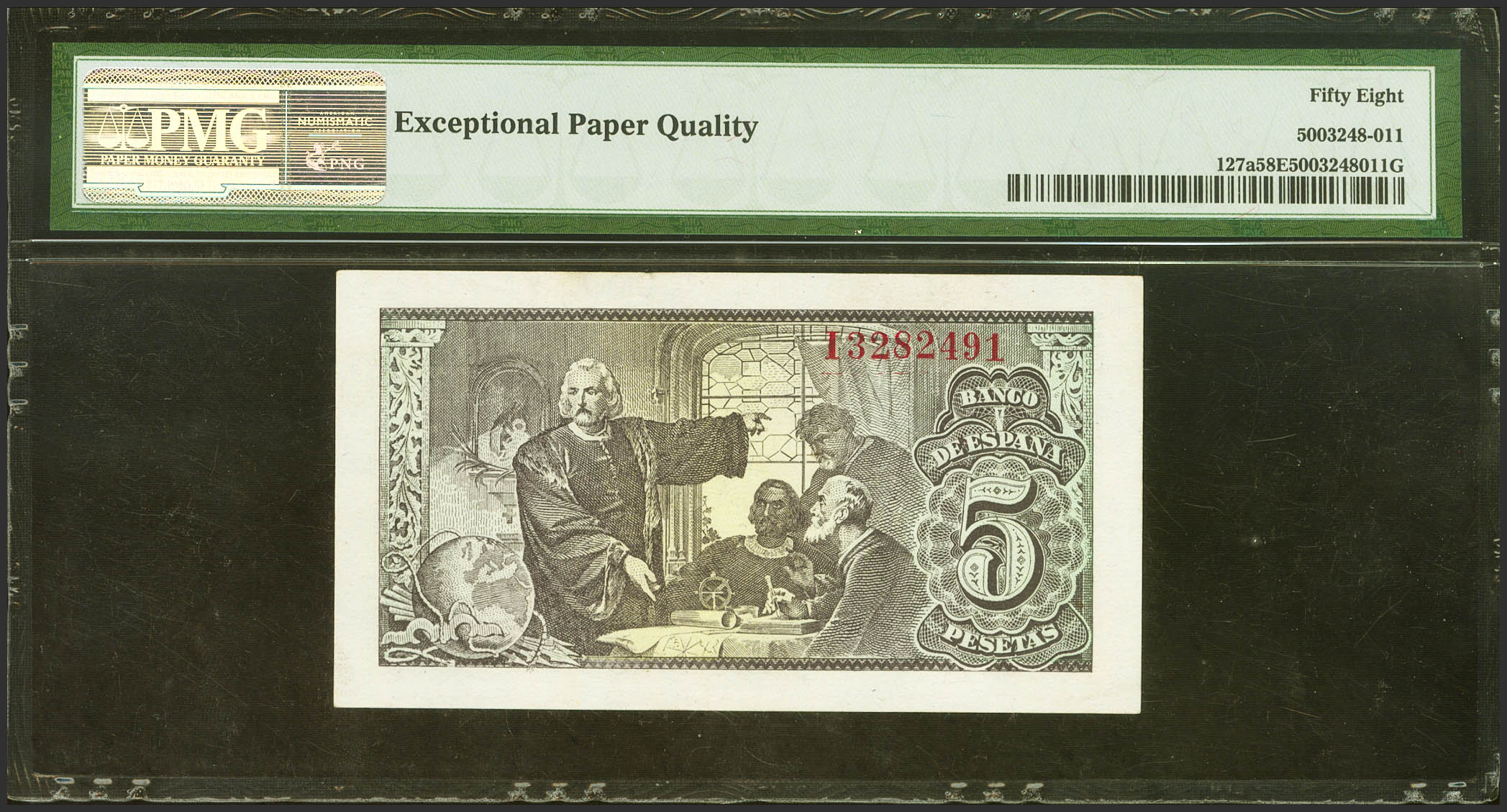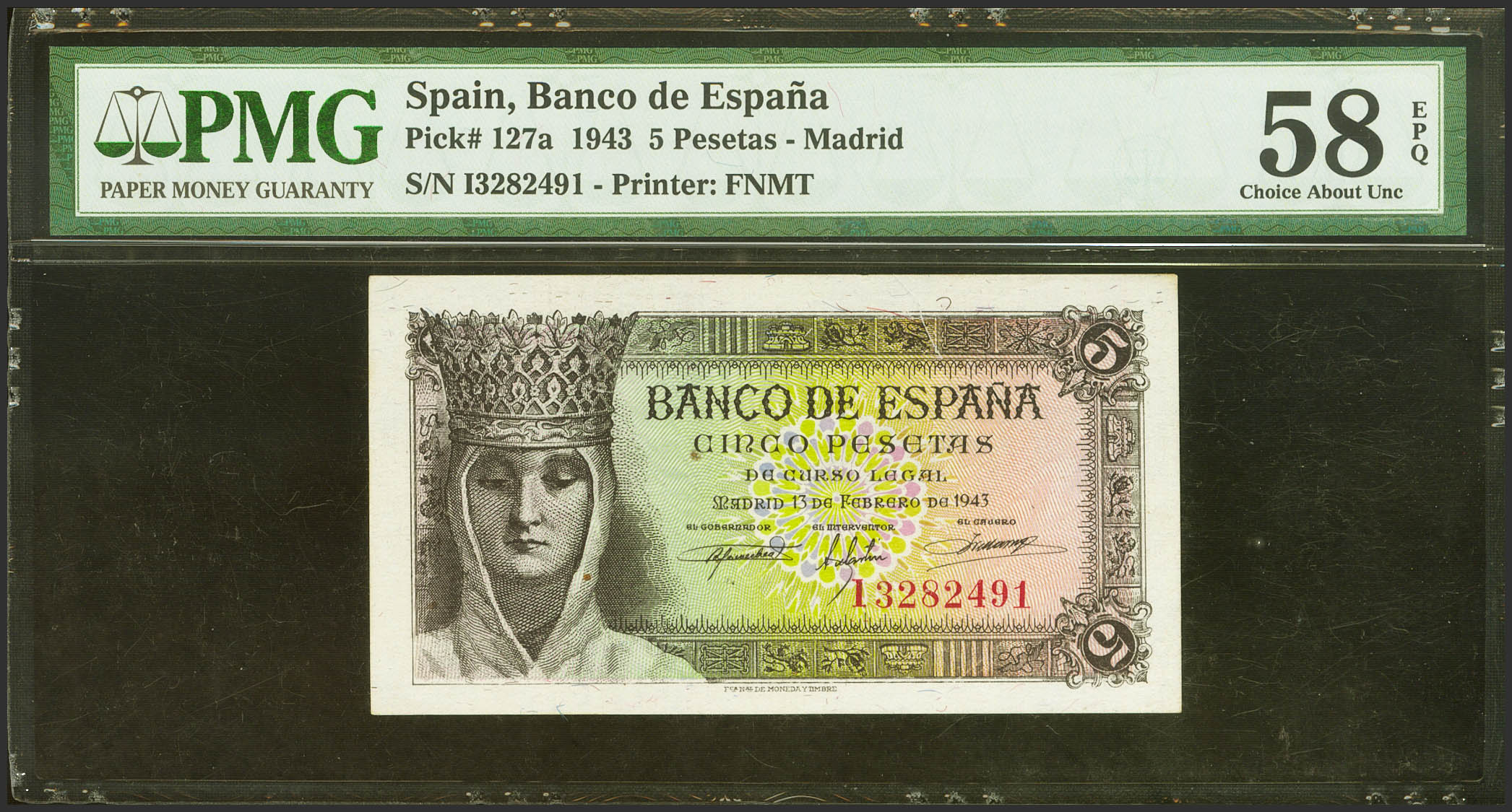 5 Pesetas. 13 de Febrero de 1943. Serie I. (Edifil 2023: 446a, Pick: 127a). Apresto original. SC. Encapsulado PMG58EPQ.