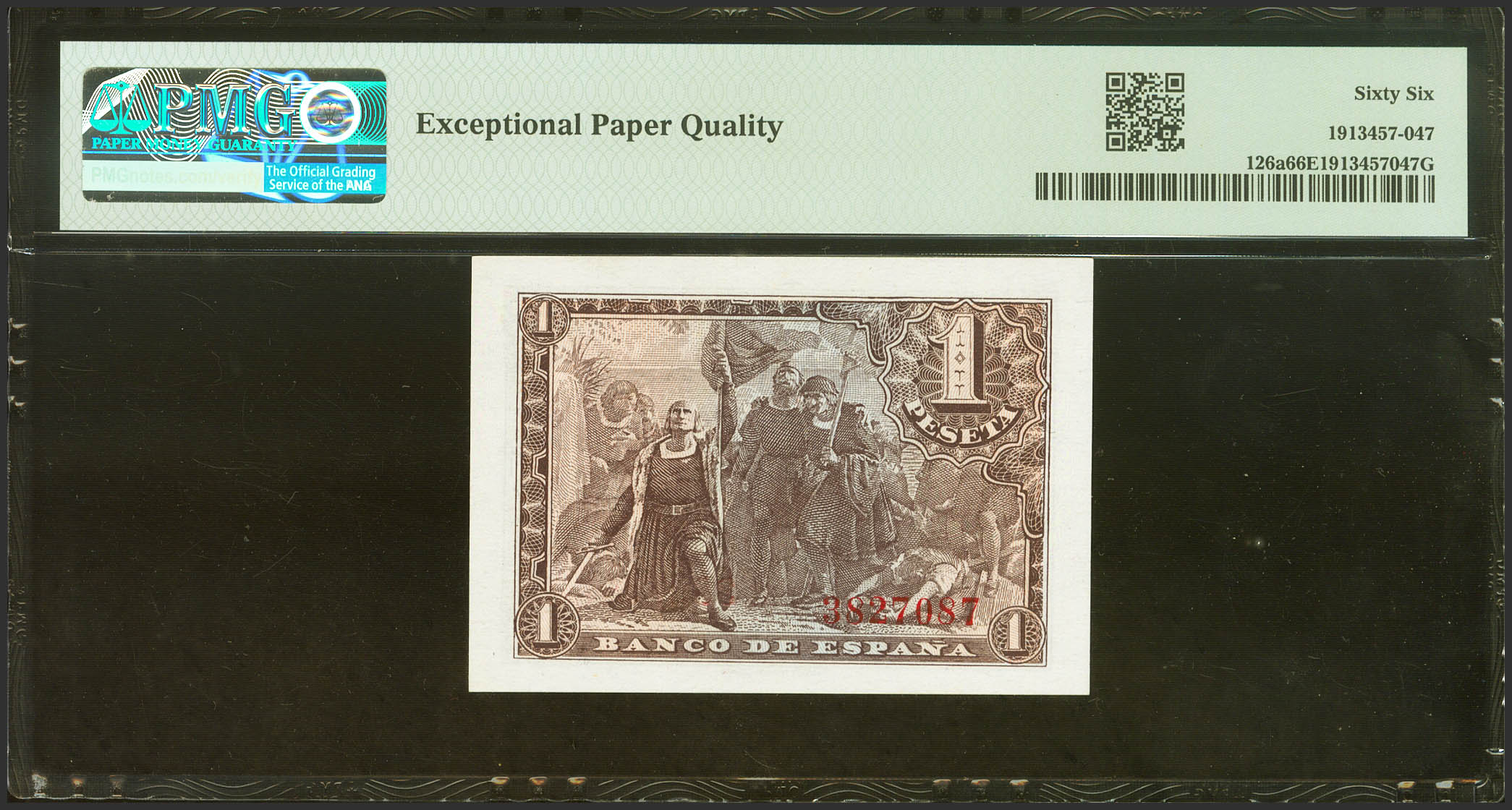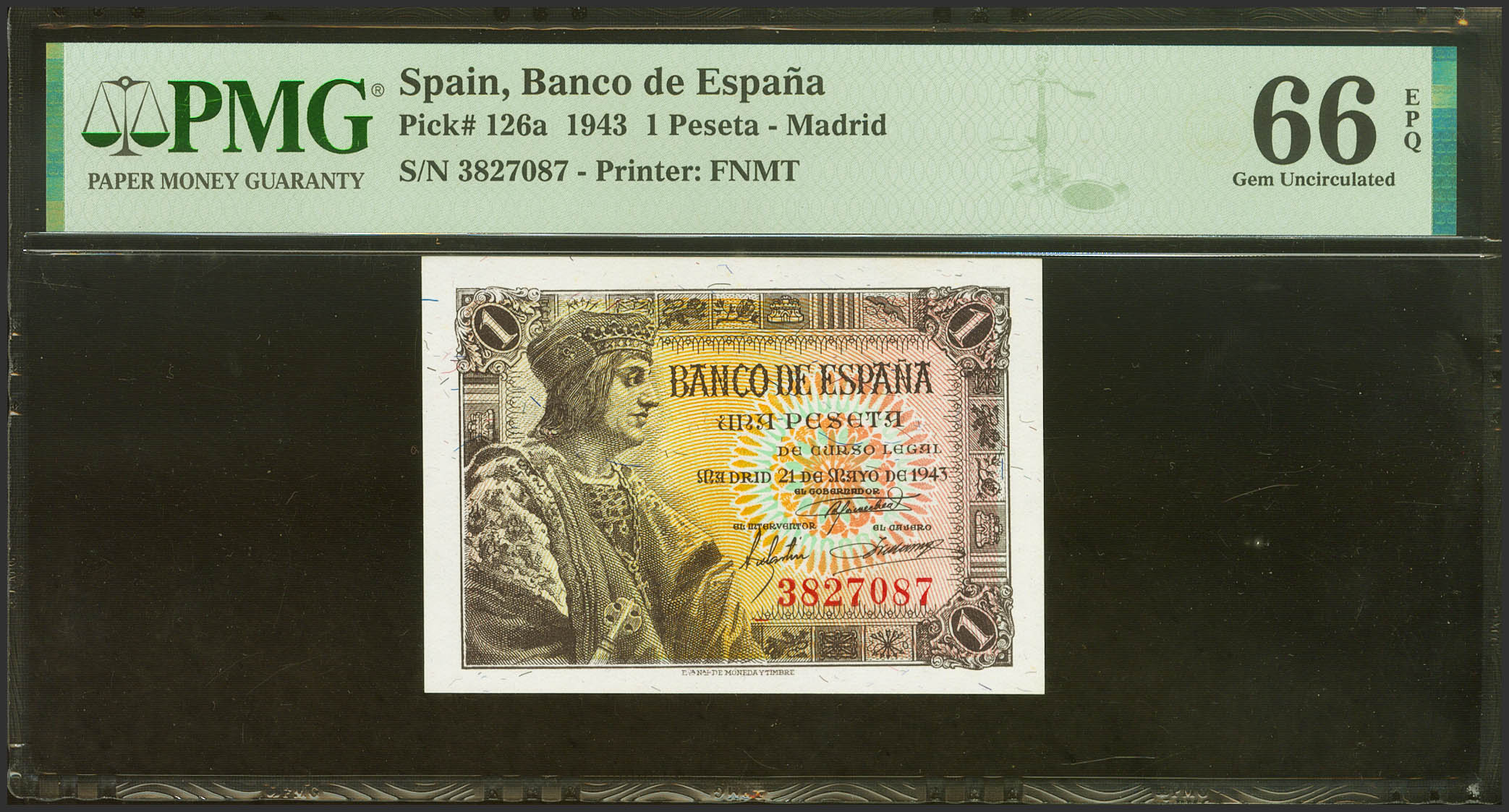 1 Peseta. 21 de Mayo de 1943. Sin serie. (Edifil 2023: 447, Pick: 126a). Inusual en esta calidad, apresto original. SC. Encapsulado PMG66EPQ.