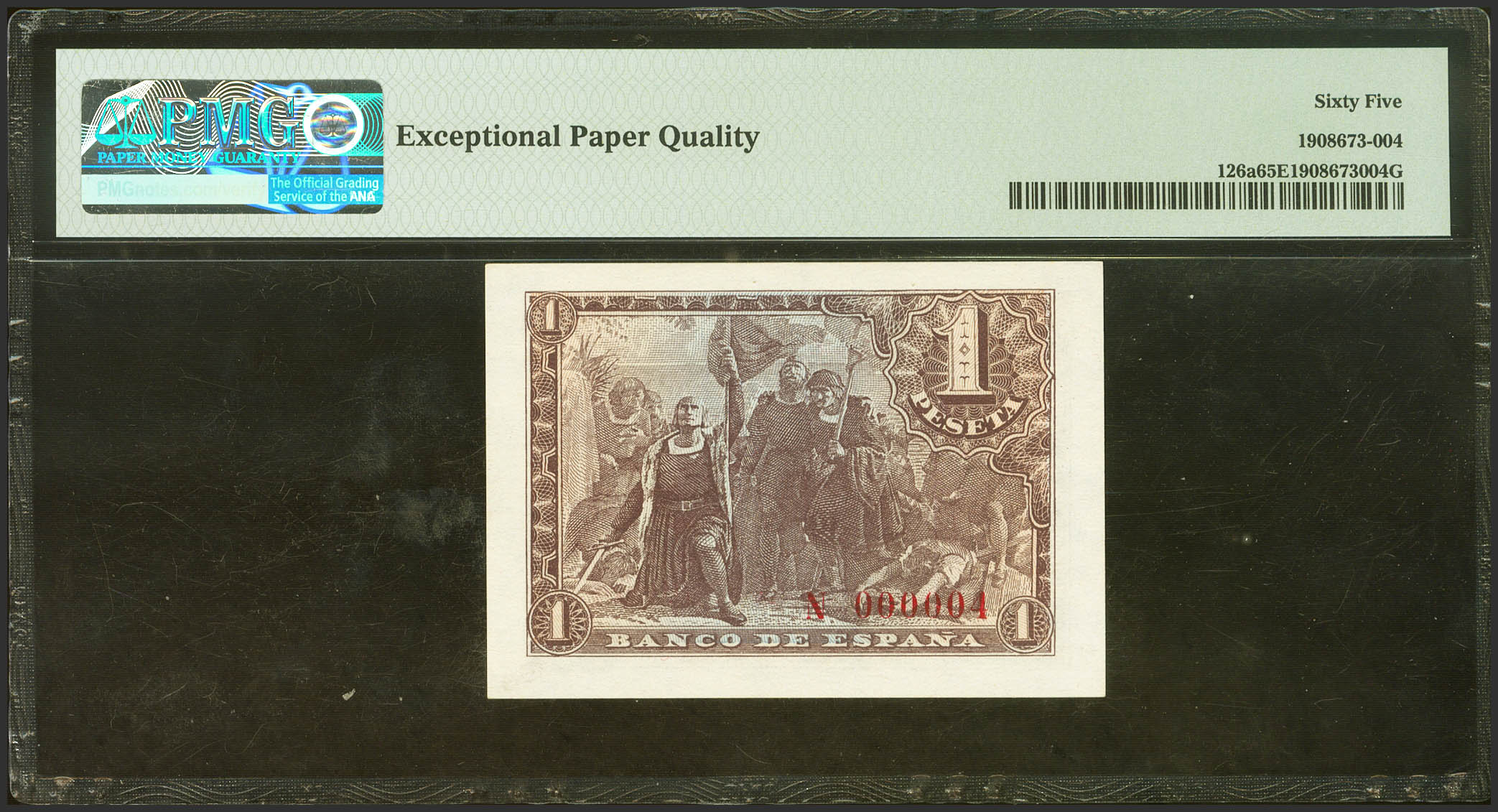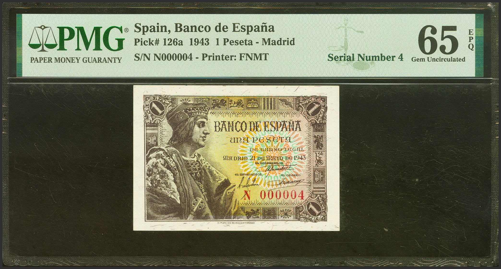 1 Peseta. 21 de Mayo de 1943. Serie N, última serie emitida y numeración bajísima (Nº000004). (Edifil 2023: 447b, Pick: 126a). Rarísima numeración tan baja, especialmente en esta excepcional calidad, apresto original. SC. Encapsulado PMG65EPQ.
