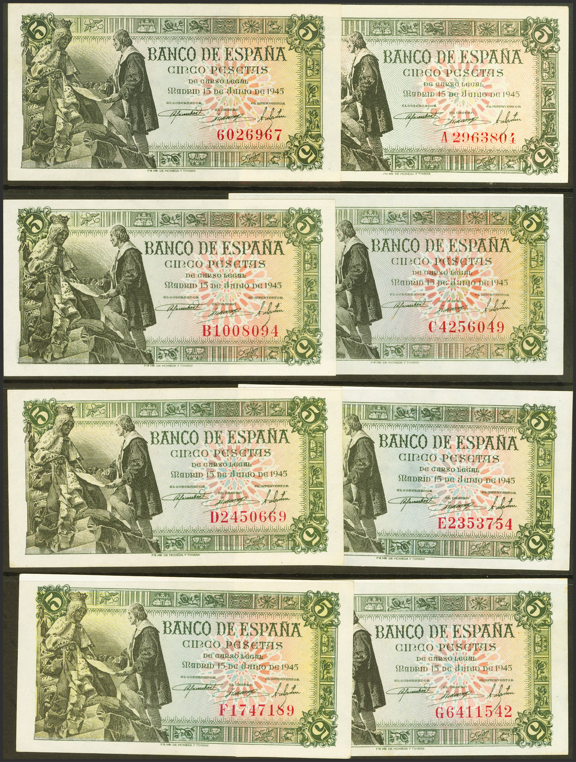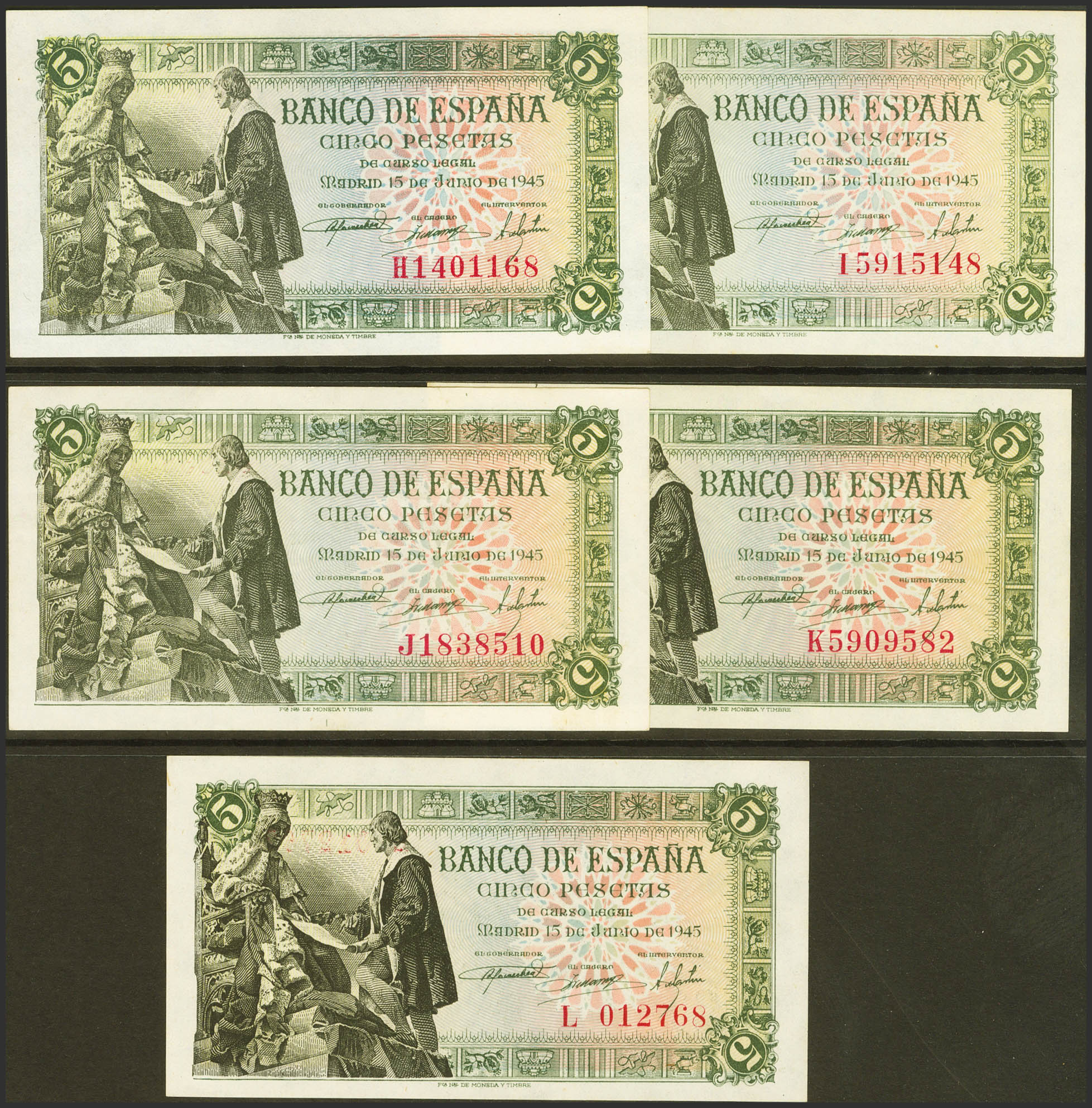 Conjunto de 13 billetes de 5 Pesetas emitidos el 15 de Junio de 1945 y correspondientes a todas las series conocidas que incluyen el sin serie y las series A, B, C, D, E, F, G, H , I , J(MBC+ es el peor conservado), K , L (SC y con apresto) (Edifil 2021: 449, 449a). Muy inusual conjunto que incluye todas las diferentes series. SC/EBC.