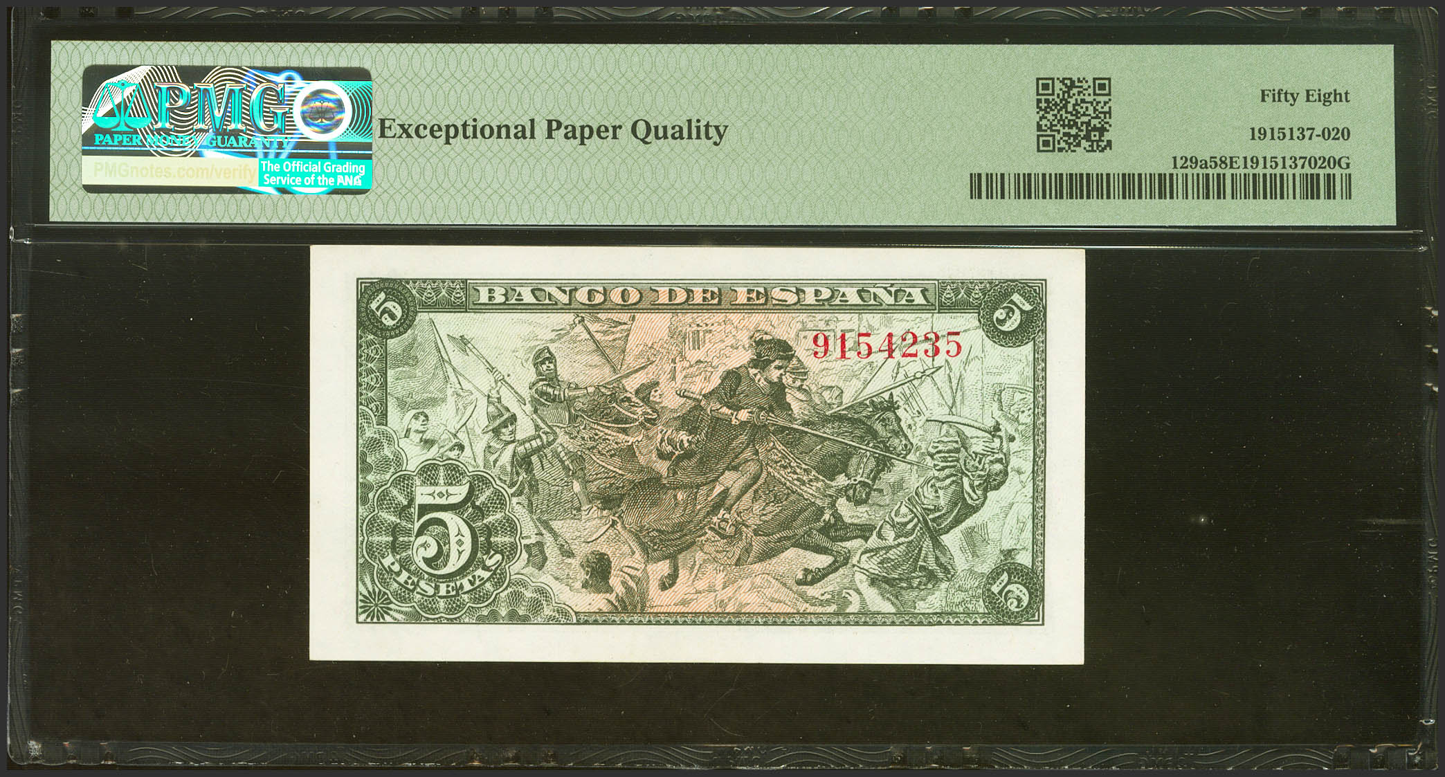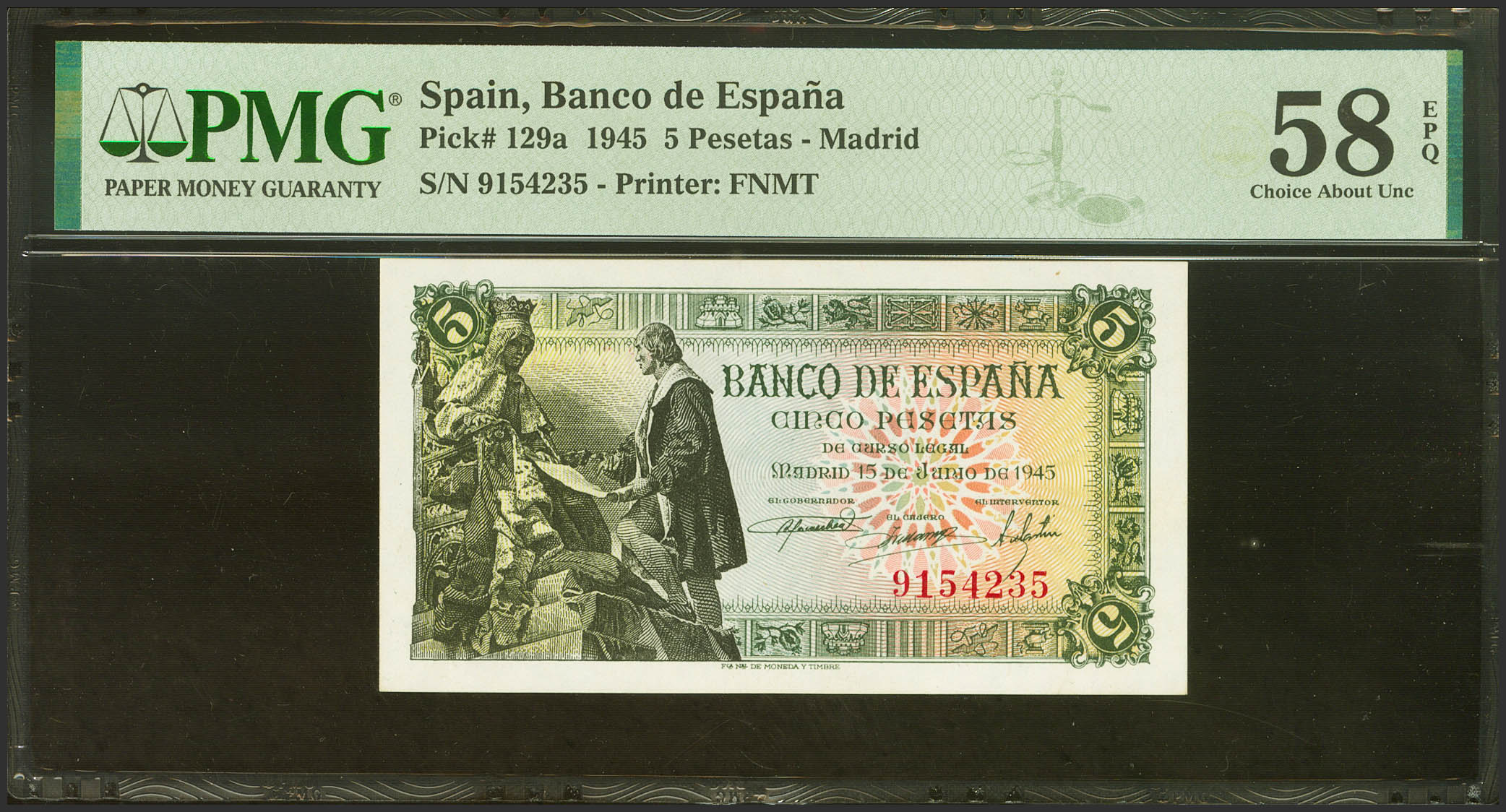 5 Pesetas. 15 de Junio de 1945. Sin serie. (Edifil 2023: 449, Pick: 129a). Apresto original. EBC+++. PMG58EPQ.