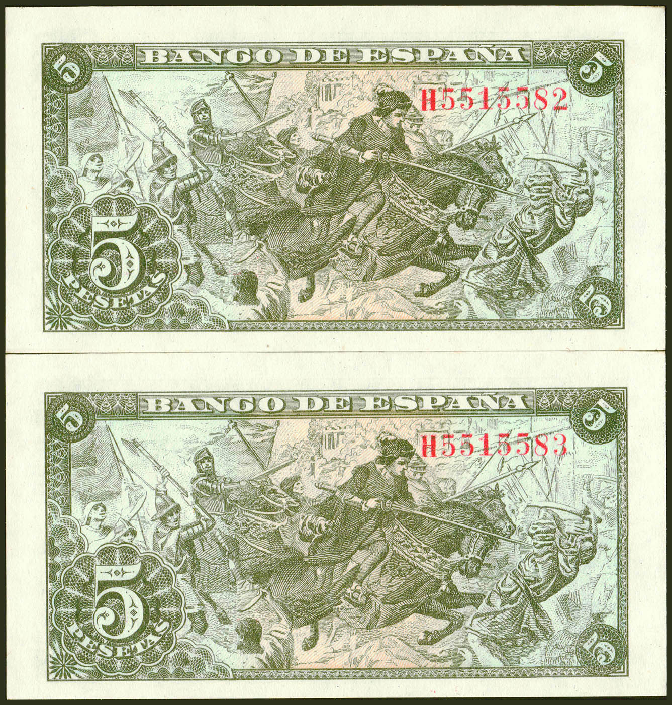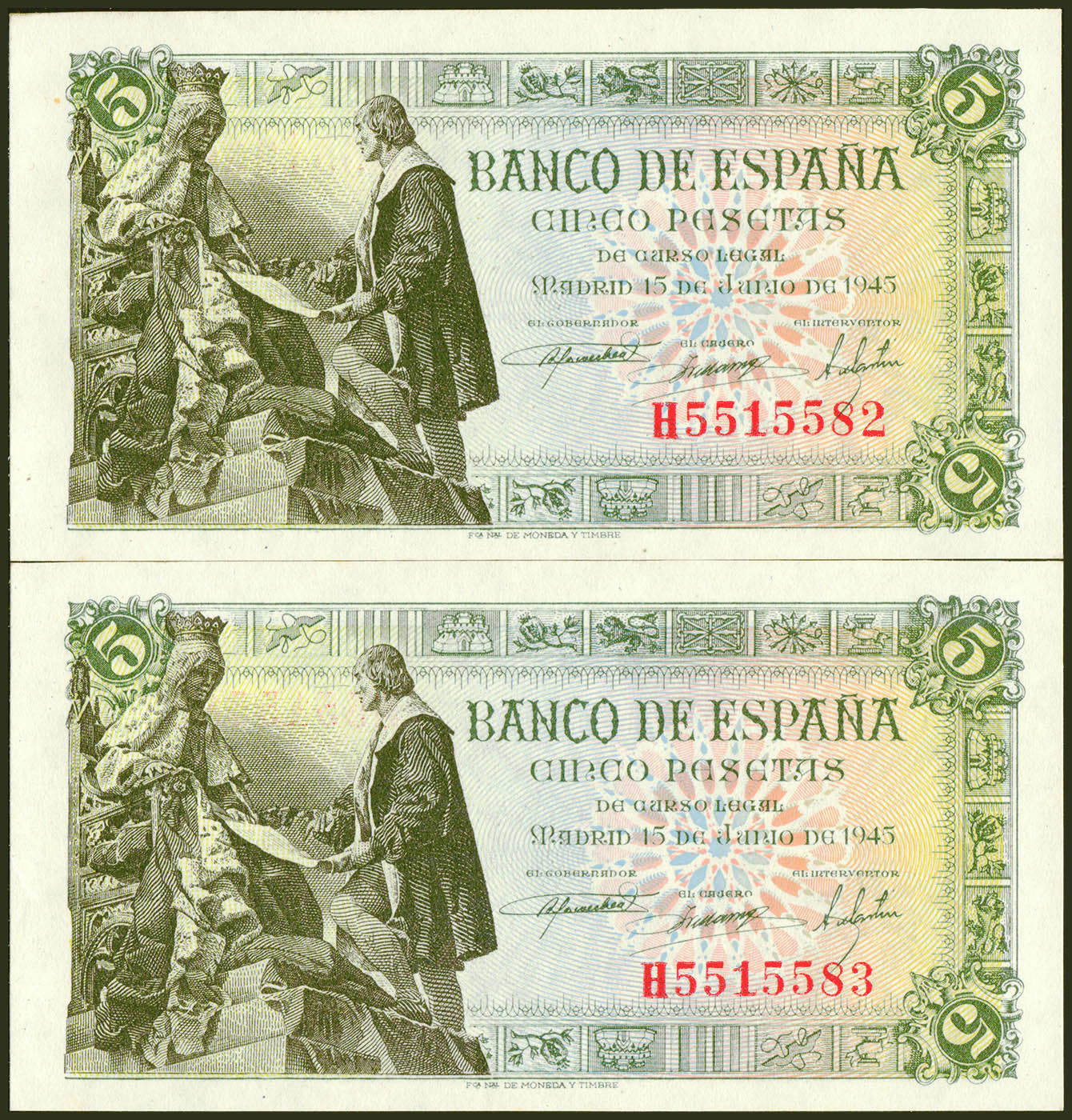 5 Pesetas. 15 de Junio de 1945. Pareja correlativa. Serie H. (Edifil 2021: 449a). Conserva todo su apresto original. SC-.