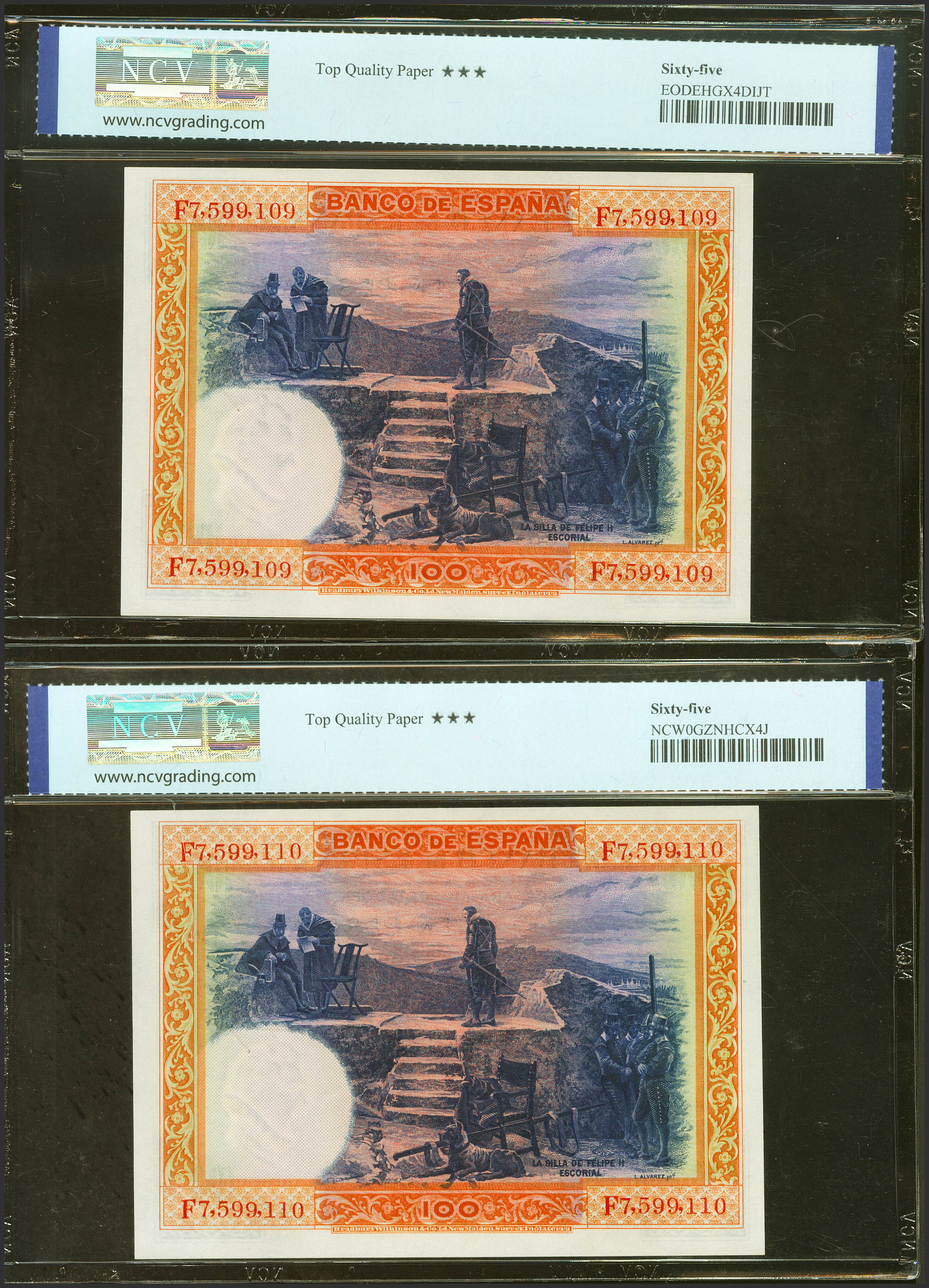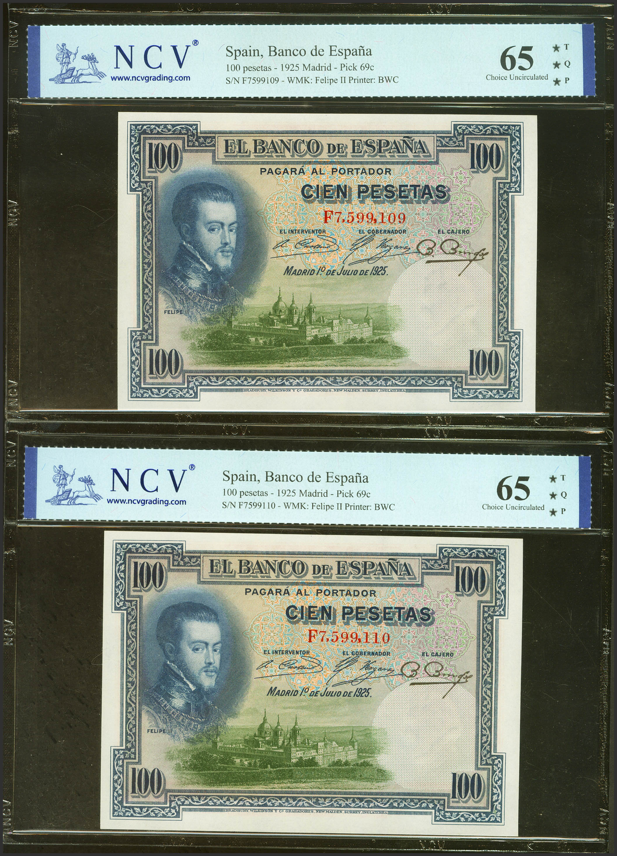 100 Pesetas. 1 de Julio de 1925. Pareja correlativa. Serie F. (Edifil 2023: 350, Pick: 69c). Apresto original. SC. Encapsulados NCV65TQP, ambos.