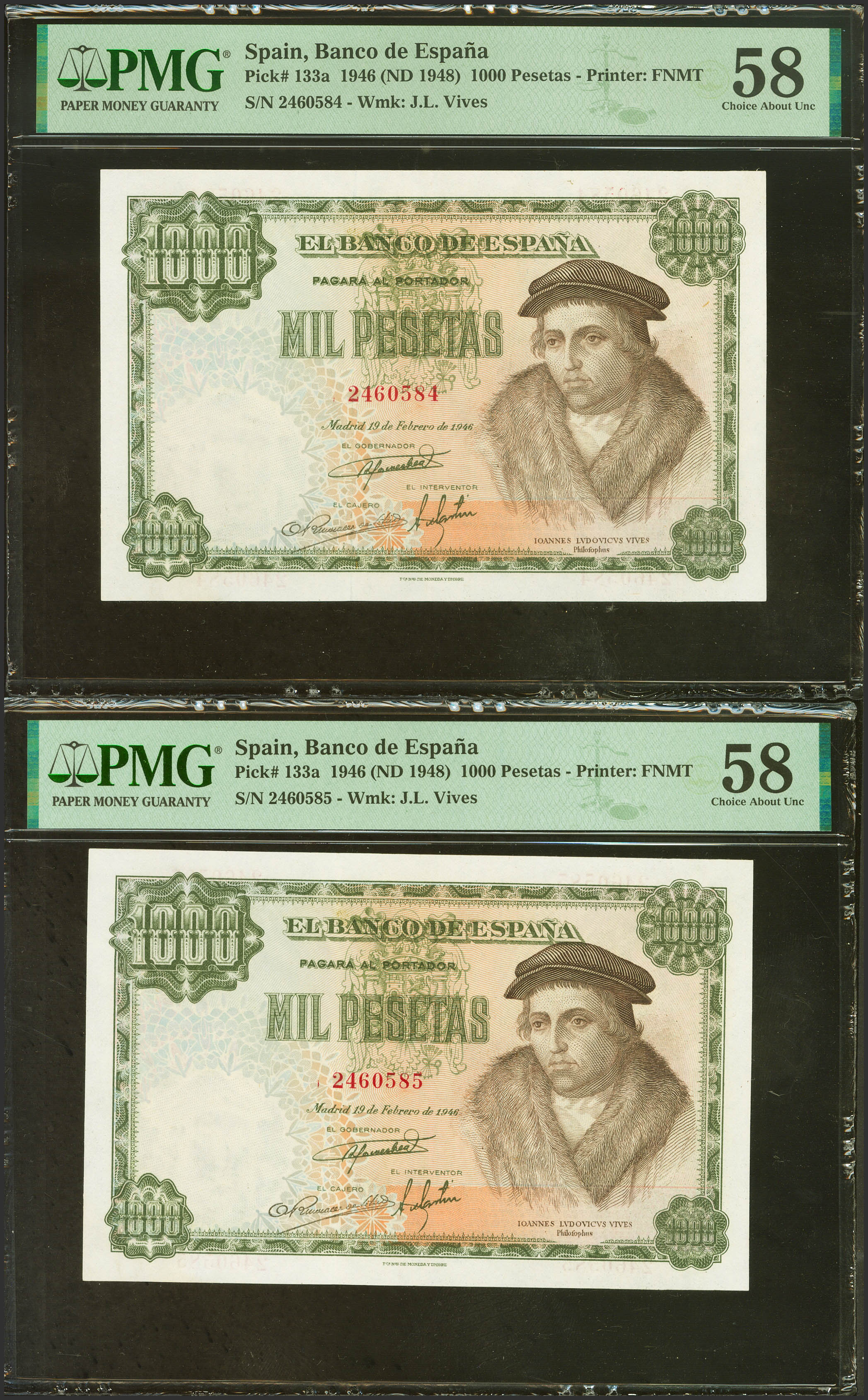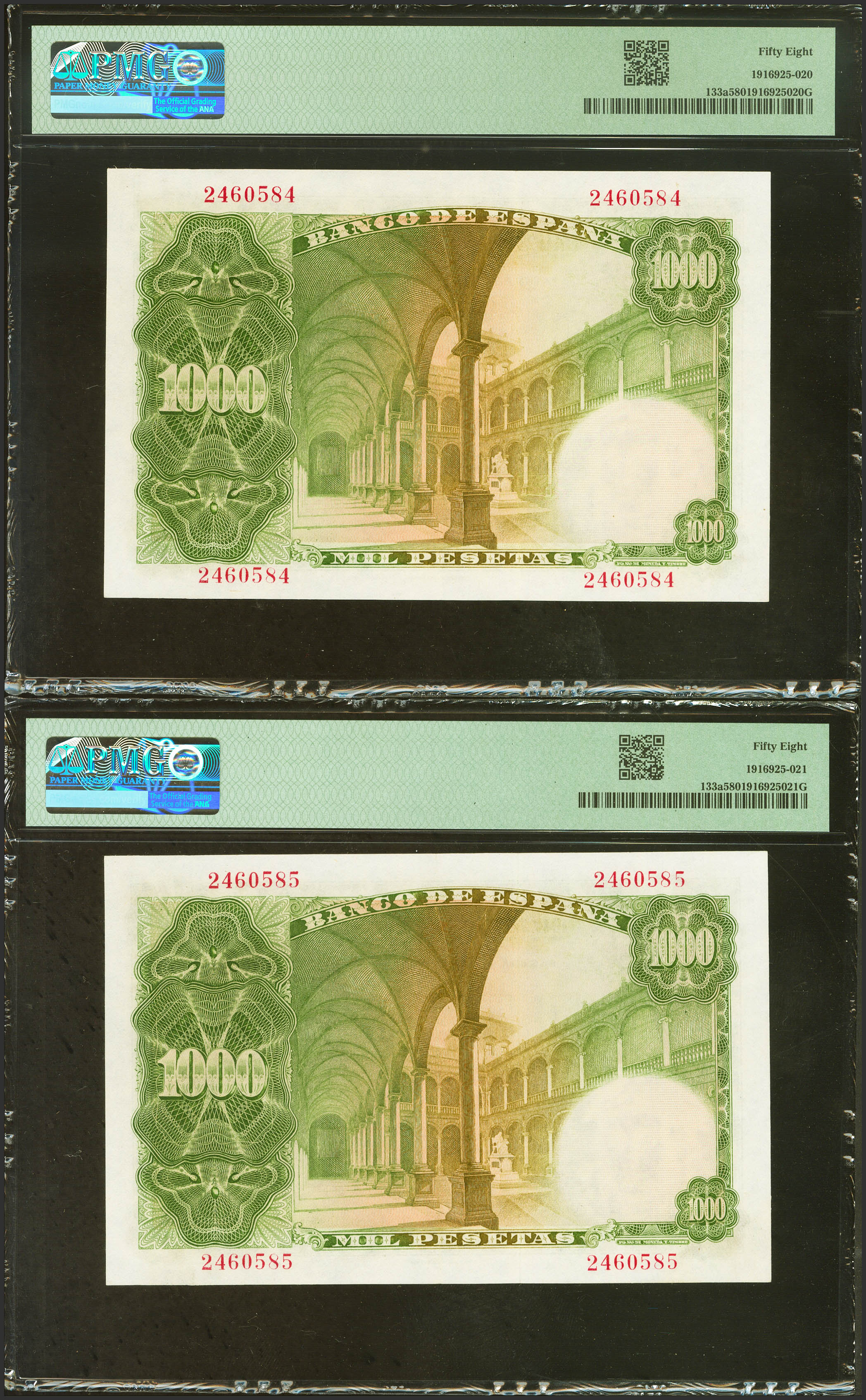 1000 Pesetas. 19 de Febrero de 1946. Pareja correlativa. Sin serie. (Edifil 2023: 453, Pick: 133a). Extraordinaraimente rara. EBC++. Encapsulados PMG58, ambos.