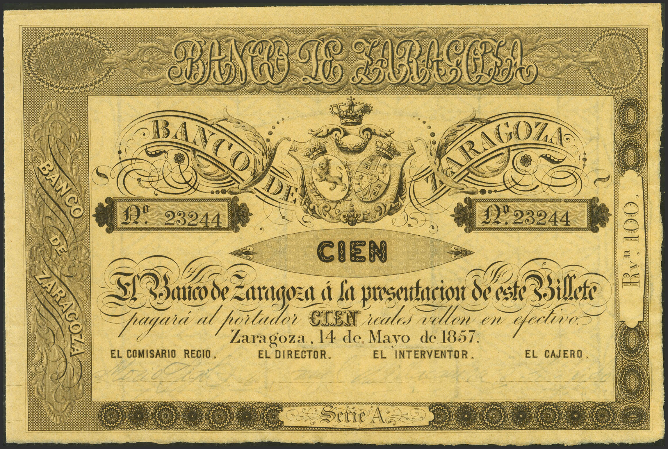 100 Reales. 14 de Mayo de 1857. Banco de Zaragoza. Serie A y sin matriz, con firmas póstumas. (Edifil 2021: 126C). Apresto original. SC-.