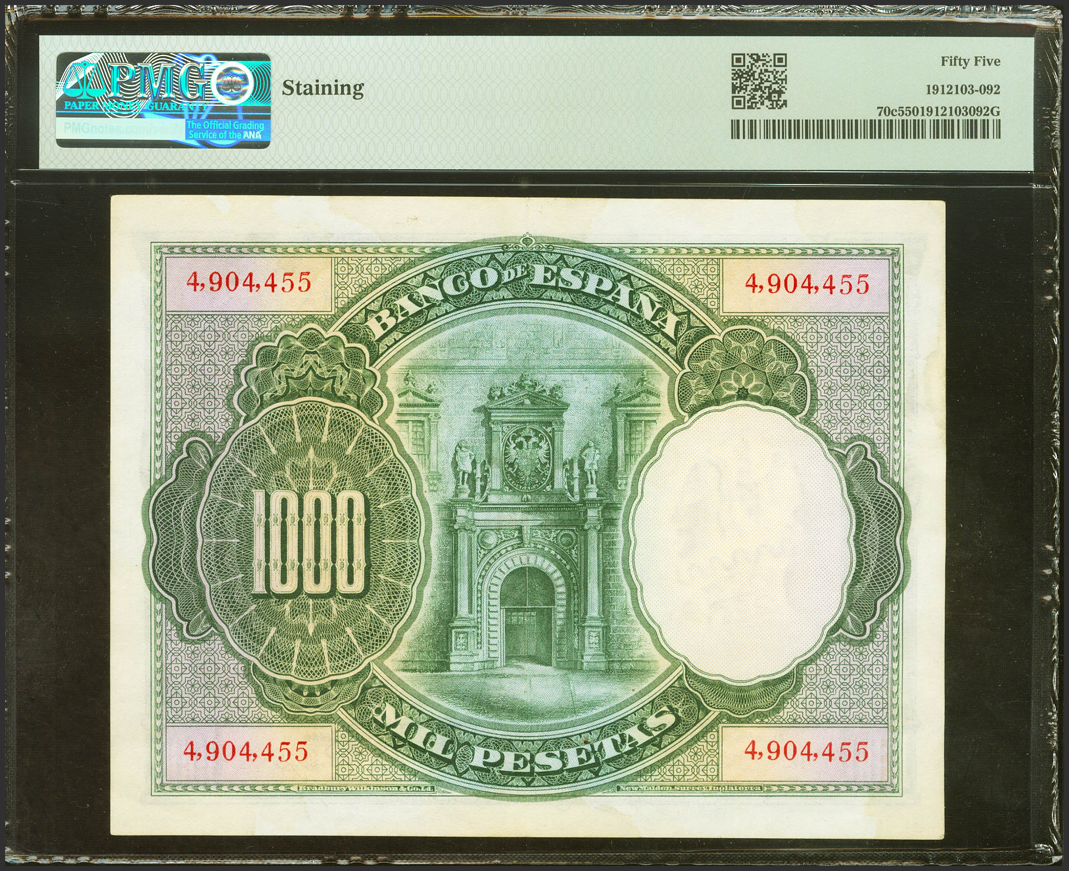 1000 Pesetas. 1 de Julio de 1925. Sin serie y numeración posterior al 3646000. (Edifil 2021: 351, Pick: 70c). Inusual en esta calidad. EBC+. Encapsulado PMG55 (staining).