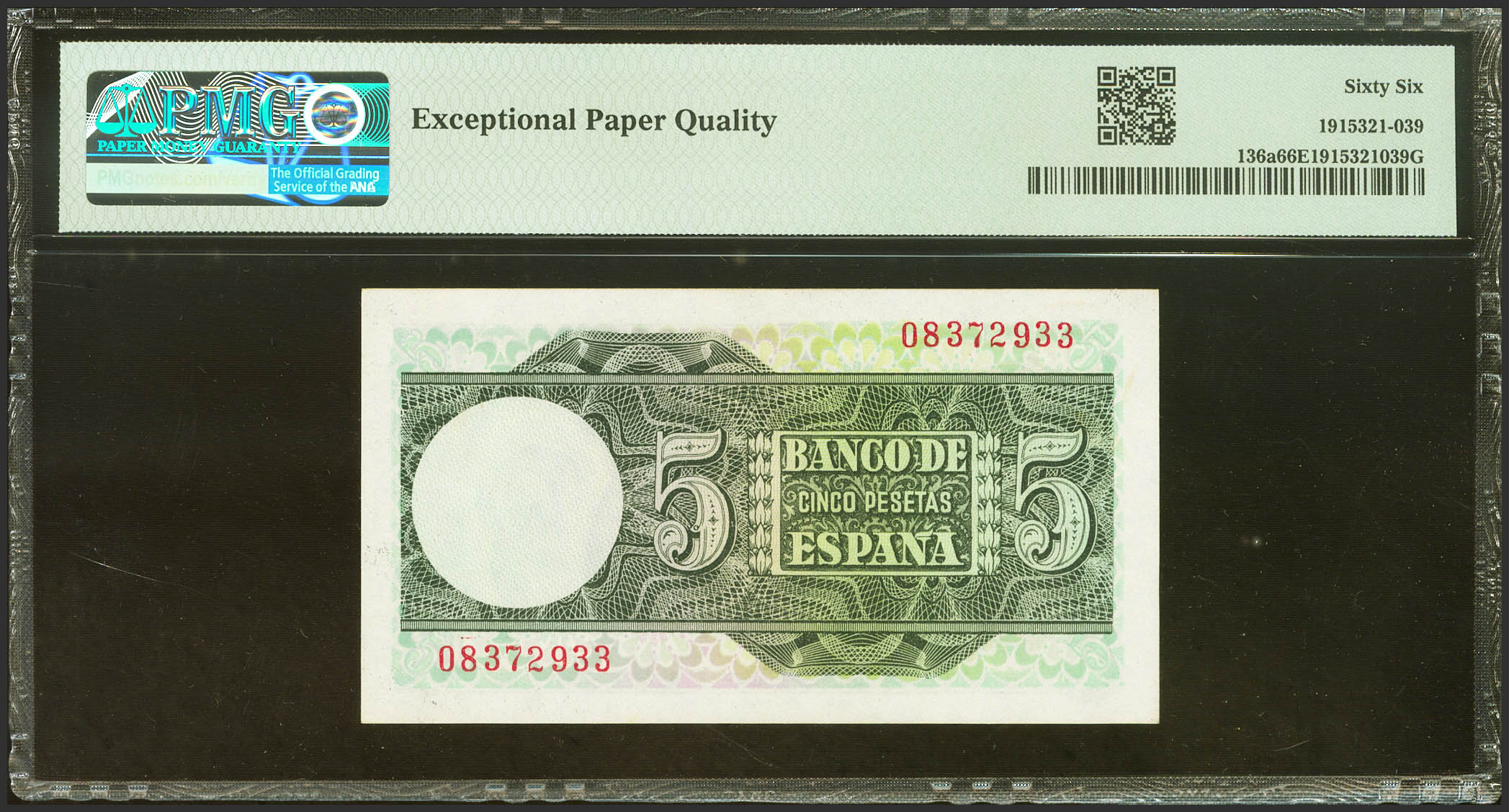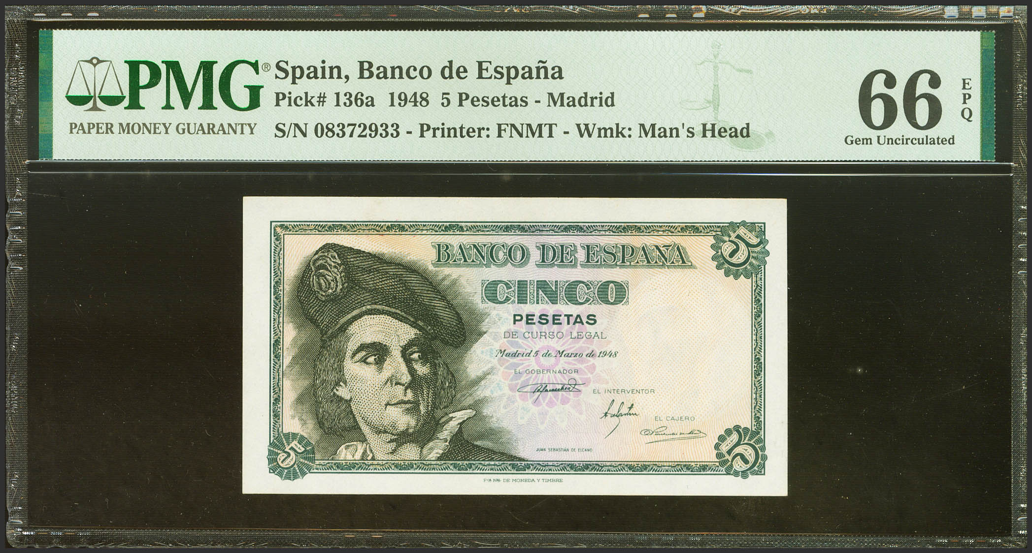 5 Pesetas. 15 de Marzo de 1948. Sin serie. (Edifil 2023: 455, Pick: 136a). Apresto original. SC. Encapsulado PMG66EPQ.