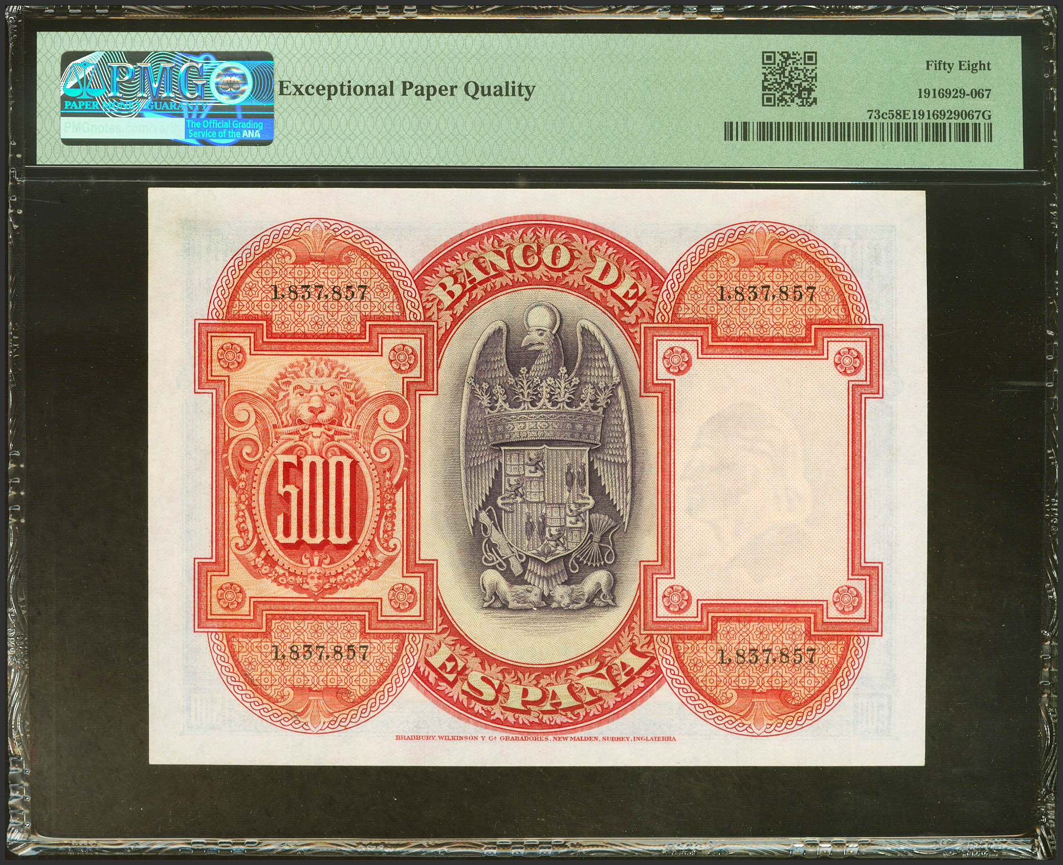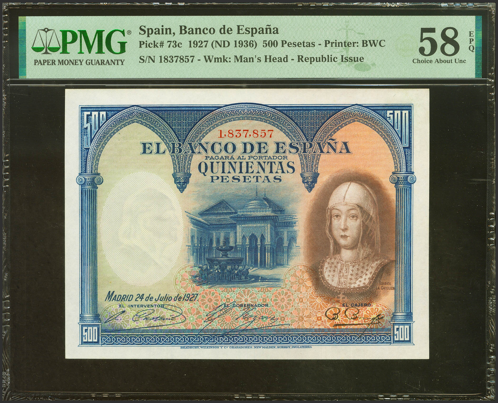 500 Pesetas. 24 de Julio de 1927. Sin serie y numeración posterior 1602000. (Edifil 2023: 352, Pick: 73c). Inusual en esta calidad, apresto original. EBC+++. Encapsulado PMG58EPQ.