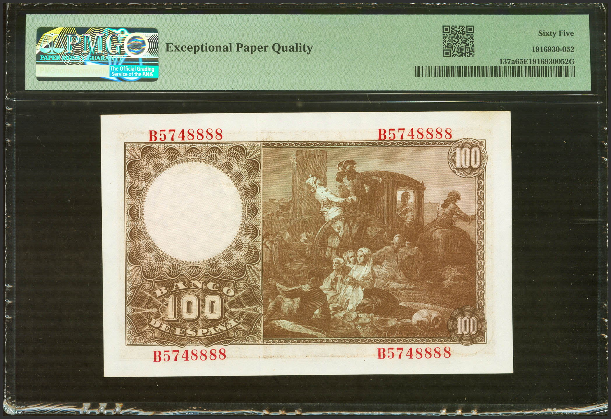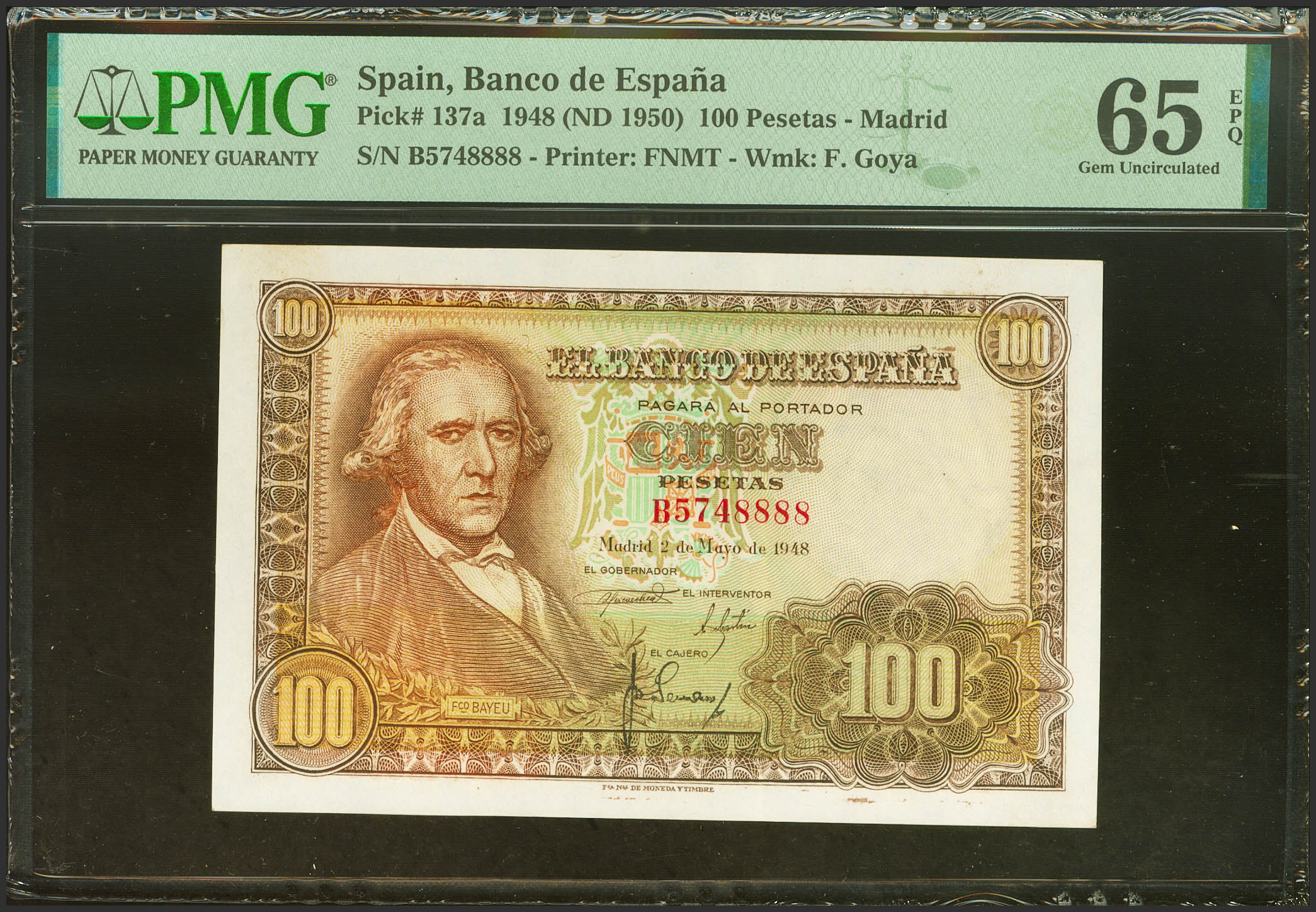 100 Pesetas. 2 de Mayo de 1948. Serie B. (Edifil 2023: 456a, Pick: 137a). Inusual en esta excepcional calidad, apresto original. SC. Encapsulado PMG65EPQ.