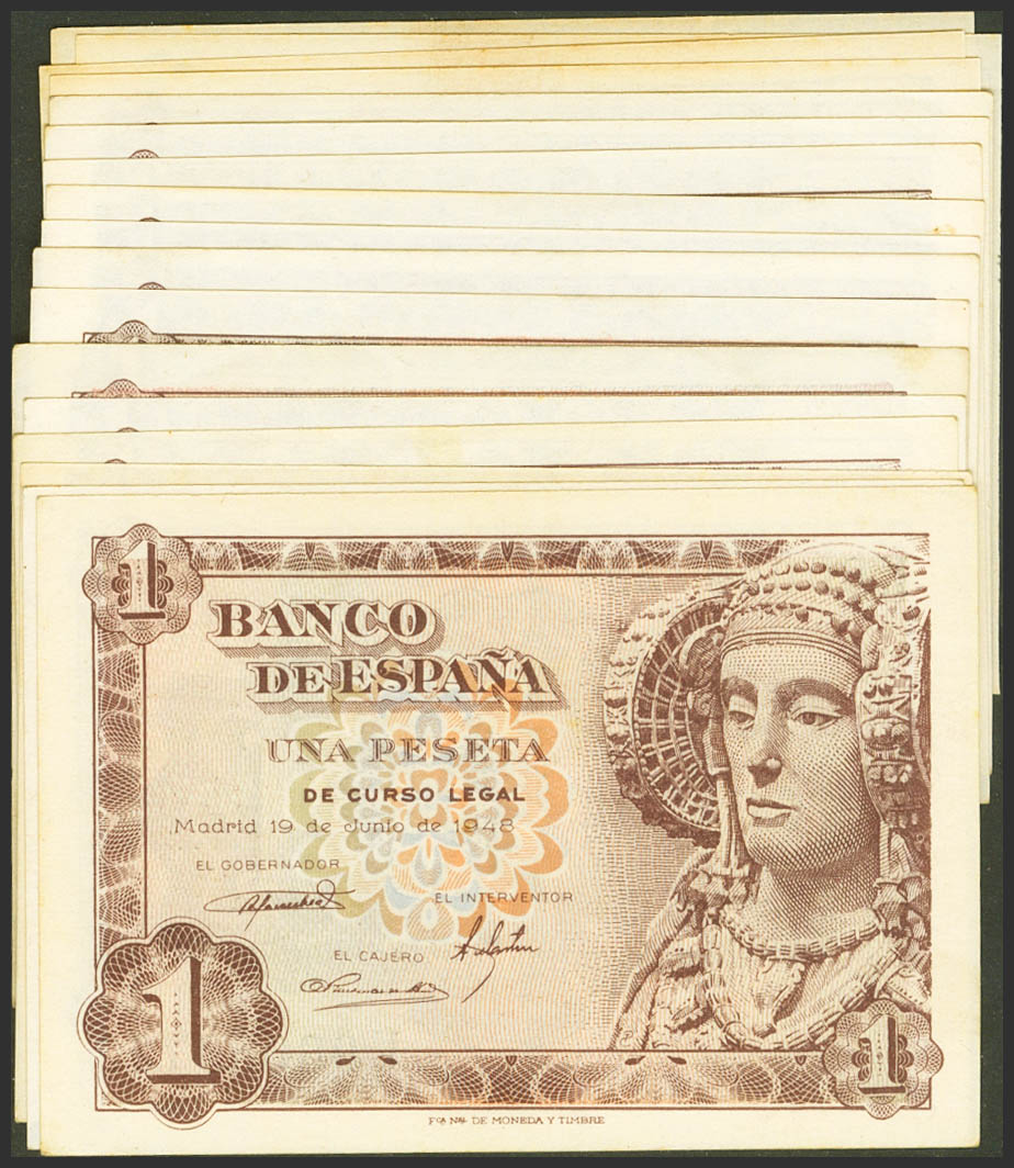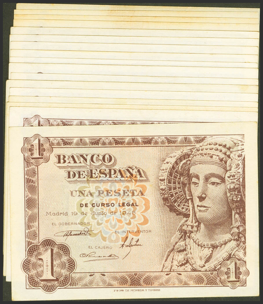 Conjunto de 17 billetes algunos correlativos de 1 Peseta emitidos el 19 de Junio de 1948, y con las series E, G e I, respectivamente (Edifil 2023: 457a), todos con su apresto original. SC/EBC+++.
