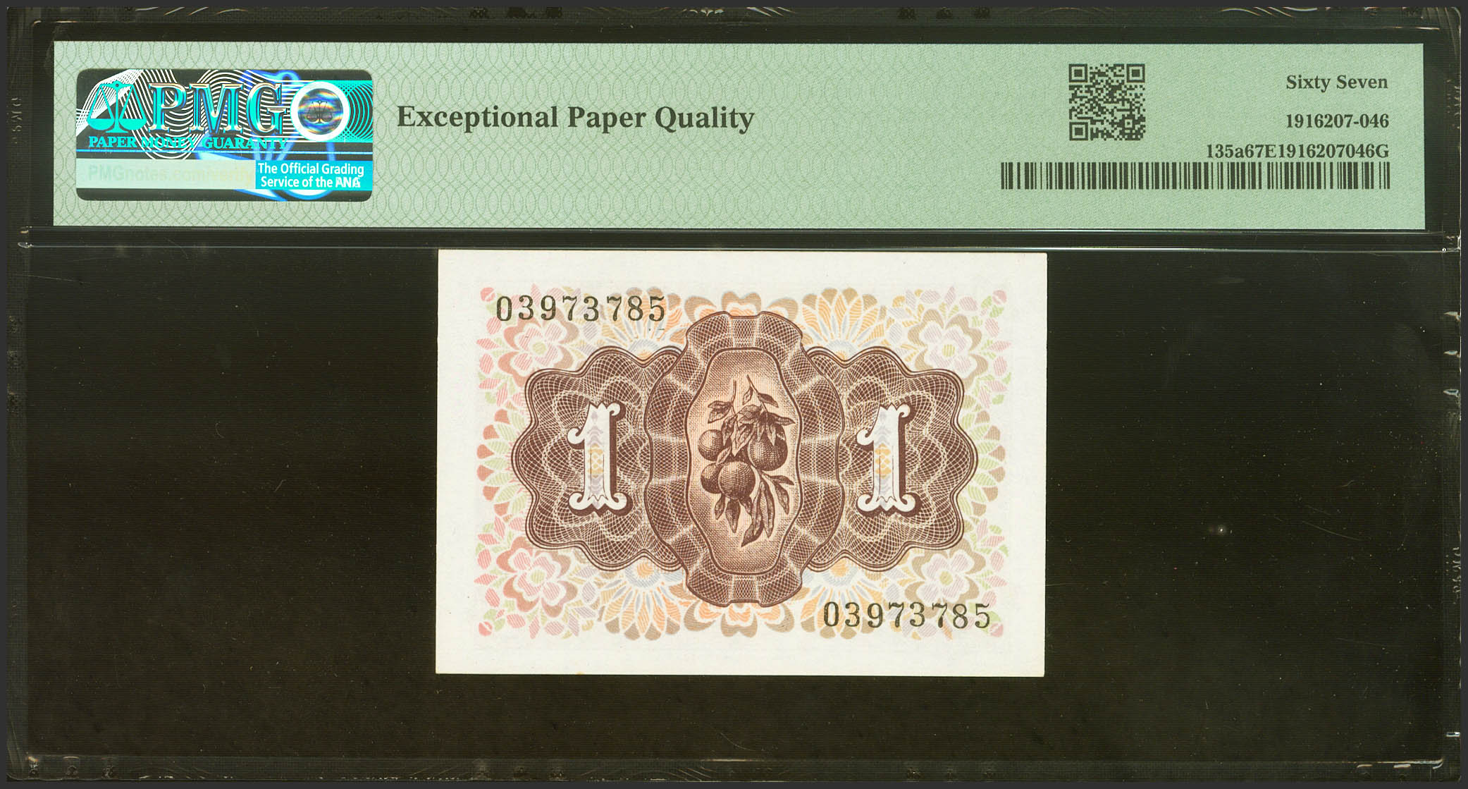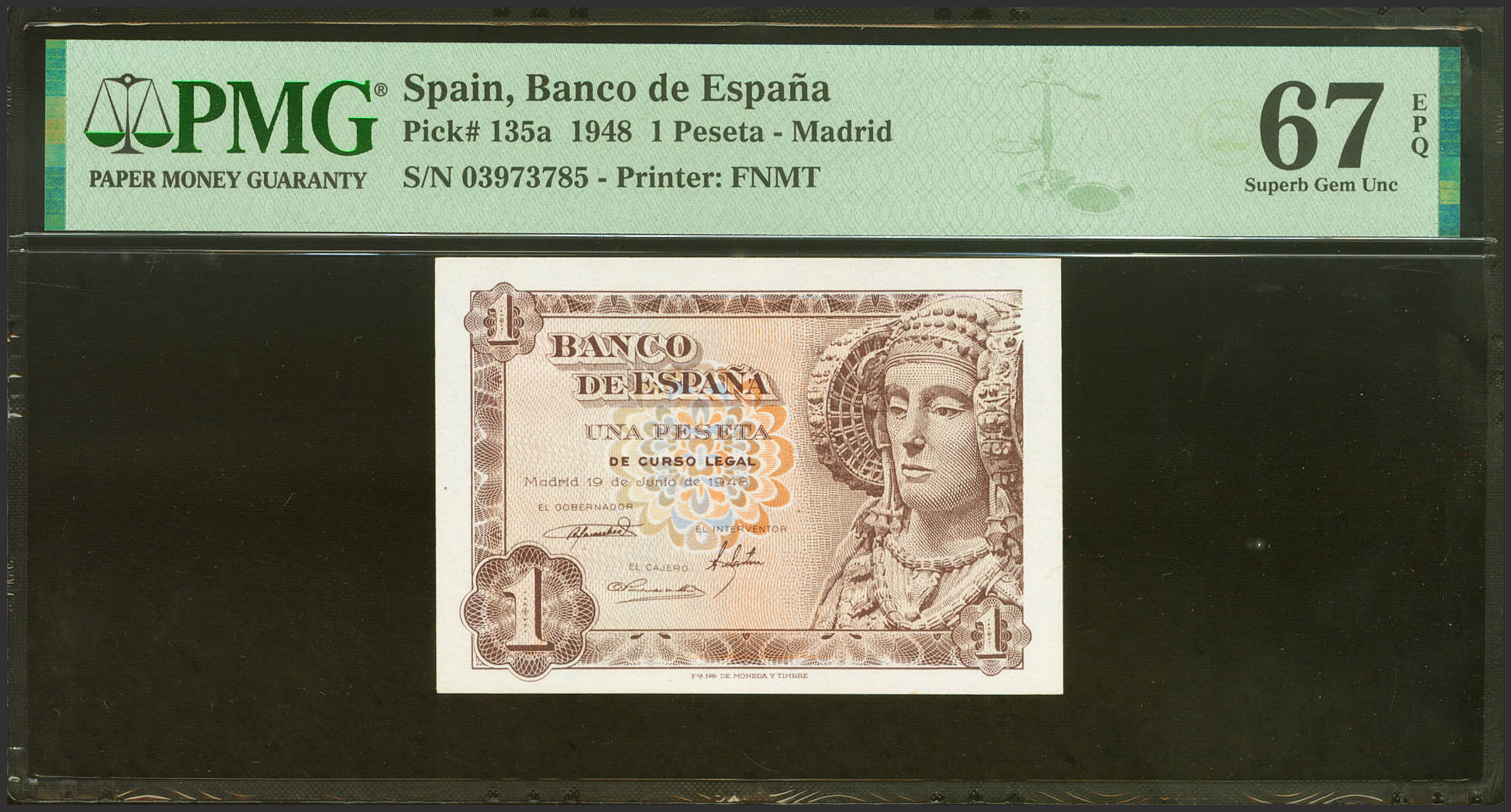 1 Peseta. 19 de Junio de 1948. Sin serie. (Edifil 2023: 457, Pick: 135a). Inusual en esta calidad, apresto original. SC. Encapsulado PMG67EPQ.