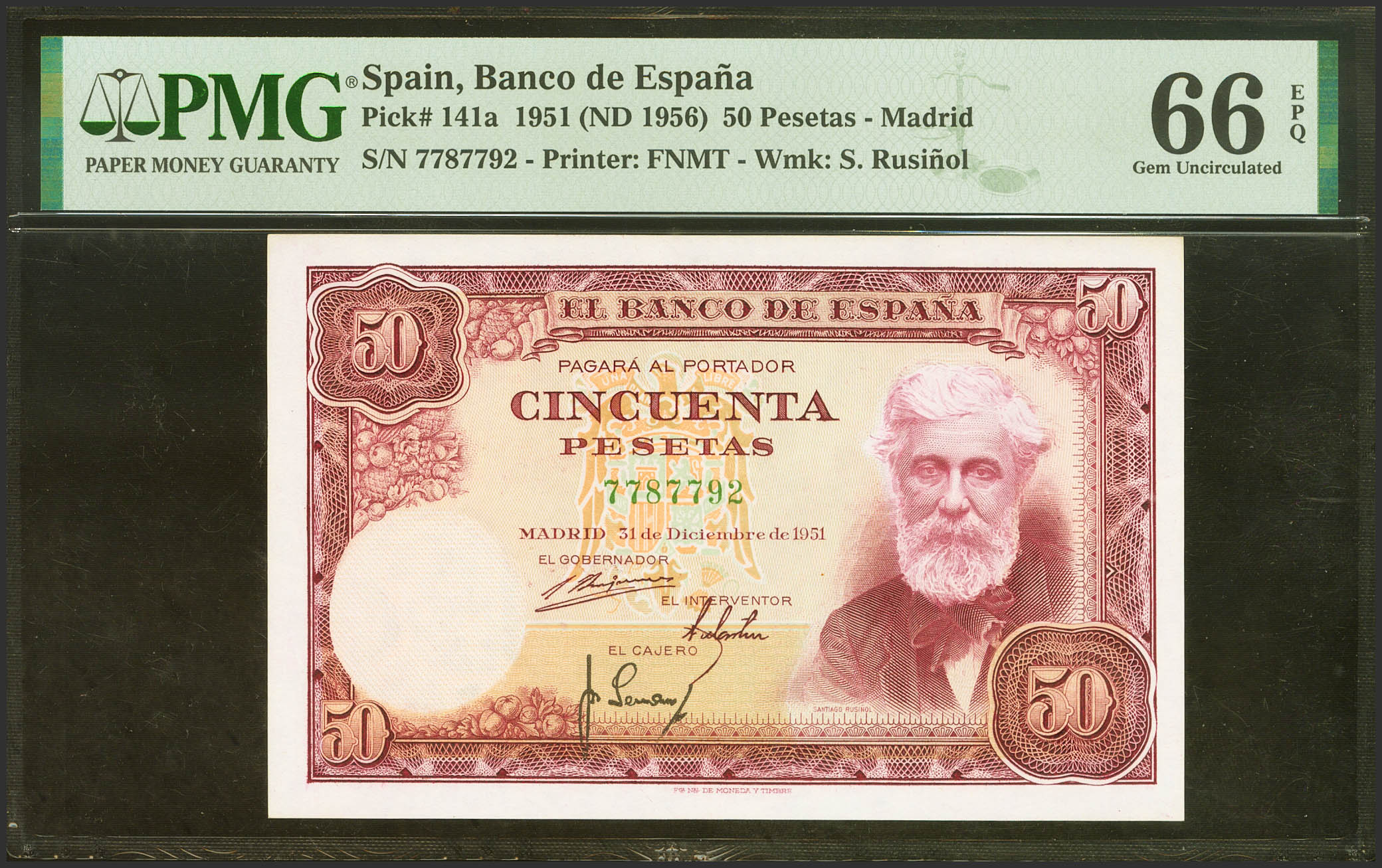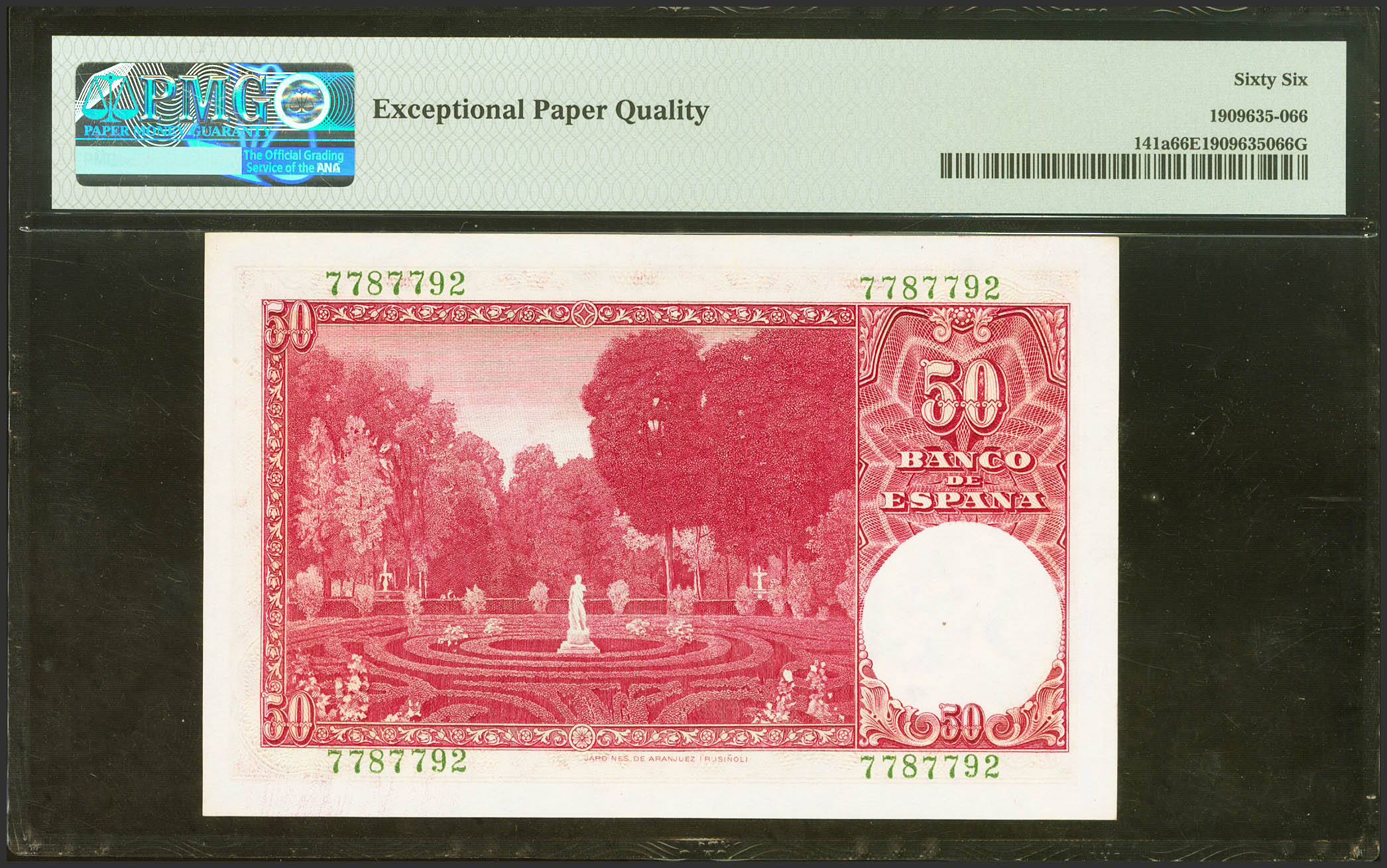 50 Pesetas. 31 de Diciembre de 1951. Sin serie. (Edifil 2023: 462, Pick: 141a). Apresto original. SC. Encapsulado PMG66EPQ.