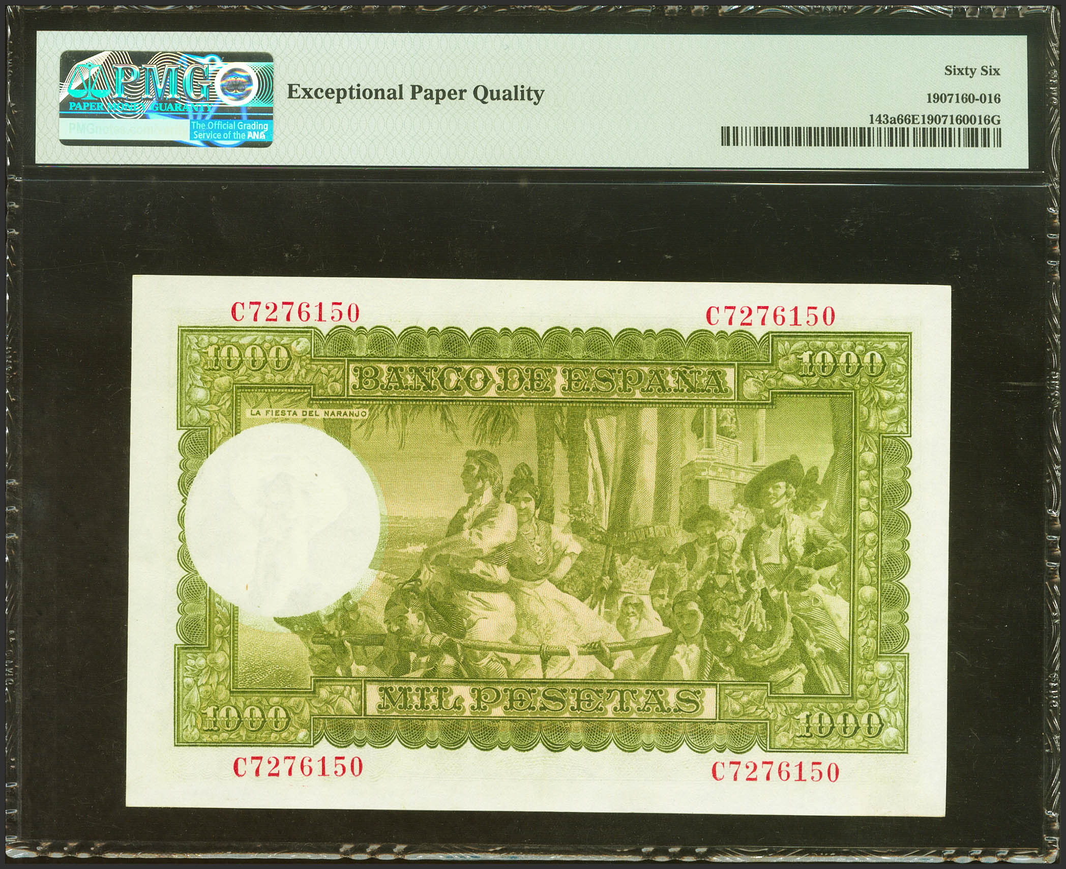 1000 Pesetas. 31 de Diciembre de 1951. Serie C, última serie emitida. (Edifil 2023: 463b, Pick: 143a). Raro en esta excepcional calidad, apresto original. Encapsulado PMG66EPQ.