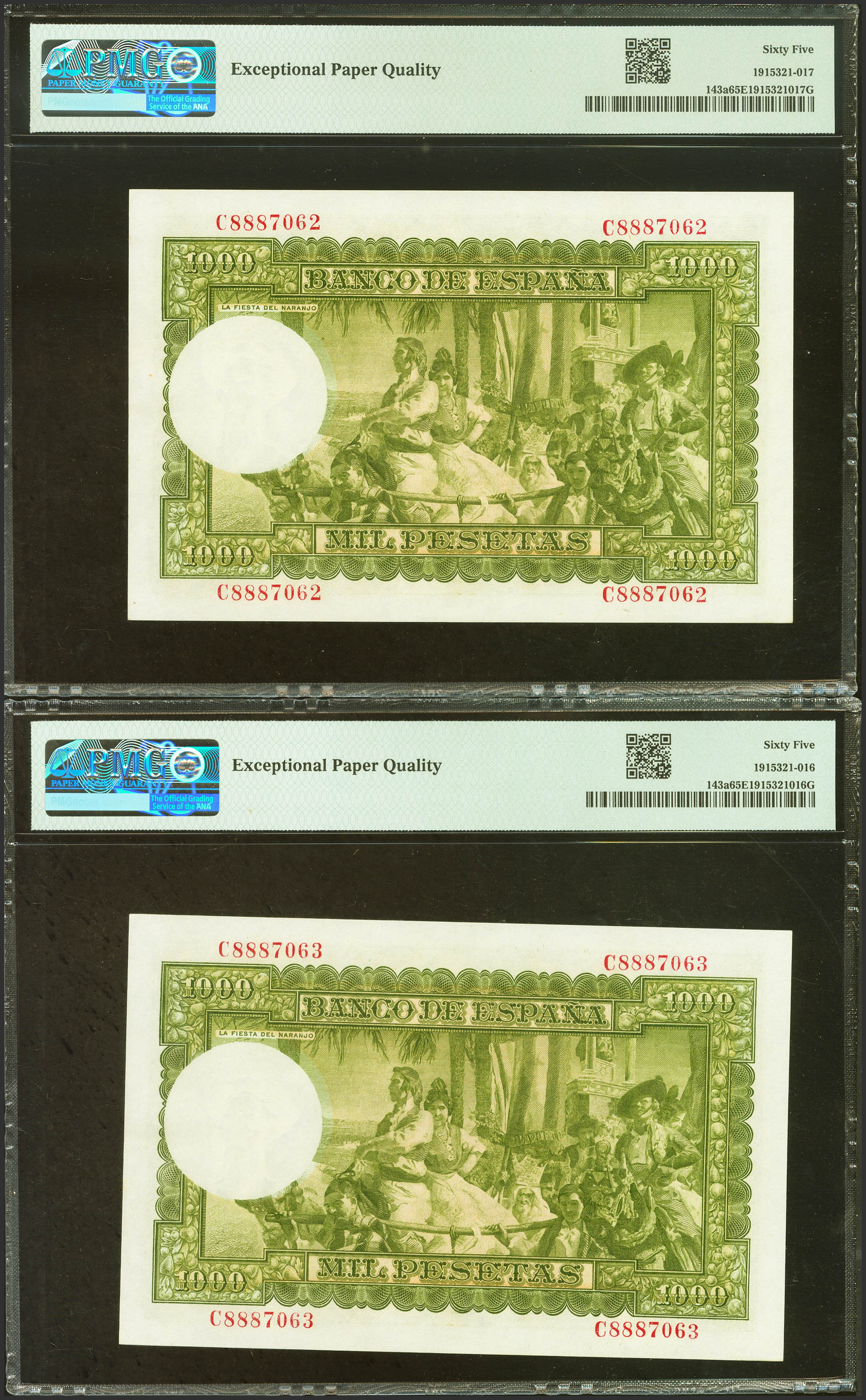 1000 Pesetas. 31 de Diciembre de 1951. Pareja correlativa. Serie C, última serie emitida. (Edifil 2023: 463b, Pick: 143a). Muy rara en esta excepcional calidad, apresto original. SC. Encapsulados PMG65EPQ, ambos.